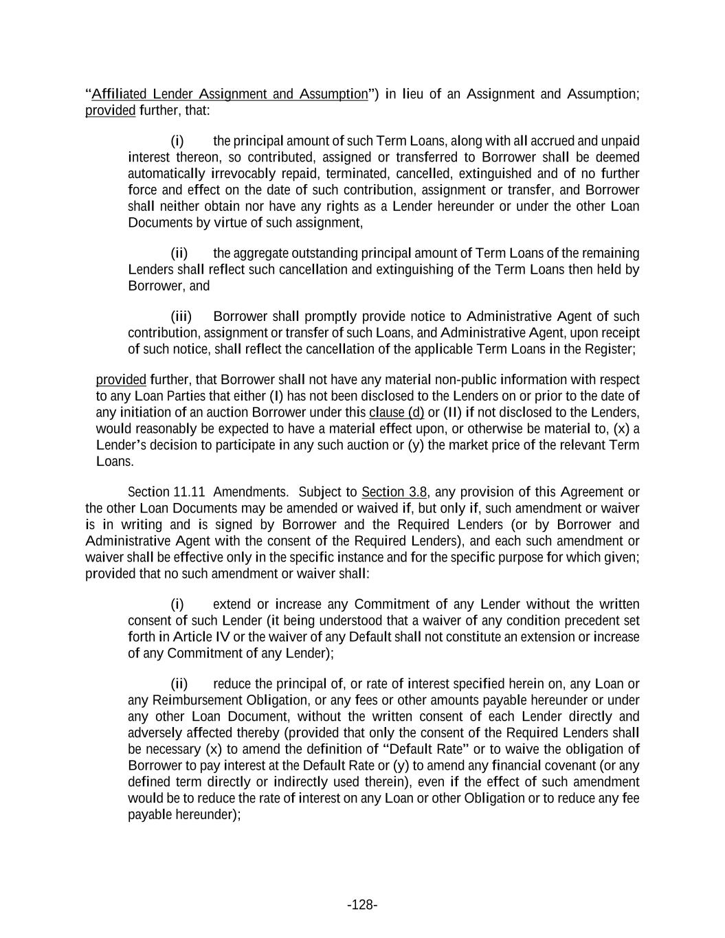 -128- “Affiliated Lender Assignment and Assumption”) in lieu of an Assignment and Assumption; provided further, that: (i) the principal amount of such Term Loans, along with all accrued and unpaid interest thereon, so contributed, assigned or transferred to Borrower shall be deemed automatically irrevocably repaid, terminated, cancelled, extinguished and of no further force and effect on the date of such contribution, assignment or transfer, and Borrower shall neither obtain nor have any rights as a Lender hereunder or under the other Loan Documents by virtue of such assignment, (ii) the aggregate outstanding principal amount of Term Loans of the remaining Lenders shall reflect such cancellation and extinguishing of the Term Loans then held by Borrower, and (iii) Borrower shall promptly provide notice to Administrative Agent of such contribution, assignment or transfer of such Loans, and Administrative Agent, upon receipt of such notice, shall reflect the cancellation of the applicable Term Loans in the Register; provided further, that Borrower shall not have any material non-public information with respect to any Loan Parties that either (I) has not been disclosed to the Lenders on or prior to the date of any initiation of an auction Borrower under this clause (d) or (II) if not disclosed to the Lenders, would reasonably be expected to have a material effect upon, or otherwise be material to, (x) a Lender’s decision to participate in any such auction or (y) the market price of the relevant Term Loans. Section 11.11 Amendments. Subject to Section 3.8, any provision of this Agreement or the other Loan Documents may be amended or waived if, but only if, such amendment or waiver is in writing and is signed by Borrower and the Required Lenders (or by Borrower and Administrative Agent with the consent of the Required Lenders), and each such amendment or waiver shall be effective only in the specific instance and for the specific purpose for which given; provided that no such amendment or waiver shall: (i) extend or increase any Commitment of any Lender without the written consent of such Lender (it being understood that a waiver of any condition precedent set forth in Article IV or the waiver of any Default shall not constitute an extension or increase of any Commitment of any Lender); (ii) reduce the principal of, or rate of interest specified herein on, any Loan or any Reimbursement Obligation, or any fees or other amounts payable hereunder or under any other Loan Document, without the written consent of each Lender directly and adversely affected thereby (provided that only the consent of the Required Lenders shall be necessary (x) to amend the definition of “Default Rate” or to waive the obligation of Borrower to pay interest at the Default Rate or (y) to amend any financial covenant (or any defined term directly or indirectly used therein), even if the effect of such amendment would be to reduce the rate of interest on any Loan or other Obligation or to reduce any fee payable hereunder);