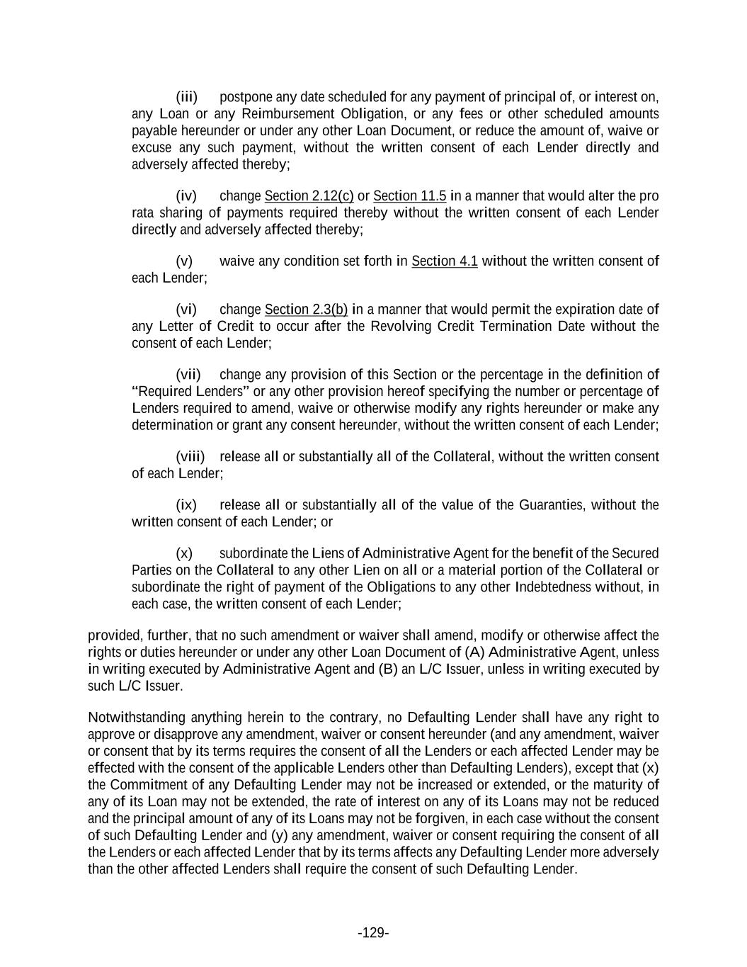 -129- (iii) postpone any date scheduled for any payment of principal of, or interest on, any Loan or any Reimbursement Obligation, or any fees or other scheduled amounts payable hereunder or under any other Loan Document, or reduce the amount of, waive or excuse any such payment, without the written consent of each Lender directly and adversely affected thereby; (iv) change Section 2.12(c) or Section 11.5 in a manner that would alter the pro rata sharing of payments required thereby without the written consent of each Lender directly and adversely affected thereby; (v) waive any condition set forth in Section 4.1 without the written consent of each Lender; (vi) change Section 2.3(b) in a manner that would permit the expiration date of any Letter of Credit to occur after the Revolving Credit Termination Date without the consent of each Lender; (vii) change any provision of this Section or the percentage in the definition of “Required Lenders” or any other provision hereof specifying the number or percentage of Lenders required to amend, waive or otherwise modify any rights hereunder or make any determination or grant any consent hereunder, without the written consent of each Lender; (viii) release all or substantially all of the Collateral, without the written consent of each Lender; (ix) release all or substantially all of the value of the Guaranties, without the written consent of each Lender; or (x) subordinate the Liens of Administrative Agent for the benefit of the Secured Parties on the Collateral to any other Lien on all or a material portion of the Collateral or subordinate the right of payment of the Obligations to any other Indebtedness without, in each case, the written consent of each Lender; provided, further, that no such amendment or waiver shall amend, modify or otherwise affect the rights or duties hereunder or under any other Loan Document of (A) Administrative Agent, unless in writing executed by Administrative Agent and (B) an L/C Issuer, unless in writing executed by such L/C Issuer. Notwithstanding anything herein to the contrary, no Defaulting Lender shall have any right to approve or disapprove any amendment, waiver or consent hereunder (and any amendment, waiver or consent that by its terms requires the consent of all the Lenders or each affected Lender may be effected with the consent of the applicable Lenders other than Defaulting Lenders), except that (x) the Commitment of any Defaulting Lender may not be increased or extended, or the maturity of any of its Loan may not be extended, the rate of interest on any of its Loans may not be reduced and the principal amount of any of its Loans may not be forgiven, in each case without the consent of such Defaulting Lender and (y) any amendment, waiver or consent requiring the consent of all the Lenders or each affected Lender that by its terms affects any Defaulting Lender more adversely than the other affected Lenders shall require the consent of such Defaulting Lender.