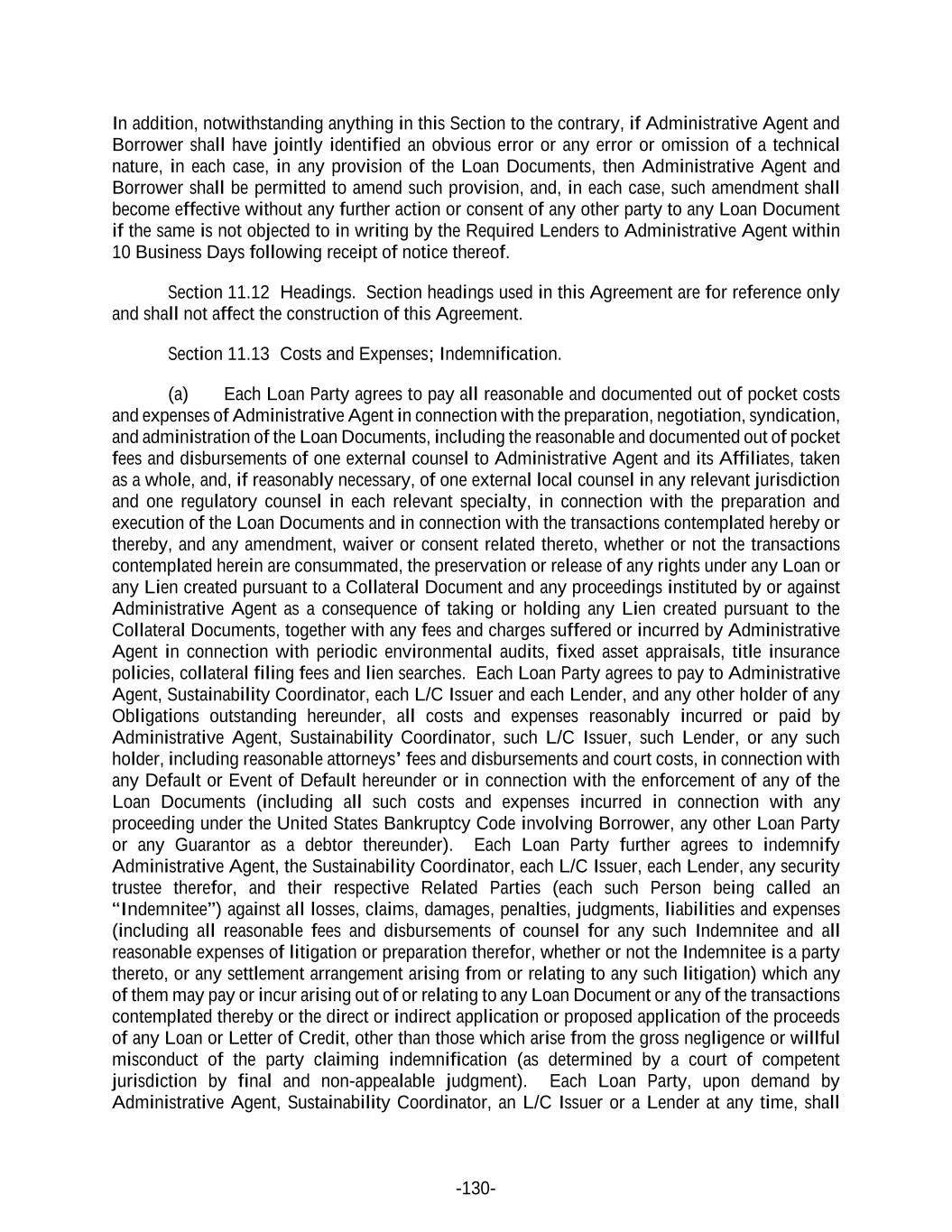 -130- In addition, notwithstanding anything in this Section to the contrary, if Administrative Agent and Borrower shall have jointly identified an obvious error or any error or omission of a technical nature, in each case, in any provision of the Loan Documents, then Administrative Agent and Borrower shall be permitted to amend such provision, and, in each case, such amendment shall become effective without any further action or consent of any other party to any Loan Document if the same is not objected to in writing by the Required Lenders to Administrative Agent within 10 Business Days following receipt of notice thereof. Section 11.12 Headings. Section headings used in this Agreement are for reference only and shall not affect the construction of this Agreement. Section 11.13 Costs and Expenses; Indemnification. (a) Each Loan Party agrees to pay all reasonable and documented out of pocket costs and expenses of Administrative Agent in connection with the preparation, negotiation, syndication, and administration of the Loan Documents, including the reasonable and documented out of pocket fees and disbursements of one external counsel to Administrative Agent and its Affiliates, taken as a whole, and, if reasonably necessary, of one external local counsel in any relevant jurisdiction and one regulatory counsel in each relevant specialty, in connection with the preparation and execution of the Loan Documents and in connection with the transactions contemplated hereby or thereby, and any amendment, waiver or consent related thereto, whether or not the transactions contemplated herein are consummated, the preservation or release of any rights under any Loan or any Lien created pursuant to a Collateral Document and any proceedings instituted by or against Administrative Agent as a consequence of taking or holding any Lien created pursuant to the Collateral Documents, together with any fees and charges suffered or incurred by Administrative Agent in connection with periodic environmental audits, fixed asset appraisals, title insurance policies, collateral filing fees and lien searches. Each Loan Party agrees to pay to Administrative Agent, Sustainability Coordinator, each L/C Issuer and each Lender, and any other holder of any Obligations outstanding hereunder, all costs and expenses reasonably incurred or paid by Administrative Agent, Sustainability Coordinator, such L/C Issuer, such Lender, or any such holder, including reasonable attorneys’ fees and disbursements and court costs, in connection with any Default or Event of Default hereunder or in connection with the enforcement of any of the Loan Documents (including all such costs and expenses incurred in connection with any proceeding under the United States Bankruptcy Code involving Borrower, any other Loan Party or any Guarantor as a debtor thereunder). Each Loan Party further agrees to indemnify Administrative Agent, the Sustainability Coordinator, each L/C Issuer, each Lender, any security trustee therefor, and their respective Related Parties (each such Person being called an “Indemnitee”) against all losses, claims, damages, penalties, judgments, liabilities and expenses (including all reasonable fees and disbursements of counsel for any such Indemnitee and all reasonable expenses of litigation or preparation therefor, whether or not the Indemnitee is a party thereto, or any settlement arrangement arising from or relating to any such litigation) which any of them may pay or incur arising out of or relating to any Loan Document or any of the transactions contemplated thereby or the direct or indirect application or proposed application of the proceeds of any Loan or Letter of Credit, other than those which arise from the gross negligence or willful misconduct of the party claiming indemnification (as determined by a court of competent jurisdiction by final and non-appealable judgment). Each Loan Party, upon demand by Administrative Agent, Sustainability Coordinator, an L/C Issuer or a Lender at any time, shall