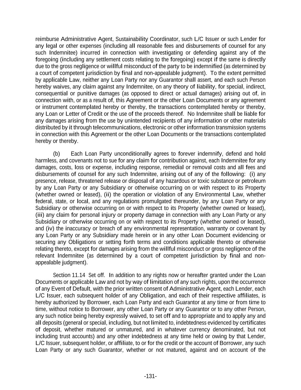 -131- reimburse Administrative Agent, Sustainability Coordinator, such L/C Issuer or such Lender for any legal or other expenses (including all reasonable fees and disbursements of counsel for any such Indemnitee) incurred in connection with investigating or defending against any of the foregoing (including any settlement costs relating to the foregoing) except if the same is directly due to the gross negligence or willful misconduct of the party to be indemnified (as determined by a court of competent jurisdiction by final and non-appealable judgment). To the extent permitted by applicable Law, neither any Loan Party nor any Guarantor shall assert, and each such Person hereby waives, any claim against any Indemnitee, on any theory of liability, for special, indirect, consequential or punitive damages (as opposed to direct or actual damages) arising out of, in connection with, or as a result of, this Agreement or the other Loan Documents or any agreement or instrument contemplated hereby or thereby, the transactions contemplated hereby or thereby, any Loan or Letter of Credit or the use of the proceeds thereof. No Indemnitee shall be liable for any damages arising from the use by unintended recipients of any information or other materials distributed by it through telecommunications, electronic or other information transmission systems in connection with this Agreement or the other Loan Documents or the transactions contemplated hereby or thereby. (b) Each Loan Party unconditionally agrees to forever indemnify, defend and hold harmless, and covenants not to sue for any claim for contribution against, each Indemnitee for any damages, costs, loss or expense, including response, remedial or removal costs and all fees and disbursements of counsel for any such Indemnitee, arising out of any of the following: (i) any presence, release, threatened release or disposal of any hazardous or toxic substance or petroleum by any Loan Party or any Subsidiary or otherwise occurring on or with respect to its Property (whether owned or leased), (ii) the operation or violation of any Environmental Law, whether federal, state, or local, and any regulations promulgated thereunder, by any Loan Party or any Subsidiary or otherwise occurring on or with respect to its Property (whether owned or leased), (iii) any claim for personal injury or property damage in connection with any Loan Party or any Subsidiary or otherwise occurring on or with respect to its Property (whether owned or leased), and (iv) the inaccuracy or breach of any environmental representation, warranty or covenant by any Loan Party or any Subsidiary made herein or in any other Loan Document evidencing or securing any Obligations or setting forth terms and conditions applicable thereto or otherwise relating thereto, except for damages arising from the willful misconduct or gross negligence of the relevant Indemnitee (as determined by a court of competent jurisdiction by final and non- appealable judgment). Section 11.14 Set off. In addition to any rights now or hereafter granted under the Loan Documents or applicable Law and not by way of limitation of any such rights, upon the occurrence of any Event of Default, with the prior written consent of Administrative Agent, each Lender, each L/C Issuer, each subsequent holder of any Obligation, and each of their respective affiliates, is hereby authorized by Borrower, each Loan Party and each Guarantor at any time or from time to time, without notice to Borrower, any other Loan Party or any Guarantor or to any other Person, any such notice being hereby expressly waived, to set off and to appropriate and to apply any and all deposits (general or special, including, but not limited to, indebtedness evidenced by certificates of deposit, whether matured or unmatured, and in whatever currency denominated, but not including trust accounts) and any other indebtedness at any time held or owing by that Lender, L/C Issuer, subsequent holder, or affiliate, to or for the credit or the account of Borrower, any such Loan Party or any such Guarantor, whether or not matured, against and on account of the