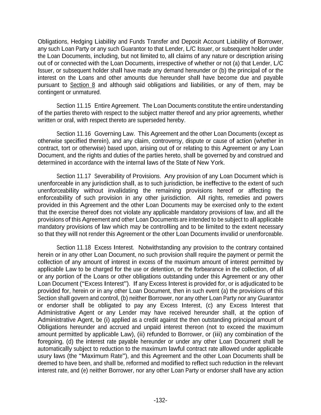 -132- Obligations, Hedging Liability and Funds Transfer and Deposit Account Liability of Borrower, any such Loan Party or any such Guarantor to that Lender, L/C Issuer, or subsequent holder under the Loan Documents, including, but not limited to, all claims of any nature or description arising out of or connected with the Loan Documents, irrespective of whether or not (a) that Lender, L/C Issuer, or subsequent holder shall have made any demand hereunder or (b) the principal of or the interest on the Loans and other amounts due hereunder shall have become due and payable pursuant to Section 8 and although said obligations and liabilities, or any of them, may be contingent or unmatured. Section 11.15 Entire Agreement. The Loan Documents constitute the entire understanding of the parties thereto with respect to the subject matter thereof and any prior agreements, whether written or oral, with respect thereto are superseded hereby. Section 11.16 Governing Law. This Agreement and the other Loan Documents (except as otherwise specified therein), and any claim, controversy, dispute or cause of action (whether in contract, tort or otherwise) based upon, arising out of or relating to this Agreement or any Loan Document, and the rights and duties of the parties hereto, shall be governed by and construed and determined in accordance with the internal laws of the State of New York. Section 11.17 Severability of Provisions. Any provision of any Loan Document which is unenforceable in any jurisdiction shall, as to such jurisdiction, be ineffective to the extent of such unenforceability without invalidating the remaining provisions hereof or affecting the enforceability of such provision in any other jurisdiction. All rights, remedies and powers provided in this Agreement and the other Loan Documents may be exercised only to the extent that the exercise thereof does not violate any applicable mandatory provisions of law, and all the provisions of this Agreement and other Loan Documents are intended to be subject to all applicable mandatory provisions of law which may be controlling and to be limited to the extent necessary so that they will not render this Agreement or the other Loan Documents invalid or unenforceable. Section 11.18 Excess Interest. Notwithstanding any provision to the contrary contained herein or in any other Loan Document, no such provision shall require the payment or permit the collection of any amount of interest in excess of the maximum amount of interest permitted by applicable Law to be charged for the use or detention, or the forbearance in the collection, of all or any portion of the Loans or other obligations outstanding under this Agreement or any other Loan Document (“Excess Interest”). If any Excess Interest is provided for, or is adjudicated to be provided for, herein or in any other Loan Document, then in such event (a) the provisions of this Section shall govern and control, (b) neither Borrower, nor any other Loan Party nor any Guarantor or endorser shall be obligated to pay any Excess Interest, (c) any Excess Interest that Administrative Agent or any Lender may have received hereunder shall, at the option of Administrative Agent, be (i) applied as a credit against the then outstanding principal amount of Obligations hereunder and accrued and unpaid interest thereon (not to exceed the maximum amount permitted by applicable Law), (ii) refunded to Borrower, or (iii) any combination of the foregoing, (d) the interest rate payable hereunder or under any other Loan Document shall be automatically subject to reduction to the maximum lawful contract rate allowed under applicable usury laws (the “Maximum Rate”), and this Agreement and the other Loan Documents shall be deemed to have been, and shall be, reformed and modified to reflect such reduction in the relevant interest rate, and (e) neither Borrower, nor any other Loan Party or endorser shall have any action