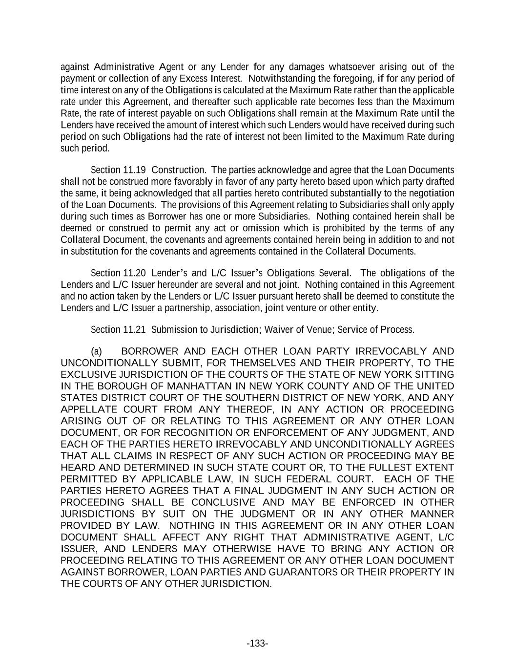 -133- against Administrative Agent or any Lender for any damages whatsoever arising out of the payment or collection of any Excess Interest. Notwithstanding the foregoing, if for any period of time interest on any of the Obligations is calculated at the Maximum Rate rather than the applicable rate under this Agreement, and thereafter such applicable rate becomes less than the Maximum Rate, the rate of interest payable on such Obligations shall remain at the Maximum Rate until the Lenders have received the amount of interest which such Lenders would have received during such period on such Obligations had the rate of interest not been limited to the Maximum Rate during such period. Section 11.19 Construction. The parties acknowledge and agree that the Loan Documents shall not be construed more favorably in favor of any party hereto based upon which party drafted the same, it being acknowledged that all parties hereto contributed substantially to the negotiation of the Loan Documents. The provisions of this Agreement relating to Subsidiaries shall only apply during such times as Borrower has one or more Subsidiaries. Nothing contained herein shall be deemed or construed to permit any act or omission which is prohibited by the terms of any Collateral Document, the covenants and agreements contained herein being in addition to and not in substitution for the covenants and agreements contained in the Collateral Documents. Section 11.20 Lender’s and L/C Issuer’s Obligations Several. The obligations of the Lenders and L/C Issuer hereunder are several and not joint. Nothing contained in this Agreement and no action taken by the Lenders or L/C Issuer pursuant hereto shall be deemed to constitute the Lenders and L/C Issuer a partnership, association, joint venture or other entity. Section 11.21 Submission to Jurisdiction; Waiver of Venue; Service of Process. (a) BORROWER AND EACH OTHER LOAN PARTY IRREVOCABLY AND UNCONDITIONALLY SUBMIT, FOR THEMSELVES AND THEIR PROPERTY, TO THE EXCLUSIVE JURISDICTION OF THE COURTS OF THE STATE OF NEW YORK SITTING IN THE BOROUGH OF MANHATTAN IN NEW YORK COUNTY AND OF THE UNITED STATES DISTRICT COURT OF THE SOUTHERN DISTRICT OF NEW YORK, AND ANY APPELLATE COURT FROM ANY THEREOF, IN ANY ACTION OR PROCEEDING ARISING OUT OF OR RELATING TO THIS AGREEMENT OR ANY OTHER LOAN DOCUMENT, OR FOR RECOGNITION OR ENFORCEMENT OF ANY JUDGMENT, AND EACH OF THE PARTIES HERETO IRREVOCABLY AND UNCONDITIONALLY AGREES THAT ALL CLAIMS IN RESPECT OF ANY SUCH ACTION OR PROCEEDING MAY BE HEARD AND DETERMINED IN SUCH STATE COURT OR, TO THE FULLEST EXTENT PERMITTED BY APPLICABLE LAW, IN SUCH FEDERAL COURT. EACH OF THE PARTIES HERETO AGREES THAT A FINAL JUDGMENT IN ANY SUCH ACTION OR PROCEEDING SHALL BE CONCLUSIVE AND MAY BE ENFORCED IN OTHER JURISDICTIONS BY SUIT ON THE JUDGMENT OR IN ANY OTHER MANNER PROVIDED BY LAW. NOTHING IN THIS AGREEMENT OR IN ANY OTHER LOAN DOCUMENT SHALL AFFECT ANY RIGHT THAT ADMINISTRATIVE AGENT, L/C ISSUER, AND LENDERS MAY OTHERWISE HAVE TO BRING ANY ACTION OR PROCEEDING RELATING TO THIS AGREEMENT OR ANY OTHER LOAN DOCUMENT AGAINST BORROWER, LOAN PARTIES AND GUARANTORS OR THEIR PROPERTY IN THE COURTS OF ANY OTHER JURISDICTION.