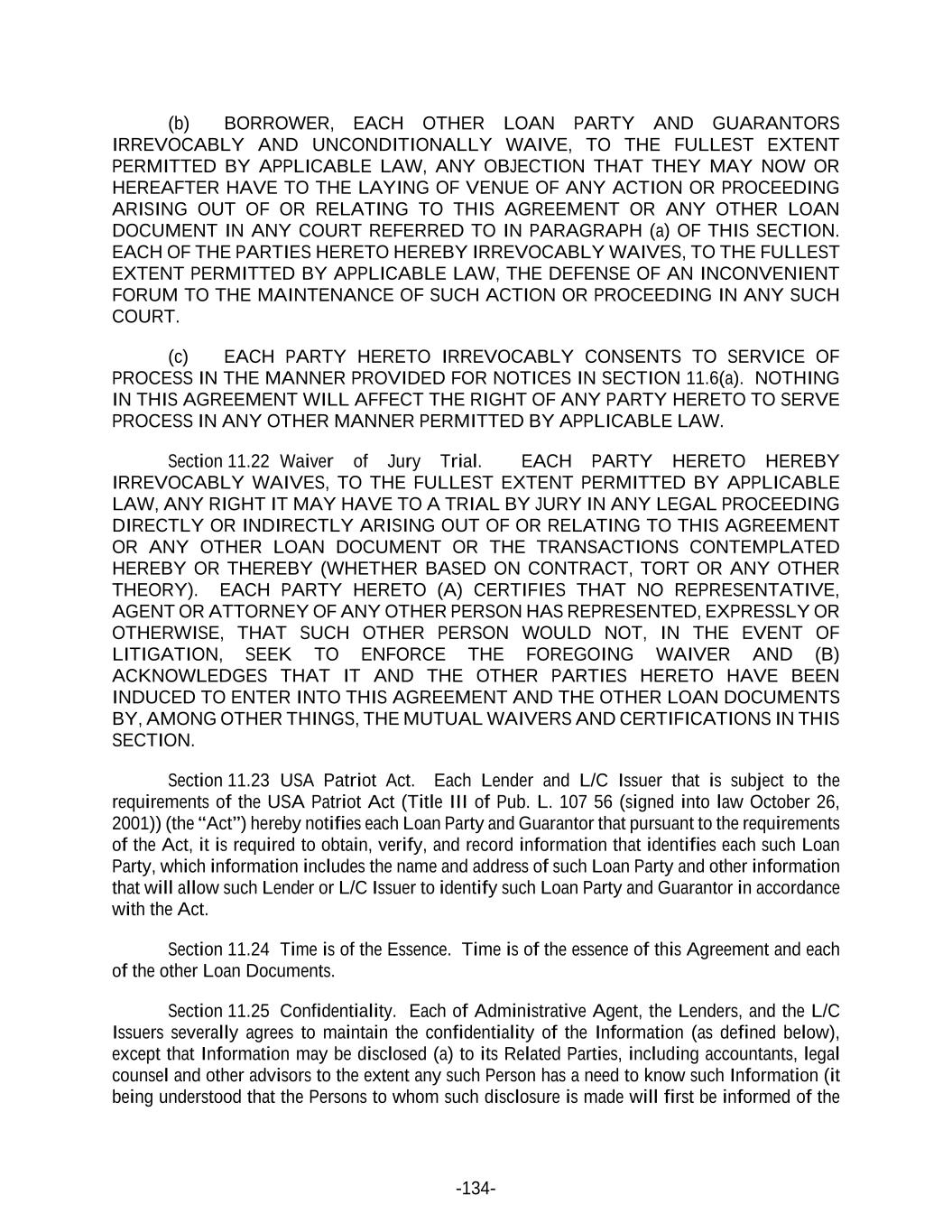 -134- (b) BORROWER, EACH OTHER LOAN PARTY AND GUARANTORS IRREVOCABLY AND UNCONDITIONALLY WAIVE, TO THE FULLEST EXTENT PERMITTED BY APPLICABLE LAW, ANY OBJECTION THAT THEY MAY NOW OR HEREAFTER HAVE TO THE LAYING OF VENUE OF ANY ACTION OR PROCEEDING ARISING OUT OF OR RELATING TO THIS AGREEMENT OR ANY OTHER LOAN DOCUMENT IN ANY COURT REFERRED TO IN PARAGRAPH (a) OF THIS SECTION. EACH OF THE PARTIES HERETO HEREBY IRREVOCABLY WAIVES, TO THE FULLEST EXTENT PERMITTED BY APPLICABLE LAW, THE DEFENSE OF AN INCONVENIENT FORUM TO THE MAINTENANCE OF SUCH ACTION OR PROCEEDING IN ANY SUCH COURT. (c) EACH PARTY HERETO IRREVOCABLY CONSENTS TO SERVICE OF PROCESS IN THE MANNER PROVIDED FOR NOTICES IN SECTION 11.6(a). NOTHING IN THIS AGREEMENT WILL AFFECT THE RIGHT OF ANY PARTY HERETO TO SERVE PROCESS IN ANY OTHER MANNER PERMITTED BY APPLICABLE LAW. Section 11.22 Waiver of Jury Trial. EACH PARTY HERETO HEREBY IRREVOCABLY WAIVES, TO THE FULLEST EXTENT PERMITTED BY APPLICABLE LAW, ANY RIGHT IT MAY HAVE TO A TRIAL BY JURY IN ANY LEGAL PROCEEDING DIRECTLY OR INDIRECTLY ARISING OUT OF OR RELATING TO THIS AGREEMENT OR ANY OTHER LOAN DOCUMENT OR THE TRANSACTIONS CONTEMPLATED HEREBY OR THEREBY (WHETHER BASED ON CONTRACT, TORT OR ANY OTHER THEORY). EACH PARTY HERETO (A) CERTIFIES THAT NO REPRESENTATIVE, AGENT OR ATTORNEY OF ANY OTHER PERSON HAS REPRESENTED, EXPRESSLY OR OTHERWISE, THAT SUCH OTHER PERSON WOULD NOT, IN THE EVENT OF LITIGATION, SEEK TO ENFORCE THE FOREGOING WAIVER AND (B) ACKNOWLEDGES THAT IT AND THE OTHER PARTIES HERETO HAVE BEEN INDUCED TO ENTER INTO THIS AGREEMENT AND THE OTHER LOAN DOCUMENTS BY, AMONG OTHER THINGS, THE MUTUAL WAIVERS AND CERTIFICATIONS IN THIS SECTION. Section 11.23 USA Patriot Act. Each Lender and L/C Issuer that is subject to the requirements of the USA Patriot Act (Title III of Pub. L. 107 56 (signed into law October 26, 2001)) (the “Act”) hereby notifies each Loan Party and Guarantor that pursuant to the requirements of the Act, it is required to obtain, verify, and record information that identifies each such Loan Party, which information includes the name and address of such Loan Party and other information that will allow such Lender or L/C Issuer to identify such Loan Party and Guarantor in accordance with the Act. Section 11.24 Time is of the Essence. Time is of the essence of this Agreement and each of the other Loan Documents. Section 11.25 Confidentiality. Each of Administrative Agent, the Lenders, and the L/C Issuers severally agrees to maintain the confidentiality of the Information (as defined below), except that Information may be disclosed (a) to its Related Parties, including accountants, legal counsel and other advisors to the extent any such Person has a need to know such Information (it being understood that the Persons to whom such disclosure is made will first be informed of the