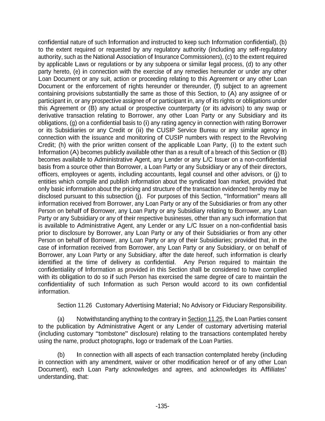-135- confidential nature of such Information and instructed to keep such Information confidential), (b) to the extent required or requested by any regulatory authority (including any self-regulatory authority, such as the National Association of Insurance Commissioners), (c) to the extent required by applicable Laws or regulations or by any subpoena or similar legal process, (d) to any other party hereto, (e) in connection with the exercise of any remedies hereunder or under any other Loan Document or any suit, action or proceeding relating to this Agreement or any other Loan Document or the enforcement of rights hereunder or thereunder, (f) subject to an agreement containing provisions substantially the same as those of this Section, to (A) any assignee of or participant in, or any prospective assignee of or participant in, any of its rights or obligations under this Agreement or (B) any actual or prospective counterparty (or its advisors) to any swap or derivative transaction relating to Borrower, any other Loan Party or any Subsidiary and its obligations, (g) on a confidential basis to (i) any rating agency in connection with rating Borrower or its Subsidiaries or any Credit or (ii) the CUSIP Service Bureau or any similar agency in connection with the issuance and monitoring of CUSIP numbers with respect to the Revolving Credit; (h) with the prior written consent of the applicable Loan Party, (i) to the extent such Information (A) becomes publicly available other than as a result of a breach of this Section or (B) becomes available to Administrative Agent, any Lender or any L/C Issuer on a non-confidential basis from a source other than Borrower, a Loan Party or any Subsidiary or any of their directors, officers, employees or agents, including accountants, legal counsel and other advisors, or (j) to entities which compile and publish information about the syndicated loan market, provided that only basic information about the pricing and structure of the transaction evidenced hereby may be disclosed pursuant to this subsection (j). For purposes of this Section, “Information” means all information received from Borrower, any Loan Party or any of the Subsidiaries or from any other Person on behalf of Borrower, any Loan Party or any Subsidiary relating to Borrower, any Loan Party or any Subsidiary or any of their respective businesses, other than any such information that is available to Administrative Agent, any Lender or any L/C Issuer on a non-confidential basis prior to disclosure by Borrower, any Loan Party or any of their Subsidiaries or from any other Person on behalf of Borrower, any Loan Party or any of their Subsidiaries; provided that, in the case of information received from Borrower, any Loan Party or any Subsidiary, or on behalf of Borrower, any Loan Party or any Subsidiary, after the date hereof, such information is clearly identified at the time of delivery as confidential. Any Person required to maintain the confidentiality of Information as provided in this Section shall be considered to have complied with its obligation to do so if such Person has exercised the same degree of care to maintain the confidentiality of such Information as such Person would accord to its own confidential information. Section 11.26 Customary Advertising Material; No Advisory or Fiduciary Responsibility. (a) Notwithstanding anything to the contrary in Section 11.25, the Loan Parties consent to the publication by Administrative Agent or any Lender of customary advertising material (including customary “tombstone” disclosure) relating to the transactions contemplated hereby using the name, product photographs, logo or trademark of the Loan Parties. (b) In connection with all aspects of each transaction contemplated hereby (including in connection with any amendment, waiver or other modification hereof or of any other Loan Document), each Loan Party acknowledges and agrees, and acknowledges its Affiliates’ understanding, that: