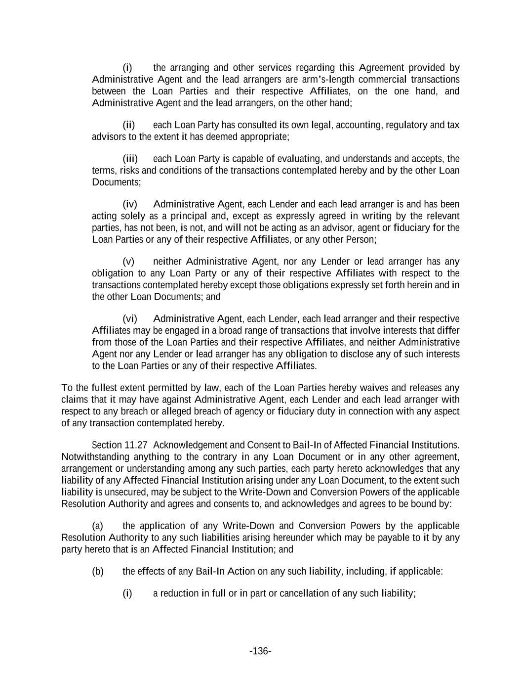 -136- (i) the arranging and other services regarding this Agreement provided by Administrative Agent and the lead arrangers are arm’s-length commercial transactions between the Loan Parties and their respective Affiliates, on the one hand, and Administrative Agent and the lead arrangers, on the other hand; (ii) each Loan Party has consulted its own legal, accounting, regulatory and tax advisors to the extent it has deemed appropriate; (iii) each Loan Party is capable of evaluating, and understands and accepts, the terms, risks and conditions of the transactions contemplated hereby and by the other Loan Documents; (iv) Administrative Agent, each Lender and each lead arranger is and has been acting solely as a principal and, except as expressly agreed in writing by the relevant parties, has not been, is not, and will not be acting as an advisor, agent or fiduciary for the Loan Parties or any of their respective Affiliates, or any other Person; (v) neither Administrative Agent, nor any Lender or lead arranger has any obligation to any Loan Party or any of their respective Affiliates with respect to the transactions contemplated hereby except those obligations expressly set forth herein and in the other Loan Documents; and (vi) Administrative Agent, each Lender, each lead arranger and their respective Affiliates may be engaged in a broad range of transactions that involve interests that differ from those of the Loan Parties and their respective Affiliates, and neither Administrative Agent nor any Lender or lead arranger has any obligation to disclose any of such interests to the Loan Parties or any of their respective Affiliates. To the fullest extent permitted by law, each of the Loan Parties hereby waives and releases any claims that it may have against Administrative Agent, each Lender and each lead arranger with respect to any breach or alleged breach of agency or fiduciary duty in connection with any aspect of any transaction contemplated hereby. Section 11.27 Acknowledgement and Consent to Bail-In of Affected Financial Institutions. Notwithstanding anything to the contrary in any Loan Document or in any other agreement, arrangement or understanding among any such parties, each party hereto acknowledges that any liability of any Affected Financial Institution arising under any Loan Document, to the extent such liability is unsecured, may be subject to the Write-Down and Conversion Powers of the applicable Resolution Authority and agrees and consents to, and acknowledges and agrees to be bound by: (a) the application of any Write-Down and Conversion Powers by the applicable Resolution Authority to any such liabilities arising hereunder which may be payable to it by any party hereto that is an Affected Financial Institution; and (b) the effects of any Bail-In Action on any such liability, including, if applicable: (i) a reduction in full or in part or cancellation of any such liability;