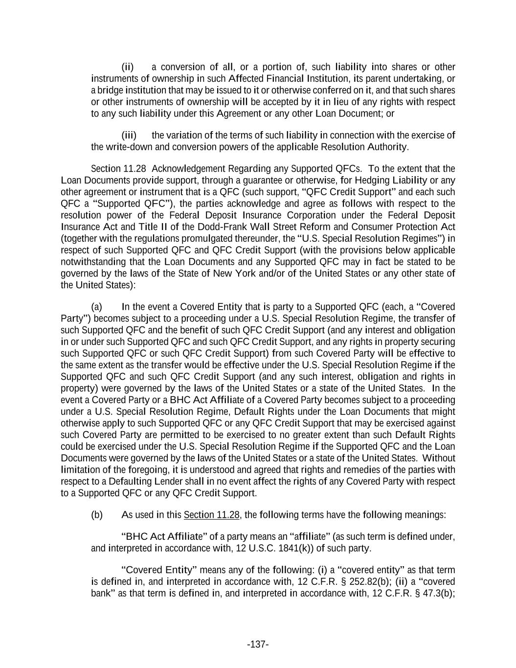 -137- (ii) a conversion of all, or a portion of, such liability into shares or other instruments of ownership in such Affected Financial Institution, its parent undertaking, or a bridge institution that may be issued to it or otherwise conferred on it, and that such shares or other instruments of ownership will be accepted by it in lieu of any rights with respect to any such liability under this Agreement or any other Loan Document; or (iii) the variation of the terms of such liability in connection with the exercise of the write-down and conversion powers of the applicable Resolution Authority. Section 11.28 Acknowledgement Regarding any Supported QFCs. To the extent that the Loan Documents provide support, through a guarantee or otherwise, for Hedging Liability or any other agreement or instrument that is a QFC (such support, “QFC Credit Support” and each such QFC a “Supported QFC”), the parties acknowledge and agree as follows with respect to the resolution power of the Federal Deposit Insurance Corporation under the Federal Deposit Insurance Act and Title II of the Dodd-Frank Wall Street Reform and Consumer Protection Act (together with the regulations promulgated thereunder, the “U.S. Special Resolution Regimes”) in respect of such Supported QFC and QFC Credit Support (with the provisions below applicable notwithstanding that the Loan Documents and any Supported QFC may in fact be stated to be governed by the laws of the State of New York and/or of the United States or any other state of the United States): (a) In the event a Covered Entity that is party to a Supported QFC (each, a “Covered Party”) becomes subject to a proceeding under a U.S. Special Resolution Regime, the transfer of such Supported QFC and the benefit of such QFC Credit Support (and any interest and obligation in or under such Supported QFC and such QFC Credit Support, and any rights in property securing such Supported QFC or such QFC Credit Support) from such Covered Party will be effective to the same extent as the transfer would be effective under the U.S. Special Resolution Regime if the Supported QFC and such QFC Credit Support (and any such interest, obligation and rights in property) were governed by the laws of the United States or a state of the United States. In the event a Covered Party or a BHC Act Affiliate of a Covered Party becomes subject to a proceeding under a U.S. Special Resolution Regime, Default Rights under the Loan Documents that might otherwise apply to such Supported QFC or any QFC Credit Support that may be exercised against such Covered Party are permitted to be exercised to no greater extent than such Default Rights could be exercised under the U.S. Special Resolution Regime if the Supported QFC and the Loan Documents were governed by the laws of the United States or a state of the United States. Without limitation of the foregoing, it is understood and agreed that rights and remedies of the parties with respect to a Defaulting Lender shall in no event affect the rights of any Covered Party with respect to a Supported QFC or any QFC Credit Support. (b) As used in this Section 11.28, the following terms have the following meanings: “BHC Act Affiliate” of a party means an “affiliate” (as such term is defined under, and interpreted in accordance with, 12 U.S.C. 1841(k)) of such party. “Covered Entity” means any of the following: (i) a “covered entity” as that term is defined in, and interpreted in accordance with, 12 C.F.R. § 252.82(b); (ii) a “covered bank” as that term is defined in, and interpreted in accordance with, 12 C.F.R. § 47.3(b);