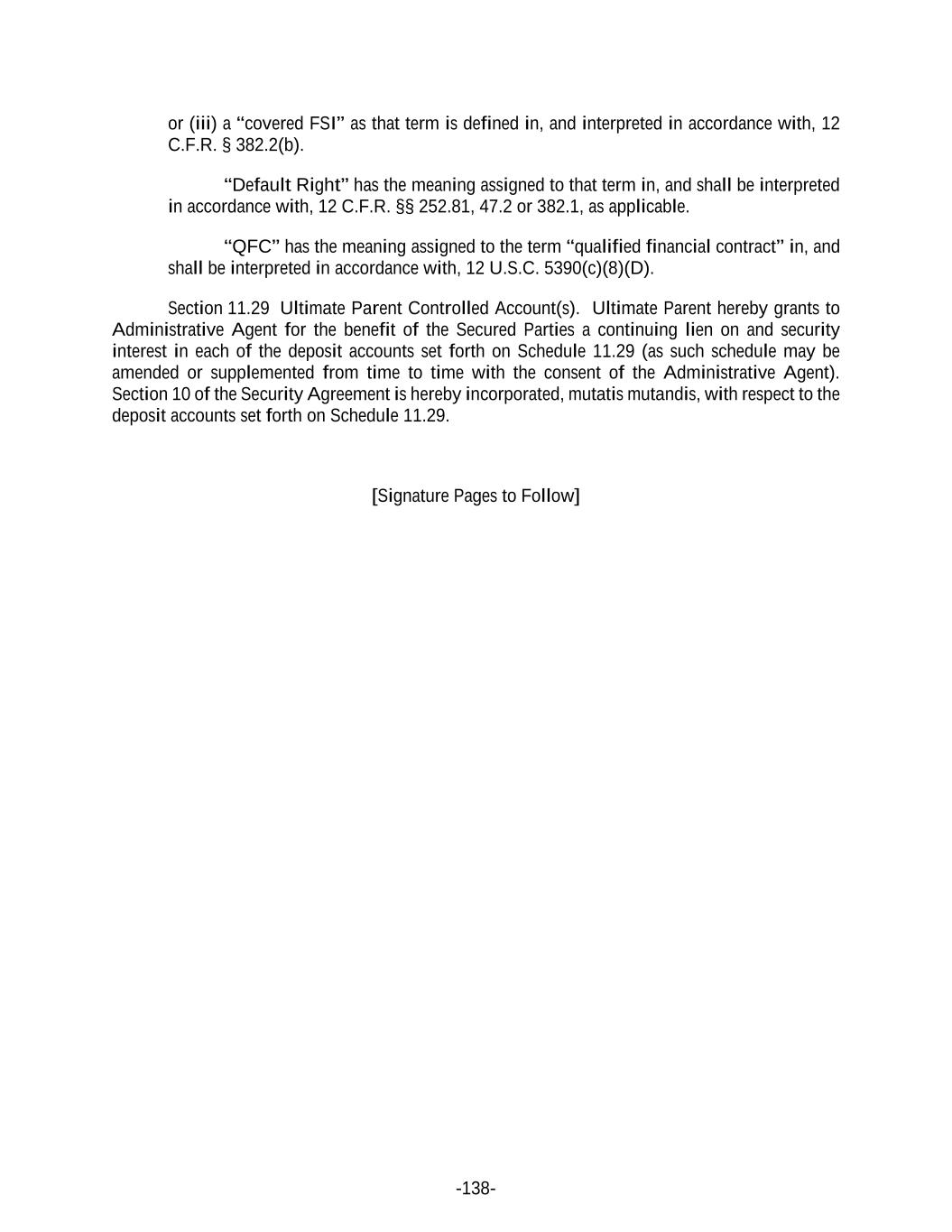 -138- or (iii) a “covered FSI” as that term is defined in, and interpreted in accordance with, 12 C.F.R. § 382.2(b). “Default Right” has the meaning assigned to that term in, and shall be interpreted in accordance with, 12 C.F.R. §§ 252.81, 47.2 or 382.1, as applicable. “QFC” has the meaning assigned to the term “qualified financial contract” in, and shall be interpreted in accordance with, 12 U.S.C. 5390(c)(8)(D). Section 11.29 Ultimate Parent Controlled Account(s). Ultimate Parent hereby grants to Administrative Agent for the benefit of the Secured Parties a continuing lien on and security interest in each of the deposit accounts set forth on Schedule 11.29 (as such schedule may be amended or supplemented from time to time with the consent of the Administrative Agent). Section 10 of the Security Agreement is hereby incorporated, mutatis mutandis, with respect to the deposit accounts set forth on Schedule 11.29. [Signature Pages to Follow]