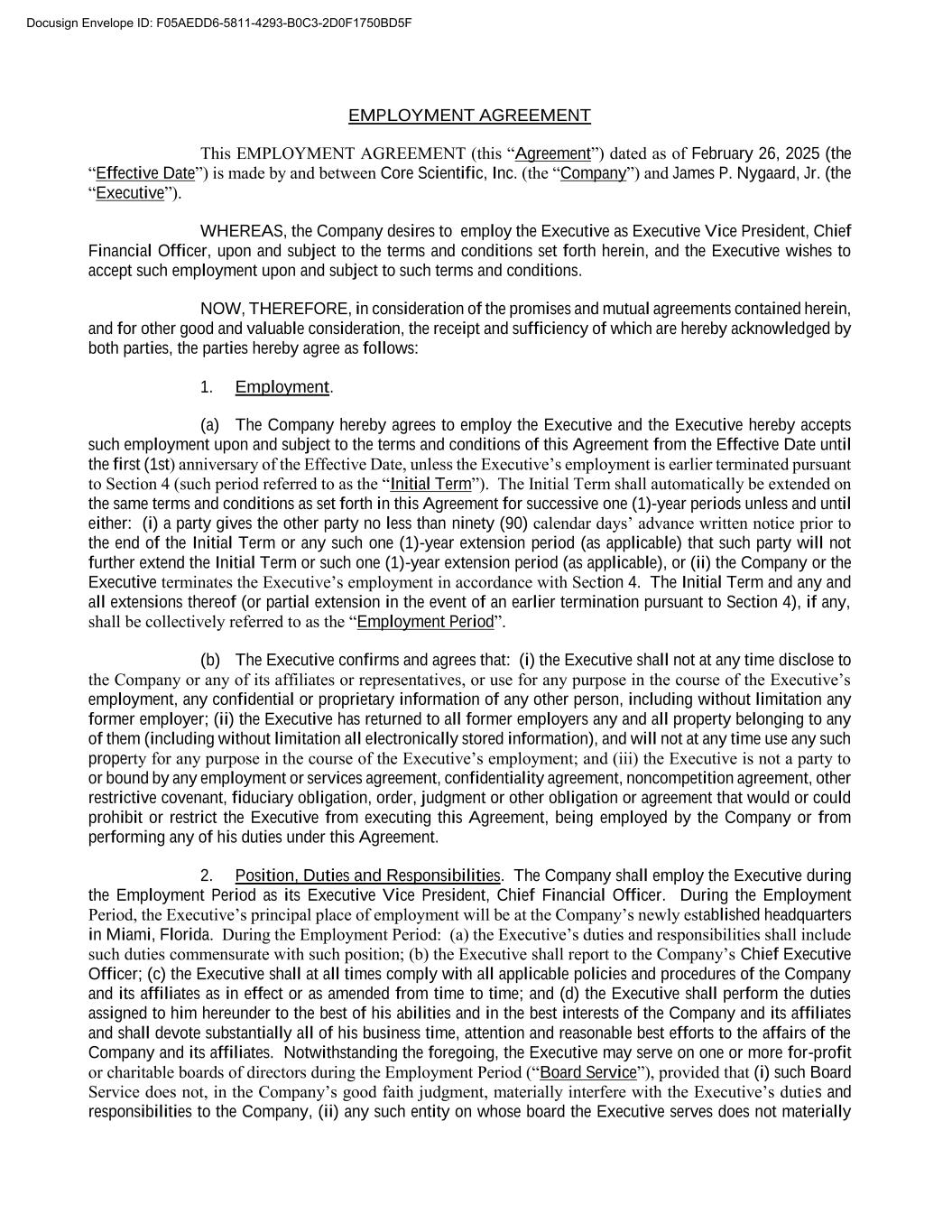 EMPLOYMENT AGREEMENT This EMPLOYMENT AGREEMENT (this “Agreement”) dated as of February 26, 2025 (the “Effective Date”) is made by and between Core Scientific, Inc. (the “Company”) and James P. Nygaard, Jr. (the “Executive”). WHEREAS, the Company desires to employ the Executive as Executive Vice President, Chief Financial Officer, upon and subject to the terms and conditions set forth herein, and the Executive wishes to accept such employment upon and subject to such terms and conditions. NOW, THEREFORE, in consideration of the promises and mutual agreements contained herein, and for other good and valuable consideration, the receipt and sufficiency of which are hereby acknowledged by both parties, the parties hereby agree as follows: 1. Employment. (a) The Company hereby agrees to employ the Executive and the Executive hereby accepts such employment upon and subject to the terms and conditions of this Agreement from the Effective Date until the first (1st) anniversary of the Effective Date, unless the Executive’s employment is earlier terminated pursuant to Section 4 (such period referred to as the “Initial Term”). The Initial Term shall automatically be extended on the same terms and conditions as set forth in this Agreement for successive one (1)-year periods unless and until either: (i) a party gives the other party no less than ninety (90) calendar days’ advance written notice prior to the end of the Initial Term or any such one (1)-year extension period (as applicable) that such party will not further extend the Initial Term or such one (1)-year extension period (as applicable), or (ii) the Company or the Executive terminates the Executive’s employment in accordance with Section 4. The Initial Term and any and all extensions thereof (or partial extension in the event of an earlier termination pursuant to Section 4), if any, shall be collectively referred to as the “Employment Period”. (b) The Executive confirms and agrees that: (i) the Executive shall not at any time disclose to the Company or any of its affiliates or representatives, or use for any purpose in the course of the Executive’s employment, any confidential or proprietary information of any other person, including without limitation any former employer; (ii) the Executive has returned to all former employers any and all property belonging to any of them (including without limitation all electronically stored information), and will not at any time use any such property for any purpose in the course of the Executive’s employment; and (iii) the Executive is not a party to or bound by any employment or services agreement, confidentiality agreement, noncompetition agreement, other restrictive covenant, fiduciary obligation, order, judgment or other obligation or agreement that would or could prohibit or restrict the Executive from executing this Agreement, being employed by the Company or from performing any of his duties under this Agreement. 2. Position, Duties and Responsibilities. The Company shall employ the Executive during the Employment Period as its Executive Vice President, Chief Financial Officer. During the Employment Period, the Executive’s principal place of employment will be at the Company’s newly established headquarters in Miami, Florida. During the Employment Period: (a) the Executive’s duties and responsibilities shall include such duties commensurate with such position; (b) the Executive shall report to the Company’s Chief Executive Officer; (c) the Executive shall at all times comply with all applicable policies and procedures of the Company and its affiliates as in effect or as amended from time to time; and (d) the Executive shall perform the duties assigned to him hereunder to the best of his abilities and in the best interests of the Company and its affiliates and shall devote substantially all of his business time, attention and reasonable best efforts to the affairs of the Company and its affiliates. Notwithstanding the foregoing, the Executive may serve on one or more for-profit or charitable boards of directors during the Employment Period (“Board Service”), provided that (i) such Board Service does not, in the Company’s good faith judgment, materially interfere with the Executive’s duties and responsibilities to the Company, (ii) any such entity on whose board the Executive serves does not materially Docusign Envelope ID: F05AEDD6-5811-4293-B0C3-2D0F1750BD5F