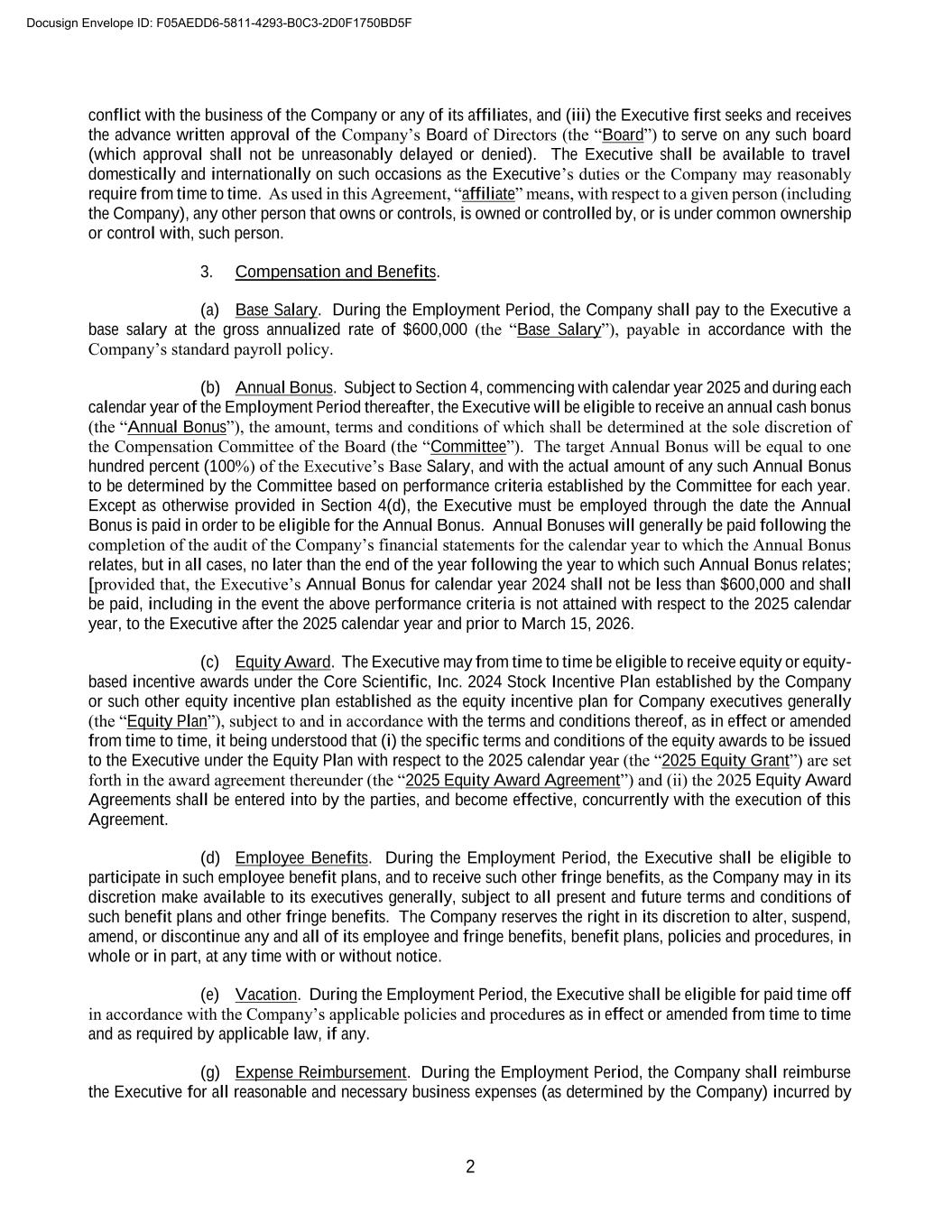 2 conflict with the business of the Company or any of its affiliates, and (iii) the Executive first seeks and receives the advance written approval of the Company’s Board of Directors (the “Board”) to serve on any such board (which approval shall not be unreasonably delayed or denied). The Executive shall be available to travel domestically and internationally on such occasions as the Executive’s duties or the Company may reasonably require from time to time. As used in this Agreement, “affiliate” means, with respect to a given person (including the Company), any other person that owns or controls, is owned or controlled by, or is under common ownership or control with, such person. 3. Compensation and Benefits. (a) Base Salary. During the Employment Period, the Company shall pay to the Executive a base salary at the gross annualized rate of $600,000 (the “Base Salary”), payable in accordance with the Company’s standard payroll policy. (b) Annual Bonus. Subject to Section 4, commencing with calendar year 2025 and during each calendar year of the Employment Period thereafter, the Executive will be eligible to receive an annual cash bonus (the “Annual Bonus”), the amount, terms and conditions of which shall be determined at the sole discretion of the Compensation Committee of the Board (the “Committee”). The target Annual Bonus will be equal to one hundred percent (100%) of the Executive’s Base Salary, and with the actual amount of any such Annual Bonus to be determined by the Committee based on performance criteria established by the Committee for each year. Except as otherwise provided in Section 4(d), the Executive must be employed through the date the Annual Bonus is paid in order to be eligible for the Annual Bonus. Annual Bonuses will generally be paid following the completion of the audit of the Company’s financial statements for the calendar year to which the Annual Bonus relates, but in all cases, no later than the end of the year following the year to which such Annual Bonus relates; [provided that, the Executive’s Annual Bonus for calendar year 2024 shall not be less than $600,000 and shall be paid, including in the event the above performance criteria is not attained with respect to the 2025 calendar year, to the Executive after the 2025 calendar year and prior to March 15, 2026. (c) Equity Award. The Executive may from time to time be eligible to receive equity or equity- based incentive awards under the Core Scientific, Inc. 2024 Stock Incentive Plan established by the Company or such other equity incentive plan established as the equity incentive plan for Company executives generally (the “Equity Plan”), subject to and in accordance with the terms and conditions thereof, as in effect or amended from time to time, it being understood that (i) the specific terms and conditions of the equity awards to be issued to the Executive under the Equity Plan with respect to the 2025 calendar year (the “2025 Equity Grant”) are set forth in the award agreement thereunder (the “2025 Equity Award Agreement”) and (ii) the 2025 Equity Award Agreements shall be entered into by the parties, and become effective, concurrently with the execution of this Agreement. (d) Employee Benefits. During the Employment Period, the Executive shall be eligible to participate in such employee benefit plans, and to receive such other fringe benefits, as the Company may in its discretion make available to its executives generally, subject to all present and future terms and conditions of such benefit plans and other fringe benefits. The Company reserves the right in its discretion to alter, suspend, amend, or discontinue any and all of its employee and fringe benefits, benefit plans, policies and procedures, in whole or in part, at any time with or without notice. (e) Vacation. During the Employment Period, the Executive shall be eligible for paid time off in accordance with the Company’s applicable policies and procedures as in effect or amended from time to time and as required by applicable law, if any. (g) Expense Reimbursement. During the Employment Period, the Company shall reimburse the Executive for all reasonable and necessary business expenses (as determined by the Company) incurred by Docusign Envelope ID: F05AEDD6-5811-4293-B0C3-2D0F1750BD5F