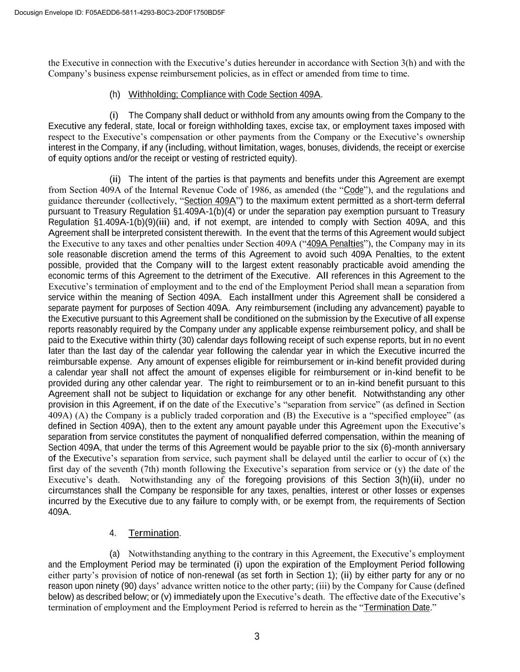3 the Executive in connection with the Executive’s duties hereunder in accordance with Section 3(h) and with the Company’s business expense reimbursement policies, as in effect or amended from time to time. (h) Withholding; Compliance with Code Section 409A. (i) The Company shall deduct or withhold from any amounts owing from the Company to the Executive any federal, state, local or foreign withholding taxes, excise tax, or employment taxes imposed with respect to the Executive’s compensation or other payments from the Company or the Executive’s ownership interest in the Company, if any (including, without limitation, wages, bonuses, dividends, the receipt or exercise of equity options and/or the receipt or vesting of restricted equity). (ii) The intent of the parties is that payments and benefits under this Agreement are exempt from Section 409A of the Internal Revenue Code of 1986, as amended (the “Code”), and the regulations and guidance thereunder (collectively, “Section 409A”) to the maximum extent permitted as a short-term deferral pursuant to Treasury Regulation §1.409A-1(b)(4) or under the separation pay exemption pursuant to Treasury Regulation §1.409A-1(b)(9)(iii) and, if not exempt, are intended to comply with Section 409A, and this Agreement shall be interpreted consistent therewith. In the event that the terms of this Agreement would subject the Executive to any taxes and other penalties under Section 409A (“409A Penalties”), the Company may in its sole reasonable discretion amend the terms of this Agreement to avoid such 409A Penalties, to the extent possible, provided that the Company will to the largest extent reasonably practicable avoid amending the economic terms of this Agreement to the detriment of the Executive. All references in this Agreement to the Executive’s termination of employment and to the end of the Employment Period shall mean a separation from service within the meaning of Section 409A. Each installment under this Agreement shall be considered a separate payment for purposes of Section 409A. Any reimbursement (including any advancement) payable to the Executive pursuant to this Agreement shall be conditioned on the submission by the Executive of all expense reports reasonably required by the Company under any applicable expense reimbursement policy, and shall be paid to the Executive within thirty (30) calendar days following receipt of such expense reports, but in no event later than the last day of the calendar year following the calendar year in which the Executive incurred the reimbursable expense. Any amount of expenses eligible for reimbursement or in-kind benefit provided during a calendar year shall not affect the amount of expenses eligible for reimbursement or in-kind benefit to be provided during any other calendar year. The right to reimbursement or to an in-kind benefit pursuant to this Agreement shall not be subject to liquidation or exchange for any other benefit. Notwithstanding any other provision in this Agreement, if on the date of the Executive’s “separation from service” (as defined in Section 409A) (A) the Company is a publicly traded corporation and (B) the Executive is a “specified employee” (as defined in Section 409A), then to the extent any amount payable under this Agreement upon the Executive’s separation from service constitutes the payment of nonqualified deferred compensation, within the meaning of Section 409A, that under the terms of this Agreement would be payable prior to the six (6)-month anniversary of the Executive’s separation from service, such payment shall be delayed until the earlier to occur of (x) the first day of the seventh (7th) month following the Executive’s separation from service or (y) the date of the Executive’s death. Notwithstanding any of the foregoing provisions of this Section 3(h)(ii), under no circumstances shall the Company be responsible for any taxes, penalties, interest or other losses or expenses incurred by the Executive due to any failure to comply with, or be exempt from, the requirements of Section 409A. 4. Termination. (a) Notwithstanding anything to the contrary in this Agreement, the Executive’s employment and the Employment Period may be terminated (i) upon the expiration of the Employment Period following either party’s provision of notice of non-renewal (as set forth in Section 1); (ii) by either party for any or no reason upon ninety (90) days’ advance written notice to the other party; (iii) by the Company for Cause (defined below) as described below; or (v) immediately upon the Executive’s death. The effective date of the Executive’s termination of employment and the Employment Period is referred to herein as the “Termination Date.” Docusign Envelope ID: F05AEDD6-5811-4293-B0C3-2D0F1750BD5F