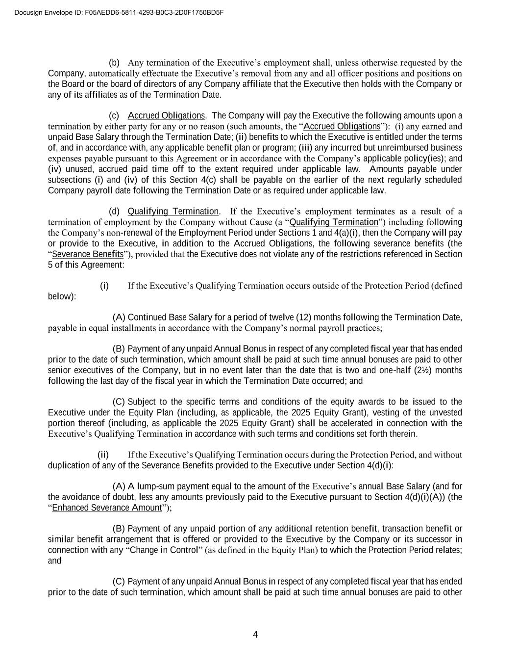 4 (b) Any termination of the Executive’s employment shall, unless otherwise requested by the Company, automatically effectuate the Executive’s removal from any and all officer positions and positions on the Board or the board of directors of any Company affiliate that the Executive then holds with the Company or any of its affiliates as of the Termination Date. (c) Accrued Obligations. The Company will pay the Executive the following amounts upon a termination by either party for any or no reason (such amounts, the “Accrued Obligations”): (i) any earned and unpaid Base Salary through the Termination Date; (ii) benefits to which the Executive is entitled under the terms of, and in accordance with, any applicable benefit plan or program; (iii) any incurred but unreimbursed business expenses payable pursuant to this Agreement or in accordance with the Company’s applicable policy(ies); and (iv) unused, accrued paid time off to the extent required under applicable law. Amounts payable under subsections (i) and (iv) of this Section 4(c) shall be payable on the earlier of the next regularly scheduled Company payroll date following the Termination Date or as required under applicable law. (d) Qualifying Termination. If the Executive’s employment terminates as a result of a termination of employment by the Company without Cause (a “Qualifying Termination”) including following the Company’s non-renewal of the Employment Period under Sections 1 and 4(a)(i), then the Company will pay or provide to the Executive, in addition to the Accrued Obligations, the following severance benefits (the “Severance Benefits”), provided that the Executive does not violate any of the restrictions referenced in Section 5 of this Agreement: (i) If the Executive’s Qualifying Termination occurs outside of the Protection Period (defined below): (A) Continued Base Salary for a period of twelve (12) months following the Termination Date, payable in equal installments in accordance with the Company’s normal payroll practices; (B) Payment of any unpaid Annual Bonus in respect of any completed fiscal year that has ended prior to the date of such termination, which amount shall be paid at such time annual bonuses are paid to other senior executives of the Company, but in no event later than the date that is two and one-half (2½) months following the last day of the fiscal year in which the Termination Date occurred; and (C) Subject to the specific terms and conditions of the equity awards to be issued to the Executive under the Equity Plan (including, as applicable, the 2025 Equity Grant), vesting of the unvested portion thereof (including, as applicable the 2025 Equity Grant) shall be accelerated in connection with the Executive’s Qualifying Termination in accordance with such terms and conditions set forth therein. (ii) If the Executive’s Qualifying Termination occurs during the Protection Period, and without duplication of any of the Severance Benefits provided to the Executive under Section 4(d)(i): (A) A lump-sum payment equal to the amount of the Executive’s annual Base Salary (and for the avoidance of doubt, less any amounts previously paid to the Executive pursuant to Section 4(d)(i)(A)) (the “Enhanced Severance Amount”); (B) Payment of any unpaid portion of any additional retention benefit, transaction benefit or similar benefit arrangement that is offered or provided to the Executive by the Company or its successor in connection with any “Change in Control” (as defined in the Equity Plan) to which the Protection Period relates; and (C) Payment of any unpaid Annual Bonus in respect of any completed fiscal year that has ended prior to the date of such termination, which amount shall be paid at such time annual bonuses are paid to other Docusign Envelope ID: F05AEDD6-5811-4293-B0C3-2D0F1750BD5F