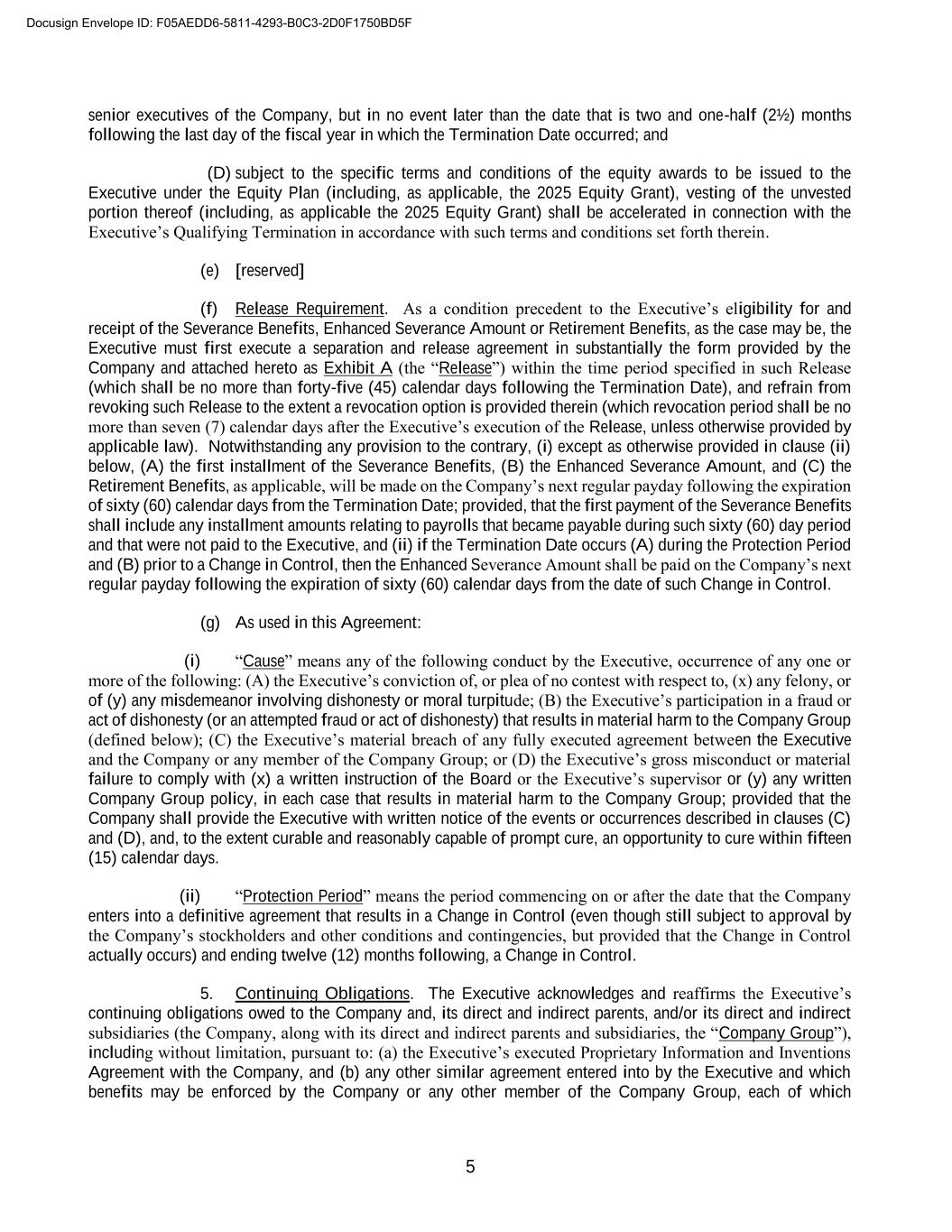 5 senior executives of the Company, but in no event later than the date that is two and one-half (2½) months following the last day of the fiscal year in which the Termination Date occurred; and (D) subject to the specific terms and conditions of the equity awards to be issued to the Executive under the Equity Plan (including, as applicable, the 2025 Equity Grant), vesting of the unvested portion thereof (including, as applicable the 2025 Equity Grant) shall be accelerated in connection with the Executive’s Qualifying Termination in accordance with such terms and conditions set forth therein. (e) [reserved] (f) Release Requirement. As a condition precedent to the Executive’s eligibility for and receipt of the Severance Benefits, Enhanced Severance Amount or Retirement Benefits, as the case may be, the Executive must first execute a separation and release agreement in substantially the form provided by the Company and attached hereto as Exhibit A (the “Release”) within the time period specified in such Release (which shall be no more than forty-five (45) calendar days following the Termination Date), and refrain from revoking such Release to the extent a revocation option is provided therein (which revocation period shall be no more than seven (7) calendar days after the Executive’s execution of the Release, unless otherwise provided by applicable law). Notwithstanding any provision to the contrary, (i) except as otherwise provided in clause (ii) below, (A) the first installment of the Severance Benefits, (B) the Enhanced Severance Amount, and (C) the Retirement Benefits, as applicable, will be made on the Company’s next regular payday following the expiration of sixty (60) calendar days from the Termination Date; provided, that the first payment of the Severance Benefits shall include any installment amounts relating to payrolls that became payable during such sixty (60) day period and that were not paid to the Executive, and (ii) if the Termination Date occurs (A) during the Protection Period and (B) prior to a Change in Control, then the Enhanced Severance Amount shall be paid on the Company’s next regular payday following the expiration of sixty (60) calendar days from the date of such Change in Control. (g) As used in this Agreement: (i) “Cause” means any of the following conduct by the Executive, occurrence of any one or more of the following: (A) the Executive’s conviction of, or plea of no contest with respect to, (x) any felony, or of (y) any misdemeanor involving dishonesty or moral turpitude; (B) the Executive’s participation in a fraud or act of dishonesty (or an attempted fraud or act of dishonesty) that results in material harm to the Company Group (defined below); (C) the Executive’s material breach of any fully executed agreement between the Executive and the Company or any member of the Company Group; or (D) the Executive’s gross misconduct or material failure to comply with (x) a written instruction of the Board or the Executive’s supervisor or (y) any written Company Group policy, in each case that results in material harm to the Company Group; provided that the Company shall provide the Executive with written notice of the events or occurrences described in clauses (C) and (D), and, to the extent curable and reasonably capable of prompt cure, an opportunity to cure within fifteen (15) calendar days. (ii) “Protection Period” means the period commencing on or after the date that the Company enters into a definitive agreement that results in a Change in Control (even though still subject to approval by the Company’s stockholders and other conditions and contingencies, but provided that the Change in Control actually occurs) and ending twelve (12) months following, a Change in Control. 5. Continuing Obligations. The Executive acknowledges and reaffirms the Executive’s continuing obligations owed to the Company and, its direct and indirect parents, and/or its direct and indirect subsidiaries (the Company, along with its direct and indirect parents and subsidiaries, the “Company Group”), including without limitation, pursuant to: (a) the Executive’s executed Proprietary Information and Inventions Agreement with the Company, and (b) any other similar agreement entered into by the Executive and which benefits may be enforced by the Company or any other member of the Company Group, each of which Docusign Envelope ID: F05AEDD6-5811-4293-B0C3-2D0F1750BD5F