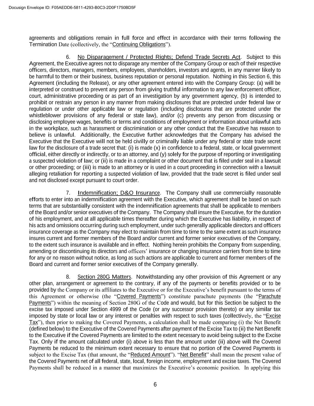 6 agreements and obligations remain in full force and effect in accordance with their terms following the Termination Date (collectively, the “Continuing Obligations”). 6. No Disparagement / Protected Rights; Defend Trade Secrets Act. Subject to this Agreement, the Executive agrees not to disparage any member of the Company Group or each of their respective officers, directors, managers, members, employees, shareholders, investors and agents, in any manner likely to be harmful to them or their business, business reputation or personal reputation. Nothing in this Section 6, this Agreement (including the Release), or any other agreement entered into with the Company Group: (a) will be interpreted or construed to prevent any person from giving truthful information to any law enforcement officer, court, administrative proceeding or as part of an investigation by any government agency, (b) is intended to prohibit or restrain any person in any manner from making disclosures that are protected under federal law or regulation or under other applicable law or regulation (including disclosures that are protected under the whistleblower provisions of any federal or state law), and/or (c) prevents any person from discussing or disclosing employee wages, benefits or terms and conditions of employment or information about unlawful acts in the workplace, such as harassment or discrimination or any other conduct that the Executive has reason to believe is unlawful. Additionally, the Executive further acknowledges that the Company has advised the Executive that the Executive will not be held civilly or criminally liable under any federal or state trade secret law for the disclosure of a trade secret that: (i) is made (x) in confidence to a federal, state, or local government official, either directly or indirectly, or to an attorney, and (y) solely for the purpose of reporting or investigating a suspected violation of law; or (ii) is made in a complaint or other document that is filed under seal in a lawsuit or other proceeding; or (iii) is made to an attorney or is used in a court proceeding in connection with a lawsuit alleging retaliation for reporting a suspected violation of law, provided that the trade secret is filed under seal and not disclosed except pursuant to court order. 7. Indemnification; D&O Insurance. The Company shall use commercially reasonable efforts to enter into an indemnification agreement with the Executive, which agreement shall be based on such terms that are substantially consistent with the indemnification agreements that shall be applicable to members of the Board and/or senior executives of the Company. The Company shall insure the Executive, for the duration of his employment, and at all applicable times thereafter during which the Executive has liability, in respect of his acts and omissions occurring during such employment, under such generally applicable directors and officers insurance coverage as the Company may elect to maintain from time to time to the same extent as such insurance insures current and former members of the Board and/or current and former senior executives of the Company, to the extent such insurance is available and in effect. Nothing herein prohibits the Company from suspending, amending or discontinuing its directors and officers’ insurance or changing insurance carriers from time to time for any or no reason without notice, as long as such actions are applicable to current and former members of the Board and current and former senior executives of the Company generally. 8. Section 280G Matters. Notwithstanding any other provision of this Agreement or any other plan, arrangement or agreement to the contrary, if any of the payments or benefits provided or to be provided by the Company or its affiliates to the Executive or for the Executive’s benefit pursuant to the terms of this Agreement or otherwise (the “Covered Payments”) constitute parachute payments (the “Parachute Payments”) within the meaning of Section 280G of the Code and would, but for this Section be subject to the excise tax imposed under Section 4999 of the Code (or any successor provision thereto) or any similar tax imposed by state or local law or any interest or penalties with respect to such taxes (collectively, the “Excise Tax”), then prior to making the Covered Payments, a calculation shall be made comparing (i) the Net Benefit (defined below) to the Executive of the Covered Payments after payment of the Excise Tax to (ii) the Net Benefit to the Executive if the Covered Payments are limited to the extent necessary to avoid being subject to the Excise Tax. Only if the amount calculated under (i) above is less than the amount under (ii) above will the Covered Payments be reduced to the minimum extent necessary to ensure that no portion of the Covered Payments is subject to the Excise Tax (that amount, the “Reduced Amount”). “Net Benefit” shall mean the present value of the Covered Payments net of all federal, state, local, foreign income, employment and excise taxes. The Covered Payments shall be reduced in a manner that maximizes the Executive’s economic position. In applying this Docusign Envelope ID: F05AEDD6-5811-4293-B0C3-2D0F1750BD5F