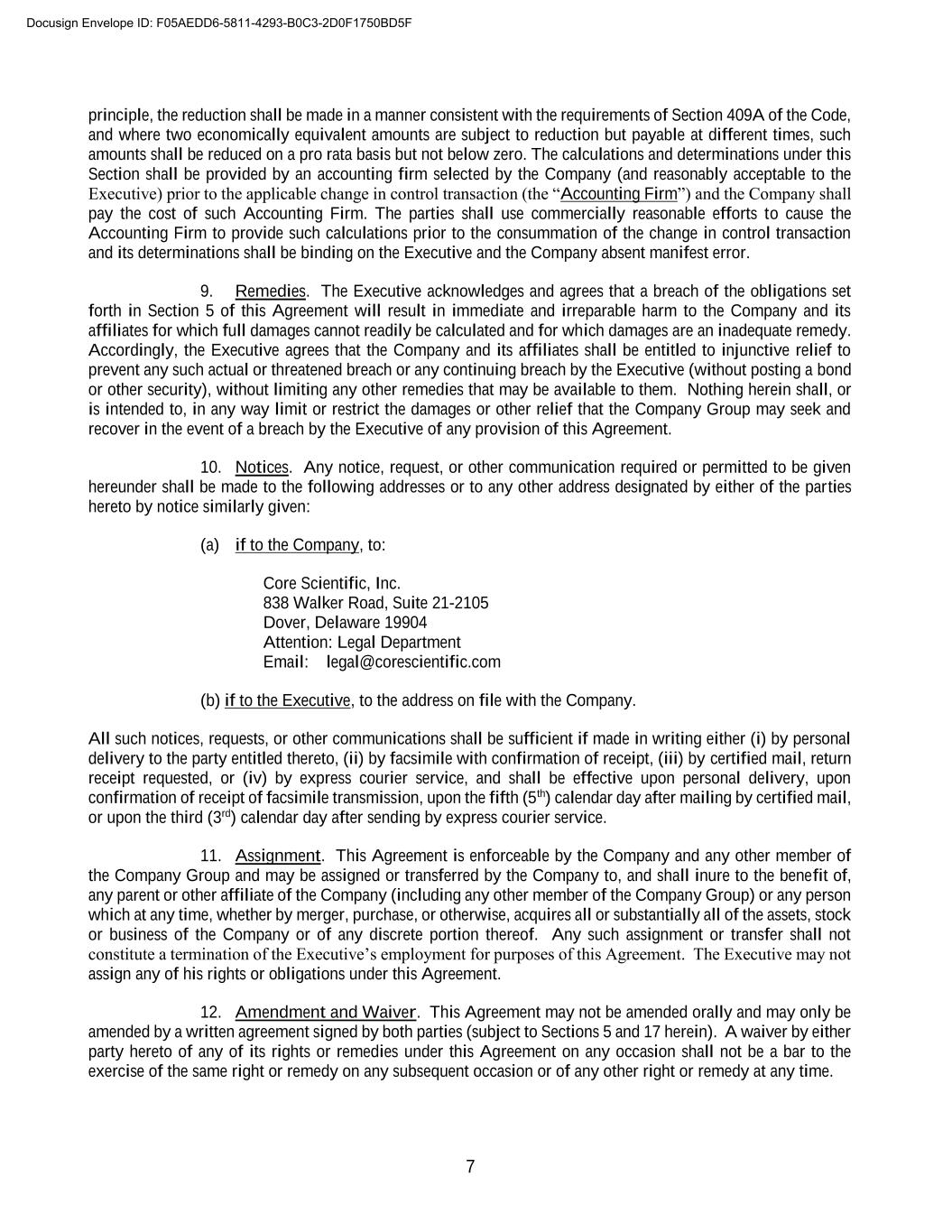 7 principle, the reduction shall be made in a manner consistent with the requirements of Section 409A of the Code, and where two economically equivalent amounts are subject to reduction but payable at different times, such amounts shall be reduced on a pro rata basis but not below zero. The calculations and determinations under this Section shall be provided by an accounting firm selected by the Company (and reasonably acceptable to the Executive) prior to the applicable change in control transaction (the “Accounting Firm”) and the Company shall pay the cost of such Accounting Firm. The parties shall use commercially reasonable efforts to cause the Accounting Firm to provide such calculations prior to the consummation of the change in control transaction and its determinations shall be binding on the Executive and the Company absent manifest error. 9. Remedies. The Executive acknowledges and agrees that a breach of the obligations set forth in Section 5 of this Agreement will result in immediate and irreparable harm to the Company and its affiliates for which full damages cannot readily be calculated and for which damages are an inadequate remedy. Accordingly, the Executive agrees that the Company and its affiliates shall be entitled to injunctive relief to prevent any such actual or threatened breach or any continuing breach by the Executive (without posting a bond or other security), without limiting any other remedies that may be available to them. Nothing herein shall, or is intended to, in any way limit or restrict the damages or other relief that the Company Group may seek and recover in the event of a breach by the Executive of any provision of this Agreement. 10. Notices. Any notice, request, or other communication required or permitted to be given hereunder shall be made to the following addresses or to any other address designated by either of the parties hereto by notice similarly given: (a) if to the Company, to: Core Scientific, Inc. 838 Walker Road, Suite 21-2105 Dover, Delaware 19904 Attention: Legal Department Email: legal@corescientific.com (b) if to the Executive, to the address on file with the Company. All such notices, requests, or other communications shall be sufficient if made in writing either (i) by personal delivery to the party entitled thereto, (ii) by facsimile with confirmation of receipt, (iii) by certified mail, return receipt requested, or (iv) by express courier service, and shall be effective upon personal delivery, upon confirmation of receipt of facsimile transmission, upon the fifth (5th) calendar day after mailing by certified mail, or upon the third (3rd) calendar day after sending by express courier service. 11. Assignment. This Agreement is enforceable by the Company and any other member of the Company Group and may be assigned or transferred by the Company to, and shall inure to the benefit of, any parent or other affiliate of the Company (including any other member of the Company Group) or any person which at any time, whether by merger, purchase, or otherwise, acquires all or substantially all of the assets, stock or business of the Company or of any discrete portion thereof. Any such assignment or transfer shall not constitute a termination of the Executive’s employment for purposes of this Agreement. The Executive may not assign any of his rights or obligations under this Agreement. 12. Amendment and Waiver. This Agreement may not be amended orally and may only be amended by a written agreement signed by both parties (subject to Sections 5 and 17 herein). A waiver by either party hereto of any of its rights or remedies under this Agreement on any occasion shall not be a bar to the exercise of the same right or remedy on any subsequent occasion or of any other right or remedy at any time. Docusign Envelope ID: F05AEDD6-5811-4293-B0C3-2D0F1750BD5F