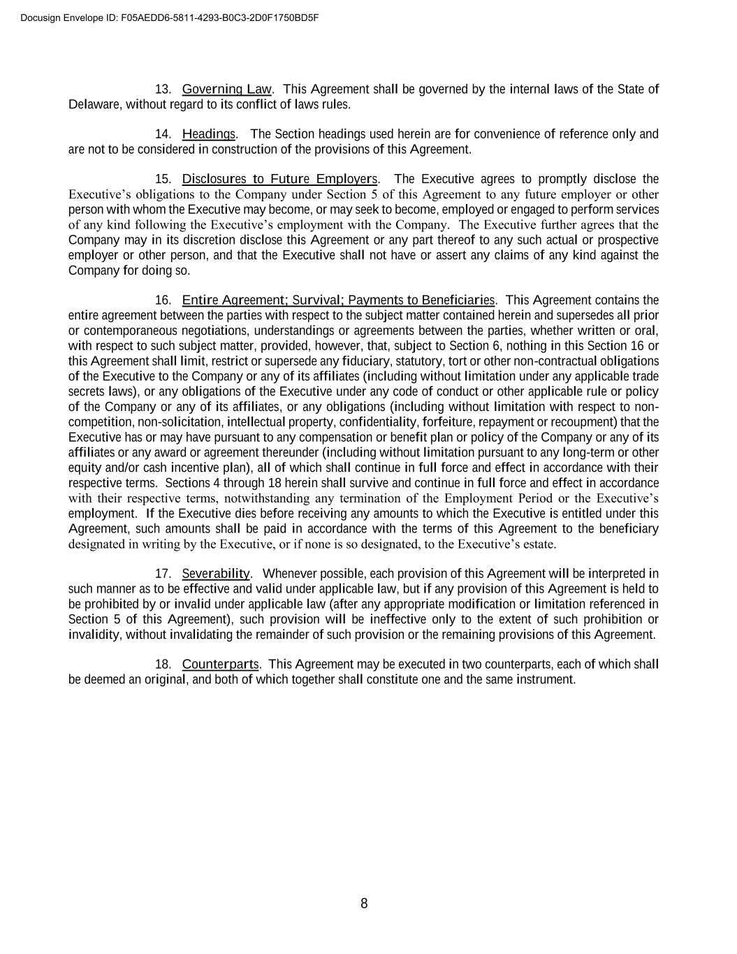 8 13. Governing Law. This Agreement shall be governed by the internal laws of the State of Delaware, without regard to its conflict of laws rules. 14. Headings. The Section headings used herein are for convenience of reference only and are not to be considered in construction of the provisions of this Agreement. 15. Disclosures to Future Employers. The Executive agrees to promptly disclose the Executive’s obligations to the Company under Section 5 of this Agreement to any future employer or other person with whom the Executive may become, or may seek to become, employed or engaged to perform services of any kind following the Executive’s employment with the Company. The Executive further agrees that the Company may in its discretion disclose this Agreement or any part thereof to any such actual or prospective employer or other person, and that the Executive shall not have or assert any claims of any kind against the Company for doing so. 16. Entire Agreement; Survival; Payments to Beneficiaries. This Agreement contains the entire agreement between the parties with respect to the subject matter contained herein and supersedes all prior or contemporaneous negotiations, understandings or agreements between the parties, whether written or oral, with respect to such subject matter, provided, however, that, subject to Section 6, nothing in this Section 16 or this Agreement shall limit, restrict or supersede any fiduciary, statutory, tort or other non-contractual obligations of the Executive to the Company or any of its affiliates (including without limitation under any applicable trade secrets laws), or any obligations of the Executive under any code of conduct or other applicable rule or policy of the Company or any of its affiliates, or any obligations (including without limitation with respect to non- competition, non-solicitation, intellectual property, confidentiality, forfeiture, repayment or recoupment) that the Executive has or may have pursuant to any compensation or benefit plan or policy of the Company or any of its affiliates or any award or agreement thereunder (including without limitation pursuant to any long-term or other equity and/or cash incentive plan), all of which shall continue in full force and effect in accordance with their respective terms. Sections 4 through 18 herein shall survive and continue in full force and effect in accordance with their respective terms, notwithstanding any termination of the Employment Period or the Executive’s employment. If the Executive dies before receiving any amounts to which the Executive is entitled under this Agreement, such amounts shall be paid in accordance with the terms of this Agreement to the beneficiary designated in writing by the Executive, or if none is so designated, to the Executive’s estate. 17. Severability. Whenever possible, each provision of this Agreement will be interpreted in such manner as to be effective and valid under applicable law, but if any provision of this Agreement is held to be prohibited by or invalid under applicable law (after any appropriate modification or limitation referenced in Section 5 of this Agreement), such provision will be ineffective only to the extent of such prohibition or invalidity, without invalidating the remainder of such provision or the remaining provisions of this Agreement. 18. Counterparts. This Agreement may be executed in two counterparts, each of which shall be deemed an original, and both of which together shall constitute one and the same instrument. Docusign Envelope ID: F05AEDD6-5811-4293-B0C3-2D0F1750BD5F