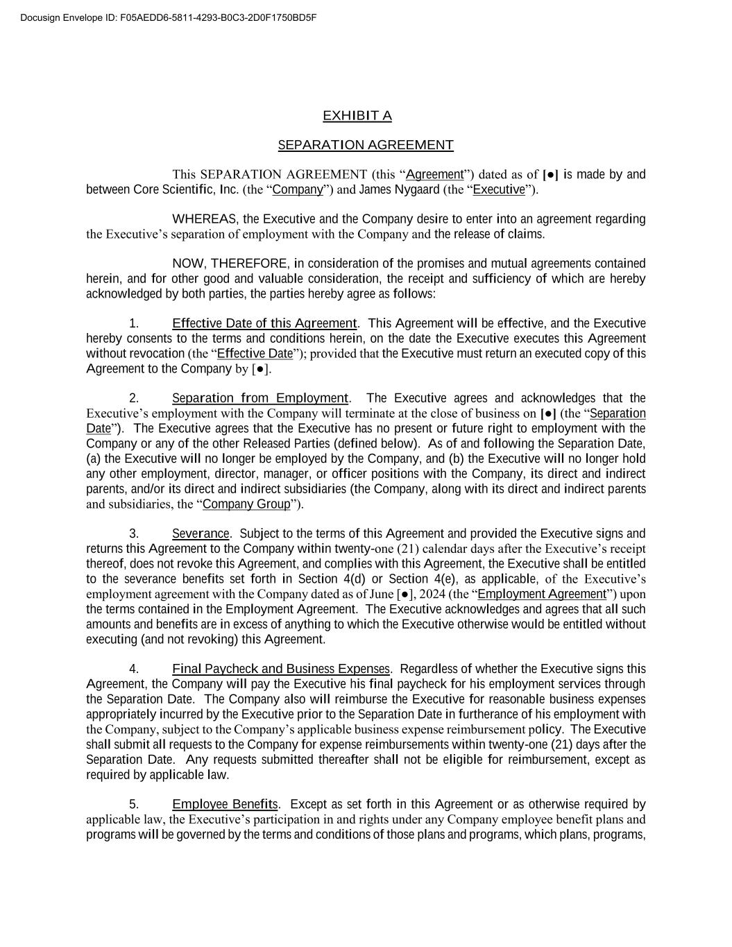 EXHIBIT A SEPARATION AGREEMENT This SEPARATION AGREEMENT (this “Agreement”) dated as of [●] is made by and between Core Scientific, Inc. (the “Company”) and James Nygaard (the “Executive”). WHEREAS, the Executive and the Company desire to enter into an agreement regarding the Executive’s separation of employment with the Company and the release of claims. NOW, THEREFORE, in consideration of the promises and mutual agreements contained herein, and for other good and valuable consideration, the receipt and sufficiency of which are hereby acknowledged by both parties, the parties hereby agree as follows: 1. Effective Date of this Agreement. This Agreement will be effective, and the Executive hereby consents to the terms and conditions herein, on the date the Executive executes this Agreement without revocation (the “Effective Date”); provided that the Executive must return an executed copy of this Agreement to the Company by [●]. 2. Separation from Employment. The Executive agrees and acknowledges that the Executive’s employment with the Company will terminate at the close of business on [●] (the “Separation Date”). The Executive agrees that the Executive has no present or future right to employment with the Company or any of the other Released Parties (defined below). As of and following the Separation Date, (a) the Executive will no longer be employed by the Company, and (b) the Executive will no longer hold any other employment, director, manager, or officer positions with the Company, its direct and indirect parents, and/or its direct and indirect subsidiaries (the Company, along with its direct and indirect parents and subsidiaries, the “Company Group”). 3. Severance. Subject to the terms of this Agreement and provided the Executive signs and returns this Agreement to the Company within twenty-one (21) calendar days after the Executive’s receipt thereof, does not revoke this Agreement, and complies with this Agreement, the Executive shall be entitled to the severance benefits set forth in Section 4(d) or Section 4(e), as applicable, of the Executive’s employment agreement with the Company dated as of June [●], 2024 (the “Employment Agreement”) upon the terms contained in the Employment Agreement. The Executive acknowledges and agrees that all such amounts and benefits are in excess of anything to which the Executive otherwise would be entitled without executing (and not revoking) this Agreement. 4. Final Paycheck and Business Expenses. Regardless of whether the Executive signs this Agreement, the Company will pay the Executive his final paycheck for his employment services through the Separation Date. The Company also will reimburse the Executive for reasonable business expenses appropriately incurred by the Executive prior to the Separation Date in furtherance of his employment with the Company, subject to the Company’s applicable business expense reimbursement policy. The Executive shall submit all requests to the Company for expense reimbursements within twenty-one (21) days after the Separation Date. Any requests submitted thereafter shall not be eligible for reimbursement, except as required by applicable law. 5. Employee Benefits. Except as set forth in this Agreement or as otherwise required by applicable law, the Executive’s participation in and rights under any Company employee benefit plans and programs will be governed by the terms and conditions of those plans and programs, which plans, programs, Docusign Envelope ID: F05AEDD6-5811-4293-B0C3-2D0F1750BD5F