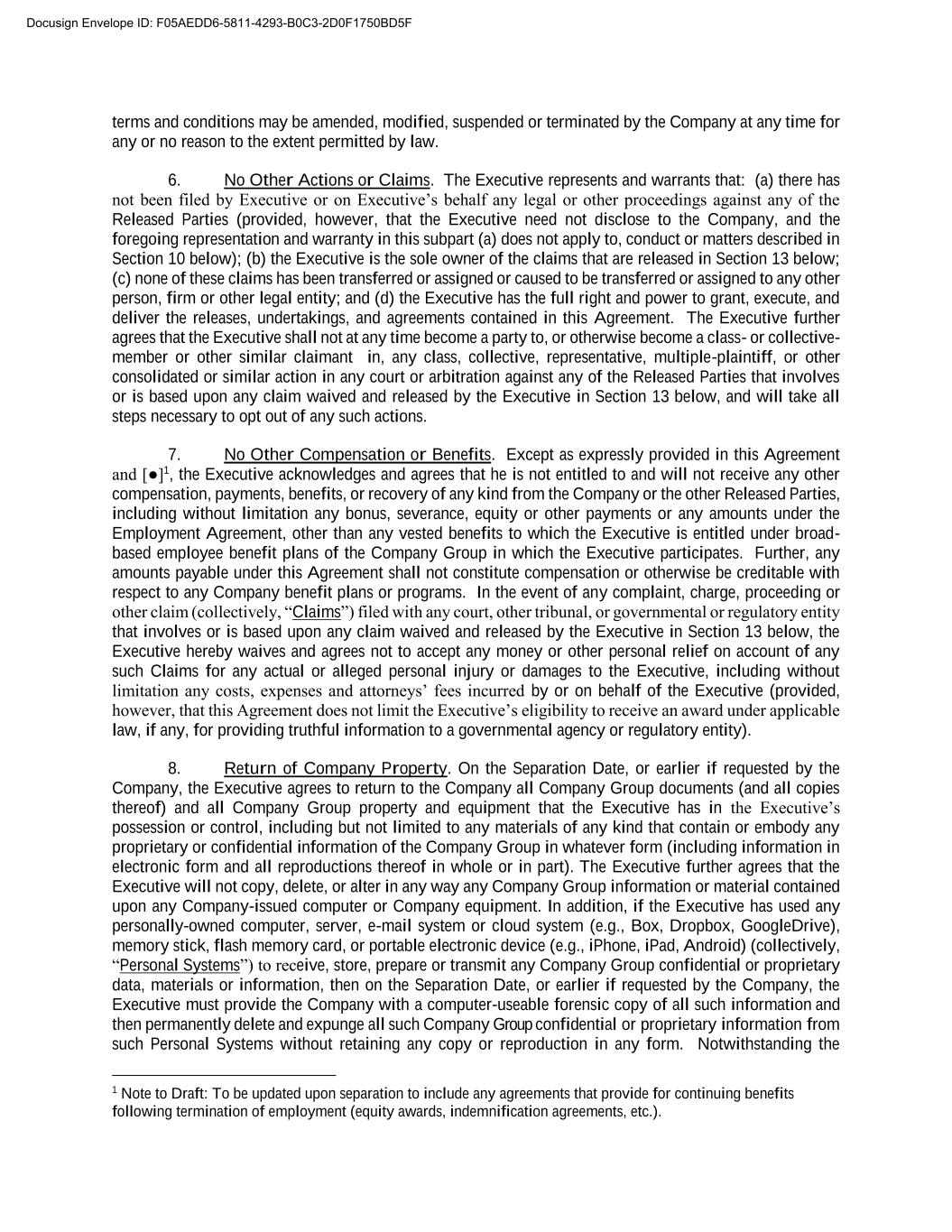 terms and conditions may be amended, modified, suspended or terminated by the Company at any time for any or no reason to the extent permitted by law. 6. No Other Actions or Claims. The Executive represents and warrants that: (a) there has not been filed by Executive or on Executive’s behalf any legal or other proceedings against any of the Released Parties (provided, however, that the Executive need not disclose to the Company, and the foregoing representation and warranty in this subpart (a) does not apply to, conduct or matters described in Section 10 below); (b) the Executive is the sole owner of the claims that are released in Section 13 below; (c) none of these claims has been transferred or assigned or caused to be transferred or assigned to any other person, firm or other legal entity; and (d) the Executive has the full right and power to grant, execute, and deliver the releases, undertakings, and agreements contained in this Agreement. The Executive further agrees that the Executive shall not at any time become a party to, or otherwise become a class- or collective- member or other similar claimant in, any class, collective, representative, multiple-plaintiff, or other consolidated or similar action in any court or arbitration against any of the Released Parties that involves or is based upon any claim waived and released by the Executive in Section 13 below, and will take all steps necessary to opt out of any such actions. 7. No Other Compensation or Benefits. Except as expressly provided in this Agreement and [●]1, the Executive acknowledges and agrees that he is not entitled to and will not receive any other compensation, payments, benefits, or recovery of any kind from the Company or the other Released Parties, including without limitation any bonus, severance, equity or other payments or any amounts under the Employment Agreement, other than any vested benefits to which the Executive is entitled under broad- based employee benefit plans of the Company Group in which the Executive participates. Further, any amounts payable under this Agreement shall not constitute compensation or otherwise be creditable with respect to any Company benefit plans or programs. In the event of any complaint, charge, proceeding or other claim (collectively, “Claims”) filed with any court, other tribunal, or governmental or regulatory entity that involves or is based upon any claim waived and released by the Executive in Section 13 below, the Executive hereby waives and agrees not to accept any money or other personal relief on account of any such Claims for any actual or alleged personal injury or damages to the Executive, including without limitation any costs, expenses and attorneys’ fees incurred by or on behalf of the Executive (provided, however, that this Agreement does not limit the Executive’s eligibility to receive an award under applicable law, if any, for providing truthful information to a governmental agency or regulatory entity). 8. Return of Company Property. On the Separation Date, or earlier if requested by the Company, the Executive agrees to return to the Company all Company Group documents (and all copies thereof) and all Company Group property and equipment that the Executive has in the Executive’s possession or control, including but not limited to any materials of any kind that contain or embody any proprietary or confidential information of the Company Group in whatever form (including information in electronic form and all reproductions thereof in whole or in part). The Executive further agrees that the Executive will not copy, delete, or alter in any way any Company Group information or material contained upon any Company-issued computer or Company equipment. In addition, if the Executive has used any personally-owned computer, server, e-mail system or cloud system (e.g., Box, Dropbox, GoogleDrive), memory stick, flash memory card, or portable electronic device (e.g., iPhone, iPad, Android) (collectively, “Personal Systems”) to receive, store, prepare or transmit any Company Group confidential or proprietary data, materials or information, then on the Separation Date, or earlier if requested by the Company, the Executive must provide the Company with a computer-useable forensic copy of all such information and then permanently delete and expunge all such Company Group confidential or proprietary information from such Personal Systems without retaining any copy or reproduction in any form. Notwithstanding the 1 Note to Draft: To be updated upon separation to include any agreements that provide for continuing benefits following termination of employment (equity awards, indemnification agreements, etc.). Docusign Envelope ID: F05AEDD6-5811-4293-B0C3-2D0F1750BD5F