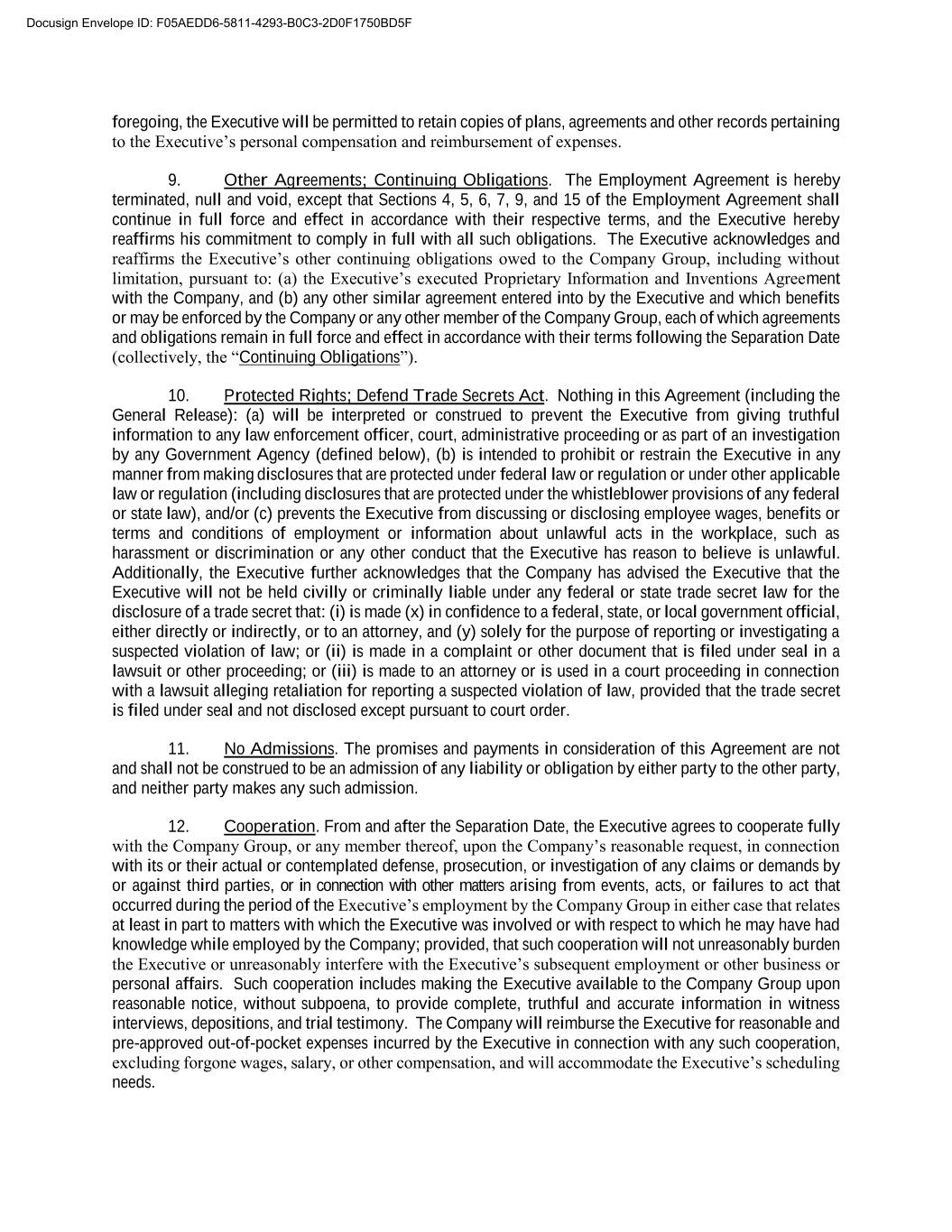 foregoing, the Executive will be permitted to retain copies of plans, agreements and other records pertaining to the Executive’s personal compensation and reimbursement of expenses. 9. Other Agreements; Continuing Obligations. The Employment Agreement is hereby terminated, null and void, except that Sections 4, 5, 6, 7, 9, and 15 of the Employment Agreement shall continue in full force and effect in accordance with their respective terms, and the Executive hereby reaffirms his commitment to comply in full with all such obligations. The Executive acknowledges and reaffirms the Executive’s other continuing obligations owed to the Company Group, including without limitation, pursuant to: (a) the Executive’s executed Proprietary Information and Inventions Agreement with the Company, and (b) any other similar agreement entered into by the Executive and which benefits or may be enforced by the Company or any other member of the Company Group, each of which agreements and obligations remain in full force and effect in accordance with their terms following the Separation Date (collectively, the “Continuing Obligations”). 10. Protected Rights; Defend Trade Secrets Act. Nothing in this Agreement (including the General Release): (a) will be interpreted or construed to prevent the Executive from giving truthful information to any law enforcement officer, court, administrative proceeding or as part of an investigation by any Government Agency (defined below), (b) is intended to prohibit or restrain the Executive in any manner from making disclosures that are protected under federal law or regulation or under other applicable law or regulation (including disclosures that are protected under the whistleblower provisions of any federal or state law), and/or (c) prevents the Executive from discussing or disclosing employee wages, benefits or terms and conditions of employment or information about unlawful acts in the workplace, such as harassment or discrimination or any other conduct that the Executive has reason to believe is unlawful. Additionally, the Executive further acknowledges that the Company has advised the Executive that the Executive will not be held civilly or criminally liable under any federal or state trade secret law for the disclosure of a trade secret that: (i) is made (x) in confidence to a federal, state, or local government official, either directly or indirectly, or to an attorney, and (y) solely for the purpose of reporting or investigating a suspected violation of law; or (ii) is made in a complaint or other document that is filed under seal in a lawsuit or other proceeding; or (iii) is made to an attorney or is used in a court proceeding in connection with a lawsuit alleging retaliation for reporting a suspected violation of law, provided that the trade secret is filed under seal and not disclosed except pursuant to court order. 11. No Admissions. The promises and payments in consideration of this Agreement are not and shall not be construed to be an admission of any liability or obligation by either party to the other party, and neither party makes any such admission. 12. Cooperation. From and after the Separation Date, the Executive agrees to cooperate fully with the Company Group, or any member thereof, upon the Company’s reasonable request, in connection with its or their actual or contemplated defense, prosecution, or investigation of any claims or demands by or against third parties, or in connection with other matters arising from events, acts, or failures to act that occurred during the period of the Executive’s employment by the Company Group in either case that relates at least in part to matters with which the Executive was involved or with respect to which he may have had knowledge while employed by the Company; provided, that such cooperation will not unreasonably burden the Executive or unreasonably interfere with the Executive’s subsequent employment or other business or personal affairs. Such cooperation includes making the Executive available to the Company Group upon reasonable notice, without subpoena, to provide complete, truthful and accurate information in witness interviews, depositions, and trial testimony. The Company will reimburse the Executive for reasonable and pre-approved out-of-pocket expenses incurred by the Executive in connection with any such cooperation, excluding forgone wages, salary, or other compensation, and will accommodate the Executive’s scheduling needs. Docusign Envelope ID: F05AEDD6-5811-4293-B0C3-2D0F1750BD5F