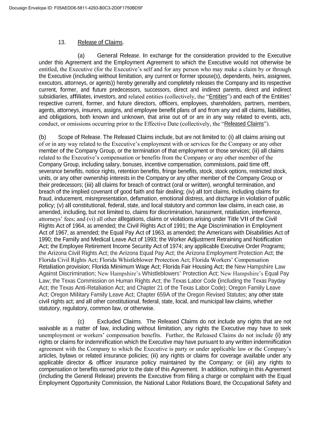 13. Release of Claims. (a) General Release. In exchange for the consideration provided to the Executive under this Agreement and the Employment Agreement to which the Executive would not otherwise be entitled, the Executive (for the Executive’s self and for any person who may make a claim by or through the Executive (including without limitation, any current or former spouse(s), dependents, heirs, assignees, executors, attorneys, or agents)) hereby generally and completely releases the Company and its respective current, former, and future predecessors, successors, direct and indirect parents, direct and indirect subsidiaries, affiliates, investors, and related entities (collectively, the “Entities”) and each of the Entities’ respective current, former, and future directors, officers, employees, shareholders, partners, members, agents, attorneys, insurers, assigns, and employee benefit plans of and from any and all claims, liabilities, and obligations, both known and unknown, that arise out of or are in any way related to events, acts, conduct, or omissions occurring prior to the Effective Date (collectively, the “Released Claims”). (b) Scope of Release. The Released Claims include, but are not limited to: (i) all claims arising out of or in any way related to the Executive’s employment with or services for the Company or any other member of the Company Group, or the termination of that employment or those services; (ii) all claims related to the Executive’s compensation or benefits from the Company or any other member of the Company Group, including salary, bonuses, incentive compensation, commissions, paid time off, severance benefits, notice rights, retention benefits, fringe benefits, stock, stock options, restricted stock, units, or any other ownership interests in the Company or any other member of the Company Group or their predecessors; (iii) all claims for breach of contract (oral or written), wrongful termination, and breach of the implied covenant of good faith and fair dealing; (iv) all tort claims, including claims for fraud, inducement, misrepresentation, defamation, emotional distress, and discharge in violation of public policy; (v) all constitutional, federal, state, and local statutory and common law claims, in each case, as amended, including, but not limited to, claims for discrimination, harassment, retaliation, interference, attorneys’ fees; and (vi) all other allegations, claims or violations arising under Title VII of the Civil Rights Act of 1964, as amended; the Civil Rights Act of 1991; the Age Discrimination in Employment Act of 1967, as amended; the Equal Pay Act of 1963, as amended; the Americans with Disabilities Act of 1990; the Family and Medical Leave Act of 1993; the Worker Adjustment Retraining and Notification Act; the Employee Retirement Income Security Act of 1974; any applicable Executive Order Programs; the Arizona Civil Rights Act; the Arizona Equal Pay Act; the Arizona Employment Protection Act; the Florida Civil Rights Act; Florida Whistleblower Protection Act; Florida Workers’ Compensation Retaliation provision; Florida Minimum Wage Act; Florida Fair Housing Act; the New Hampshire Law Against Discrimination; New Hampshire’s Whistleblowers’ Protection Act; New Hampshire’s Equal Pay Law; the Texas Commission on Human Rights Act; the Texas Labor Code (including the Texas Payday Act; the Texas Anti-Retaliation Act; and Chapter 21 of the Texas Labor Code); Oregon Family Leave Act; Oregon Military Family Leave Act; Chapter 659A of the Oregon Revised Statutes; any other state civil rights act; and all other constitutional, federal, state, local, and municipal law claims, whether statutory, regulatory, common law, or otherwise. (c) Excluded Claims. The Released Claims do not include any rights that are not waivable as a matter of law, including without limitation, any rights the Executive may have to seek unemployment or workers’ compensation benefits. Further, the Released Claims do not include (i) any rights or claims for indemnification which the Executive may have pursuant to any written indemnification agreement with the Company to which the Executive is party or under applicable law or the Company’s articles, bylaws or related insurance policies; (ii) any rights or claims for coverage available under any applicable director & officer insurance policy maintained by the Company; or (iii) any rights to compensation or benefits earned prior to the date of this Agreement. In addition, nothing in this Agreement (including the General Release) prevents the Executive from filing a charge or complaint with the Equal Employment Opportunity Commission, the National Labor Relations Board, the Occupational Safety and Docusign Envelope ID: F05AEDD6-5811-4293-B0C3-2D0F1750BD5F