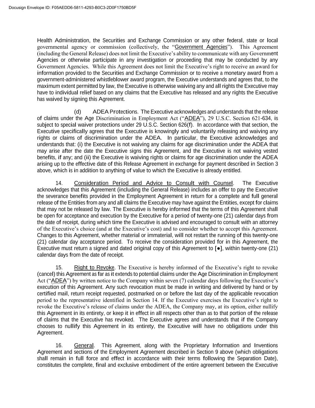 Health Administration, the Securities and Exchange Commission or any other federal, state or local governmental agency or commission (collectively, the “Government Agencies”). This Agreement (including the General Release) does not limit the Executive’s ability to communicate with any Government Agencies or otherwise participate in any investigation or proceeding that may be conducted by any Government Agencies. While this Agreement does not limit the Executive’s right to receive an award for information provided to the Securities and Exchange Commission or to receive a monetary award from a government-administered whistleblower award program, the Executive understands and agrees that, to the maximum extent permitted by law, the Executive is otherwise waiving any and all rights the Executive may have to individual relief based on any claims that the Executive has released and any rights the Executive has waived by signing this Agreement. (d) ADEA Protections. The Executive acknowledges and understands that the release of claims under the Age Discrimination in Employment Act (“ADEA”), 29 U.S.C. Section 621-634, is subject to special waiver protections under 29 U.S.C. Section 626(f). In accordance with that section, the Executive specifically agrees that the Executive is knowingly and voluntarily releasing and waiving any rights or claims of discrimination under the ADEA. In particular, the Executive acknowledges and understands that: (i) the Executive is not waiving any claims for age discrimination under the ADEA that may arise after the date the Executive signs this Agreement, and the Executive is not waiving vested benefits, if any; and (ii) the Executive is waiving rights or claims for age discrimination under the ADEA arising up to the effective date of this Release Agreement in exchange for payment described in Section 3 above, which is in addition to anything of value to which the Executive is already entitled. 14. Consideration Period and Advice to Consult with Counsel. The Executive acknowledges that this Agreement (including the General Release) includes an offer to pay the Executive the severance benefits provided in the Employment Agreement in return for a complete and full general release of the Entities from any and all claims the Executive may have against the Entities, except for claims that may not be released by law. The Executive is hereby informed that the terms of this Agreement shall be open for acceptance and execution by the Executive for a period of twenty-one (21) calendar days from the date of receipt, during which time the Executive is advised and encouraged to consult with an attorney of the Executive’s choice (and at the Executive’s cost) and to consider whether to accept this Agreement. Changes to this Agreement, whether material or immaterial, will not restart the running of this twenty-one (21) calendar day acceptance period. To receive the consideration provided for in this Agreement, the Executive must return a signed and dated original copy of this Agreement to [●], within twenty-one (21) calendar days from the date of receipt. 15. Right to Revoke. The Executive is hereby informed of the Executive’s right to revoke (cancel) this Agreement as far as it extends to potential claims under the Age Discrimination in Employment Act (“ADEA”) by written notice to the Company within seven (7) calendar days following the Executive’s execution of this Agreement. Any such revocation must be made in writing and delivered by hand or by certified mail, return receipt requested, postmarked on or before the last day of the applicable revocation period to the representative identified in Section 14. If the Executive exercises the Executive’s right to revoke the Executive’s release of claims under the ADEA, the Company may, at its option, either nullify this Agreement in its entirety, or keep it in effect in all respects other than as to that portion of the release of claims that the Executive has revoked. The Executive agrees and understands that if the Company chooses to nullify this Agreement in its entirety, the Executive will have no obligations under this Agreement. 16. General. This Agreement, along with the Proprietary Information and Inventions Agreement and sections of the Employment Agreement described in Section 9 above (which obligations shall remain in full force and effect in accordance with their terms following the Separation Date), constitutes the complete, final and exclusive embodiment of the entire agreement between the Executive Docusign Envelope ID: F05AEDD6-5811-4293-B0C3-2D0F1750BD5F