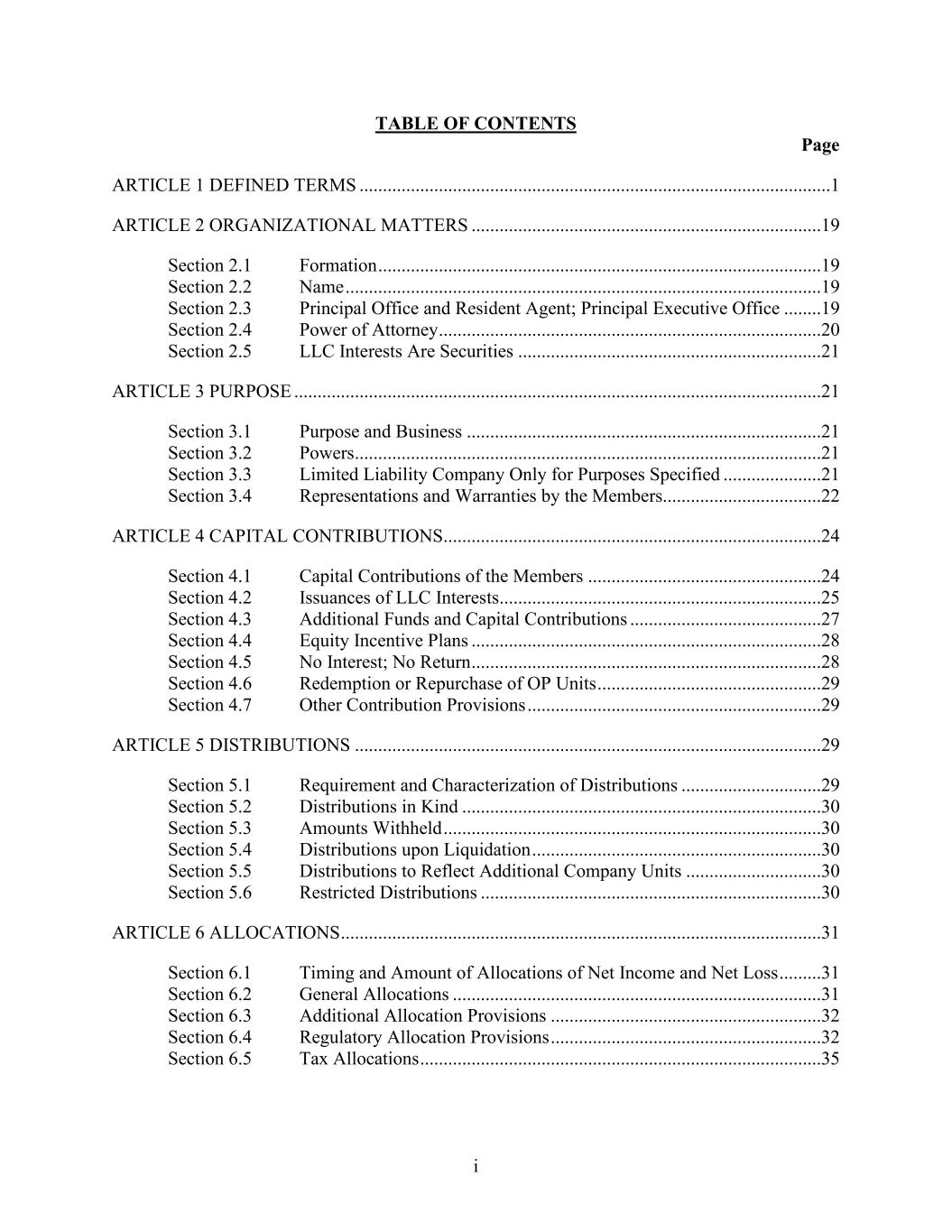 i TABLE OF CONTENTS Page ARTICLE 1 DEFINED TERMS .....................................................................................................1 ARTICLE 2 ORGANIZATIONAL MATTERS ...........................................................................19 Section 2.1 Formation ...............................................................................................19 Section 2.2 Name ......................................................................................................19 Section 2.3 Principal Office and Resident Agent; Principal Executive Office ........19 Section 2.4 Power of Attorney ..................................................................................20 Section 2.5 LLC Interests Are Securities .................................................................21 ARTICLE 3 PURPOSE .................................................................................................................21 Section 3.1 Purpose and Business ............................................................................21 Section 3.2 Powers ....................................................................................................21 Section 3.3 Limited Liability Company Only for Purposes Specified .....................21 Section 3.4 Representations and Warranties by the Members..................................22 ARTICLE 4 CAPITAL CONTRIBUTIONS.................................................................................24 Section 4.1 Capital Contributions of the Members ..................................................24 Section 4.2 Issuances of LLC Interests .....................................................................25 Section 4.3 Additional Funds and Capital Contributions .........................................27 Section 4.4 Equity Incentive Plans ...........................................................................28 Section 4.5 No Interest; No Return ...........................................................................28 Section 4.6 Redemption or Repurchase of OP Units ................................................29 Section 4.7 Other Contribution Provisions ...............................................................29 ARTICLE 5 DISTRIBUTIONS ....................................................................................................29 Section 5.1 Requirement and Characterization of Distributions ..............................29 Section 5.2 Distributions in Kind .............................................................................30 Section 5.3 Amounts Withheld .................................................................................30 Section 5.4 Distributions upon Liquidation ..............................................................30 Section 5.5 Distributions to Reflect Additional Company Units .............................30 Section 5.6 Restricted Distributions .........................................................................30 ARTICLE 6 ALLOCATIONS .......................................................................................................31 Section 6.1 Timing and Amount of Allocations of Net Income and Net Loss .........31 Section 6.2 General Allocations ...............................................................................31 Section 6.3 Additional Allocation Provisions ..........................................................32 Section 6.4 Regulatory Allocation Provisions ..........................................................32 Section 6.5 Tax Allocations ......................................................................................35