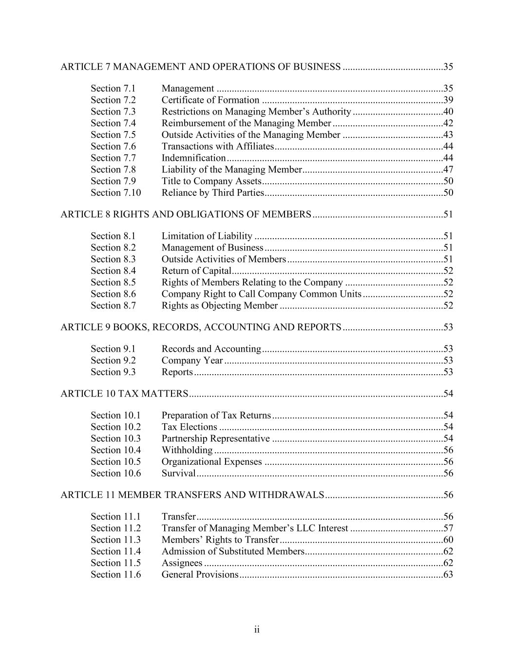 ii ARTICLE 7 MANAGEMENT AND OPERATIONS OF BUSINESS ........................................35 Section 7.1 Management ..........................................................................................35 Section 7.2 Certificate of Formation ........................................................................39 Section 7.3 Restrictions on Managing Member’s Authority ....................................40 Section 7.4 Reimbursement of the Managing Member ............................................42 Section 7.5 Outside Activities of the Managing Member ........................................43 Section 7.6 Transactions with Affiliates ...................................................................44 Section 7.7 Indemnification ......................................................................................44 Section 7.8 Liability of the Managing Member ........................................................47 Section 7.9 Title to Company Assets ........................................................................50 Section 7.10 Reliance by Third Parties .......................................................................50 ARTICLE 8 RIGHTS AND OBLIGATIONS OF MEMBERS ....................................................51 Section 8.1 Limitation of Liability ...........................................................................51 Section 8.2 Management of Business .......................................................................51 Section 8.3 Outside Activities of Members ..............................................................51 Section 8.4 Return of Capital ....................................................................................52 Section 8.5 Rights of Members Relating to the Company .......................................52 Section 8.6 Company Right to Call Company Common Units ................................52 Section 8.7 Rights as Objecting Member .................................................................52 ARTICLE 9 BOOKS, RECORDS, ACCOUNTING AND REPORTS ........................................53 Section 9.1 Records and Accounting ........................................................................53 Section 9.2 Company Year .......................................................................................53 Section 9.3 Reports ...................................................................................................53 ARTICLE 10 TAX MATTERS .....................................................................................................54 Section 10.1 Preparation of Tax Returns ....................................................................54 Section 10.2 Tax Elections .........................................................................................54 Section 10.3 Partnership Representative ....................................................................54 Section 10.4 Withholding ...........................................................................................56 Section 10.5 Organizational Expenses .......................................................................56 Section 10.6 Survival ..................................................................................................56 ARTICLE 11 MEMBER TRANSFERS AND WITHDRAWALS ...............................................56 Section 11.1 Transfer ..................................................................................................56 Section 11.2 Transfer of Managing Member’s LLC Interest .....................................57 Section 11.3 Members’ Rights to Transfer .................................................................60 Section 11.4 Admission of Substituted Members .......................................................62 Section 11.5 Assignees ...............................................................................................62 Section 11.6 General Provisions .................................................................................63