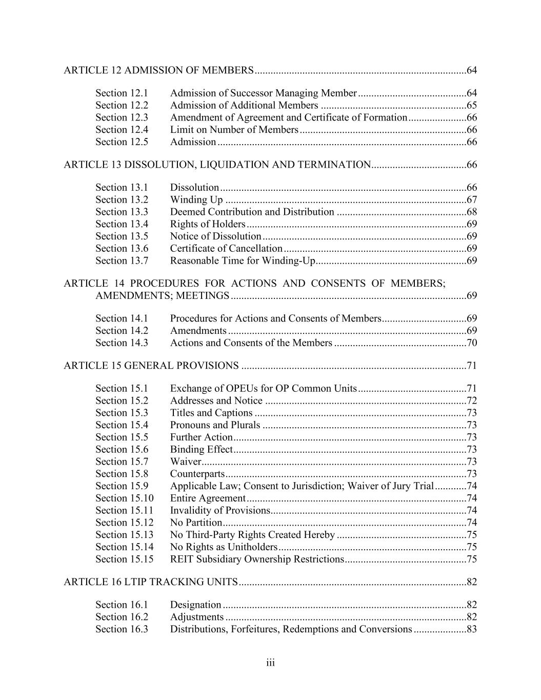 iii ARTICLE 12 ADMISSION OF MEMBERS ................................................................................64 Section 12.1 Admission of Successor Managing Member .........................................64 Section 12.2 Admission of Additional Members .......................................................65 Section 12.3 Amendment of Agreement and Certificate of Formation ......................66 Section 12.4 Limit on Number of Members ...............................................................66 Section 12.5 Admission ..............................................................................................66 ARTICLE 13 DISSOLUTION, LIQUIDATION AND TERMINATION....................................66 Section 13.1 Dissolution .............................................................................................66 Section 13.2 Winding Up ...........................................................................................67 Section 13.3 Deemed Contribution and Distribution .................................................68 Section 13.4 Rights of Holders ...................................................................................69 Section 13.5 Notice of Dissolution .............................................................................69 Section 13.6 Certificate of Cancellation .....................................................................69 Section 13.7 Reasonable Time for Winding-Up .........................................................69 ARTICLE 14 PROCEDURES FOR ACTIONS AND CONSENTS OF MEMBERS; AMENDMENTS; MEETINGS .........................................................................................69 Section 14.1 Procedures for Actions and Consents of Members ................................69 Section 14.2 Amendments ..........................................................................................69 Section 14.3 Actions and Consents of the Members ..................................................70 ARTICLE 15 GENERAL PROVISIONS .....................................................................................71 Section 15.1 Exchange of OPEUs for OP Common Units .........................................71 Section 15.2 Addresses and Notice ............................................................................72 Section 15.3 Titles and Captions ................................................................................73 Section 15.4 Pronouns and Plurals .............................................................................73 Section 15.5 Further Action ........................................................................................73 Section 15.6 Binding Effect ........................................................................................73 Section 15.7 Waiver ....................................................................................................73 Section 15.8 Counterparts ...........................................................................................73 Section 15.9 Applicable Law; Consent to Jurisdiction; Waiver of Jury Trial ............74 Section 15.10 Entire Agreement ...................................................................................74 Section 15.11 Invalidity of Provisions ..........................................................................74 Section 15.12 No Partition ............................................................................................74 Section 15.13 No Third-Party Rights Created Hereby .................................................75 Section 15.14 No Rights as Unitholders .......................................................................75 Section 15.15 REIT Subsidiary Ownership Restrictions ..............................................75 ARTICLE 16 LTIP TRACKING UNITS ......................................................................................82 Section 16.1 Designation ............................................................................................82 Section 16.2 Adjustments ...........................................................................................82 Section 16.3 Distributions, Forfeitures, Redemptions and Conversions ....................83