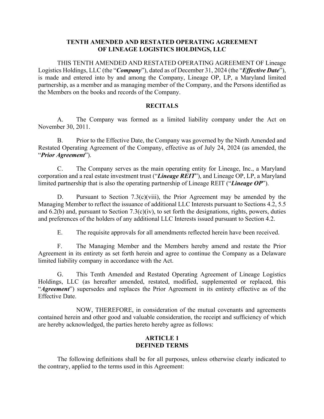 TENTH AMENDED AND RESTATED OPERATING AGREEMENT OF LINEAGE LOGISTICS HOLDINGS, LLC THIS TENTH AMENDED AND RESTATED OPERATING AGREEMENT OF Lineage Logistics Holdings, LLC (the “Company”), dated as of December 31, 2024 (the “Effective Date”), is made and entered into by and among the Company, Lineage OP, LP, a Maryland limited partnership, as a member and as managing member of the Company, and the Persons identified as the Members on the books and records of the Company. RECITALS A. The Company was formed as a limited liability company under the Act on November 30, 2011. B. Prior to the Effective Date, the Company was governed by the Ninth Amended and Restated Operating Agreement of the Company, effective as of July 24, 2024 (as amended, the “Prior Agreement”). C. The Company serves as the main operating entity for Lineage, Inc., a Maryland corporation and a real estate investment trust (“Lineage REIT”), and Lineage OP, LP, a Maryland limited partnership that is also the operating partnership of Lineage REIT (“Lineage OP”). D. Pursuant to Section 7.3(c)(viii), the Prior Agreement may be amended by the Managing Member to reflect the issuance of additional LLC Interests pursuant to Sections 4.2, 5.5 and 6.2(b) and, pursuant to Section 7.3(c)(iv), to set forth the designations, rights, powers, duties and preferences of the holders of any additional LLC Interests issued pursuant to Section 4.2. E. The requisite approvals for all amendments reflected herein have been received. F. The Managing Member and the Members hereby amend and restate the Prior Agreement in its entirety as set forth herein and agree to continue the Company as a Delaware limited liability company in accordance with the Act. G. This Tenth Amended and Restated Operating Agreement of Lineage Logistics Holdings, LLC (as hereafter amended, restated, modified, supplemented or replaced, this “Agreement”) supersedes and replaces the Prior Agreement in its entirety effective as of the Effective Date. NOW, THEREFORE, in consideration of the mutual covenants and agreements contained herein and other good and valuable consideration, the receipt and sufficiency of which are hereby acknowledged, the parties hereto hereby agree as follows: ARTICLE 1 DEFINED TERMS The following definitions shall be for all purposes, unless otherwise clearly indicated to the contrary, applied to the terms used in this Agreement: