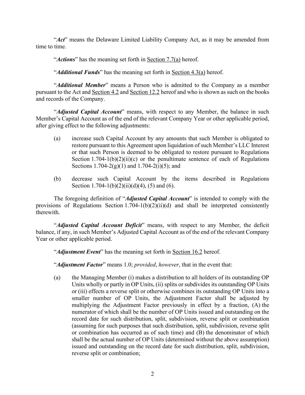 2 “Act” means the Delaware Limited Liability Company Act, as it may be amended from time to time. “Actions” has the meaning set forth in Section 7.7(a) hereof. “Additional Funds” has the meaning set forth in Section 4.3(a) hereof. “Additional Member” means a Person who is admitted to the Company as a member pursuant to the Act and Section 4.2 and Section 12.2 hereof and who is shown as such on the books and records of the Company. “Adjusted Capital Account” means, with respect to any Member, the balance in such Member’s Capital Account as of the end of the relevant Company Year or other applicable period, after giving effect to the following adjustments: (a) increase such Capital Account by any amounts that such Member is obligated to restore pursuant to this Agreement upon liquidation of such Member’s LLC Interest or that such Person is deemed to be obligated to restore pursuant to Regulations Section 1.704-1(b)(2)(ii)(c) or the penultimate sentence of each of Regulations Sections 1.704-2(g)(1) and 1.704-2(i)(5); and (b) decrease such Capital Account by the items described in Regulations Section 1.704-1(b)(2)(ii)(d)(4), (5) and (6). The foregoing definition of “Adjusted Capital Account” is intended to comply with the provisions of Regulations Section 1.704-1(b)(2)(ii)(d) and shall be interpreted consistently therewith. “Adjusted Capital Account Deficit” means, with respect to any Member, the deficit balance, if any, in such Member’s Adjusted Capital Account as of the end of the relevant Company Year or other applicable period. “Adjustment Event” has the meaning set forth in Section 16.2 hereof. “Adjustment Factor” means 1.0; provided, however, that in the event that: (a) the Managing Member (i) makes a distribution to all holders of its outstanding OP Units wholly or partly in OP Units, (ii) splits or subdivides its outstanding OP Units or (iii) effects a reverse split or otherwise combines its outstanding OP Units into a smaller number of OP Units, the Adjustment Factor shall be adjusted by multiplying the Adjustment Factor previously in effect by a fraction, (A) the numerator of which shall be the number of OP Units issued and outstanding on the record date for such distribution, split, subdivision, reverse split or combination (assuming for such purposes that such distribution, split, subdivision, reverse split or combination has occurred as of such time) and (B) the denominator of which shall be the actual number of OP Units (determined without the above assumption) issued and outstanding on the record date for such distribution, split, subdivision, reverse split or combination;
