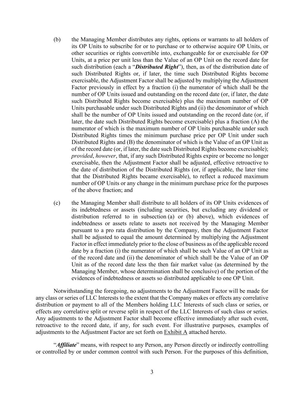 3 (b) the Managing Member distributes any rights, options or warrants to all holders of its OP Units to subscribe for or to purchase or to otherwise acquire OP Units, or other securities or rights convertible into, exchangeable for or exercisable for OP Units, at a price per unit less than the Value of an OP Unit on the record date for such distribution (each a “Distributed Right”), then, as of the distribution date of such Distributed Rights or, if later, the time such Distributed Rights become exercisable, the Adjustment Factor shall be adjusted by multiplying the Adjustment Factor previously in effect by a fraction (i) the numerator of which shall be the number of OP Units issued and outstanding on the record date (or, if later, the date such Distributed Rights become exercisable) plus the maximum number of OP Units purchasable under such Distributed Rights and (ii) the denominator of which shall be the number of OP Units issued and outstanding on the record date (or, if later, the date such Distributed Rights become exercisable) plus a fraction (A) the numerator of which is the maximum number of OP Units purchasable under such Distributed Rights times the minimum purchase price per OP Unit under such Distributed Rights and (B) the denominator of which is the Value of an OP Unit as of the record date (or, if later, the date such Distributed Rights become exercisable); provided, however, that, if any such Distributed Rights expire or become no longer exercisable, then the Adjustment Factor shall be adjusted, effective retroactive to the date of distribution of the Distributed Rights (or, if applicable, the later time that the Distributed Rights became exercisable), to reflect a reduced maximum number of OP Units or any change in the minimum purchase price for the purposes of the above fraction; and (c) the Managing Member shall distribute to all holders of its OP Units evidences of its indebtedness or assets (including securities, but excluding any dividend or distribution referred to in subsection (a) or (b) above), which evidences of indebtedness or assets relate to assets not received by the Managing Member pursuant to a pro rata distribution by the Company, then the Adjustment Factor shall be adjusted to equal the amount determined by multiplying the Adjustment Factor in effect immediately prior to the close of business as of the applicable record date by a fraction (i) the numerator of which shall be such Value of an OP Unit as of the record date and (ii) the denominator of which shall be the Value of an OP Unit as of the record date less the then fair market value (as determined by the Managing Member, whose determination shall be conclusive) of the portion of the evidences of indebtedness or assets so distributed applicable to one OP Unit. Notwithstanding the foregoing, no adjustments to the Adjustment Factor will be made for any class or series of LLC Interests to the extent that the Company makes or effects any correlative distribution or payment to all of the Members holding LLC Interests of such class or series, or effects any correlative split or reverse split in respect of the LLC Interests of such class or series. Any adjustments to the Adjustment Factor shall become effective immediately after such event, retroactive to the record date, if any, for such event. For illustrative purposes, examples of adjustments to the Adjustment Factor are set forth on Exhibit A attached hereto. “Affiliate” means, with respect to any Person, any Person directly or indirectly controlling or controlled by or under common control with such Person. For the purposes of this definition,