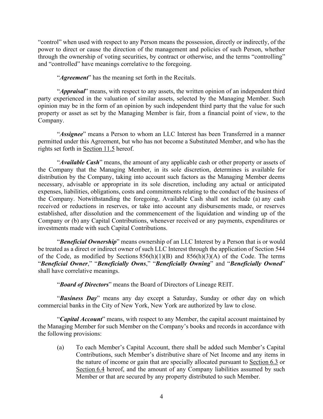 4 “control” when used with respect to any Person means the possession, directly or indirectly, of the power to direct or cause the direction of the management and policies of such Person, whether through the ownership of voting securities, by contract or otherwise, and the terms “controlling” and “controlled” have meanings correlative to the foregoing. “Agreement” has the meaning set forth in the Recitals. “Appraisal” means, with respect to any assets, the written opinion of an independent third party experienced in the valuation of similar assets, selected by the Managing Member. Such opinion may be in the form of an opinion by such independent third party that the value for such property or asset as set by the Managing Member is fair, from a financial point of view, to the Company. “Assignee” means a Person to whom an LLC Interest has been Transferred in a manner permitted under this Agreement, but who has not become a Substituted Member, and who has the rights set forth in Section 11.5 hereof. “Available Cash” means, the amount of any applicable cash or other property or assets of the Company that the Managing Member, in its sole discretion, determines is available for distribution by the Company, taking into account such factors as the Managing Member deems necessary, advisable or appropriate in its sole discretion, including any actual or anticipated expenses, liabilities, obligations, costs and commitments relating to the conduct of the business of the Company. Notwithstanding the foregoing, Available Cash shall not include (a) any cash received or reductions in reserves, or take into account any disbursements made, or reserves established, after dissolution and the commencement of the liquidation and winding up of the Company or (b) any Capital Contributions, whenever received or any payments, expenditures or investments made with such Capital Contributions. “Beneficial Ownership” means ownership of an LLC Interest by a Person that is or would be treated as a direct or indirect owner of such LLC Interest through the application of Section 544 of the Code, as modified by Sections 856(h)(1)(B) and 856(h)(3)(A) of the Code. The terms “Beneficial Owner,” “Beneficially Owns,” “Beneficially Owning” and “Beneficially Owned” shall have correlative meanings. “Board of Directors” means the Board of Directors of Lineage REIT. “Business Day” means any day except a Saturday, Sunday or other day on which commercial banks in the City of New York, New York are authorized by law to close. “Capital Account” means, with respect to any Member, the capital account maintained by the Managing Member for such Member on the Company’s books and records in accordance with the following provisions: (a) To each Member’s Capital Account, there shall be added such Member’s Capital Contributions, such Member’s distributive share of Net Income and any items in the nature of income or gain that are specially allocated pursuant to Section 6.3 or Section 6.4 hereof, and the amount of any Company liabilities assumed by such Member or that are secured by any property distributed to such Member.