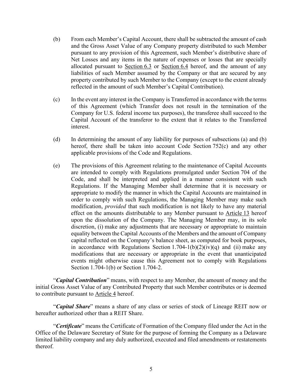 5 (b) From each Member’s Capital Account, there shall be subtracted the amount of cash and the Gross Asset Value of any Company property distributed to such Member pursuant to any provision of this Agreement, such Member’s distributive share of Net Losses and any items in the nature of expenses or losses that are specially allocated pursuant to Section 6.3 or Section 6.4 hereof, and the amount of any liabilities of such Member assumed by the Company or that are secured by any property contributed by such Member to the Company (except to the extent already reflected in the amount of such Member’s Capital Contribution). (c) In the event any interest in the Company is Transferred in accordance with the terms of this Agreement (which Transfer does not result in the termination of the Company for U.S. federal income tax purposes), the transferee shall succeed to the Capital Account of the transferor to the extent that it relates to the Transferred interest. (d) In determining the amount of any liability for purposes of subsections (a) and (b) hereof, there shall be taken into account Code Section 752(c) and any other applicable provisions of the Code and Regulations. (e) The provisions of this Agreement relating to the maintenance of Capital Accounts are intended to comply with Regulations promulgated under Section 704 of the Code, and shall be interpreted and applied in a manner consistent with such Regulations. If the Managing Member shall determine that it is necessary or appropriate to modify the manner in which the Capital Accounts are maintained in order to comply with such Regulations, the Managing Member may make such modification, provided that such modification is not likely to have any material effect on the amounts distributable to any Member pursuant to Article 13 hereof upon the dissolution of the Company. The Managing Member may, in its sole discretion, (i) make any adjustments that are necessary or appropriate to maintain equality between the Capital Accounts of the Members and the amount of Company capital reflected on the Company’s balance sheet, as computed for book purposes, in accordance with Regulations Section 1.704-1(b)(2)(iv)(q) and (ii) make any modifications that are necessary or appropriate in the event that unanticipated events might otherwise cause this Agreement not to comply with Regulations Section 1.704-1(b) or Section 1.704-2. “Capital Contribution” means, with respect to any Member, the amount of money and the initial Gross Asset Value of any Contributed Property that such Member contributes or is deemed to contribute pursuant to Article 4 hereof. “Capital Share” means a share of any class or series of stock of Lineage REIT now or hereafter authorized other than a REIT Share. “Certificate” means the Certificate of Formation of the Company filed under the Act in the Office of the Delaware Secretary of State for the purpose of forming the Company as a Delaware limited liability company and any duly authorized, executed and filed amendments or restatements thereof.