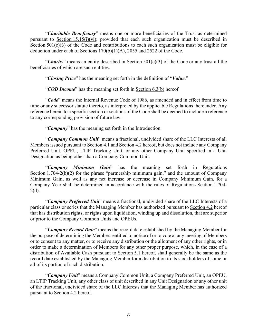 6 “Charitable Beneficiary” means one or more beneficiaries of the Trust as determined pursuant to Section 15.15(i)(vi); provided that each such organization must be described in Section 501(c)(3) of the Code and contributions to each such organization must be eligible for deduction under each of Sections 170(b)(1)(A), 2055 and 2522 of the Code. “Charity” means an entity described in Section 501(c)(3) of the Code or any trust all the beneficiaries of which are such entities. “Closing Price” has the meaning set forth in the definition of “Value.” “COD Income” has the meaning set forth in Section 6.3(b) hereof. “Code” means the Internal Revenue Code of 1986, as amended and in effect from time to time or any successor statute thereto, as interpreted by the applicable Regulations thereunder. Any reference herein to a specific section or sections of the Code shall be deemed to include a reference to any corresponding provision of future law. “Company” has the meaning set forth in the Introduction. “Company Common Unit” means a fractional, undivided share of the LLC Interests of all Members issued pursuant to Section 4.1 and Section 4.2 hereof, but does not include any Company Preferred Unit, OPEU, LTIP Tracking Unit, or any other Company Unit specified in a Unit Designation as being other than a Company Common Unit. “Company Minimum Gain” has the meaning set forth in Regulations Section 1.704-2(b)(2) for the phrase “partnership minimum gain,” and the amount of Company Minimum Gain, as well as any net increase or decrease in Company Minimum Gain, for a Company Year shall be determined in accordance with the rules of Regulations Section 1.704- 2(d). “Company Preferred Unit” means a fractional, undivided share of the LLC Interests of a particular class or series that the Managing Member has authorized pursuant to Section 4.2 hereof that has distribution rights, or rights upon liquidation, winding up and dissolution, that are superior or prior to the Company Common Units and OPEUs. “Company Record Date” means the record date established by the Managing Member for the purpose of determining the Members entitled to notice of or to vote at any meeting of Members or to consent to any matter, or to receive any distribution or the allotment of any other rights, or in order to make a determination of Members for any other proper purpose, which, in the case of a distribution of Available Cash pursuant to Section 5.1 hereof, shall generally be the same as the record date established by the Managing Member for a distribution to its stockholders of some or all of its portion of such distribution. “Company Unit” means a Company Common Unit, a Company Preferred Unit, an OPEU, an LTIP Tracking Unit, any other class of unit described in any Unit Designation or any other unit of the fractional, undivided share of the LLC Interests that the Managing Member has authorized pursuant to Section 4.2 hereof.