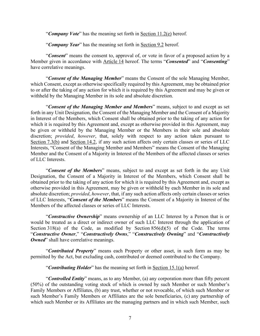 7 “Company Vote” has the meaning set forth in Section 11.2(e) hereof. “Company Year” has the meaning set forth in Section 9.2 hereof. “Consent” means the consent to, approval of, or vote in favor of a proposed action by a Member given in accordance with Article 14 hereof. The terms “Consented” and “Consenting” have correlative meanings. “Consent of the Managing Member” means the Consent of the sole Managing Member, which Consent, except as otherwise specifically required by this Agreement, may be obtained prior to or after the taking of any action for which it is required by this Agreement and may be given or withheld by the Managing Member in its sole and absolute discretion. “Consent of the Managing Member and Members” means, subject to and except as set forth in any Unit Designation, the Consent of the Managing Member and the Consent of a Majority in Interest of the Members, which Consent shall be obtained prior to the taking of any action for which it is required by this Agreement and, except as otherwise provided in this Agreement, may be given or withheld by the Managing Member or the Members in their sole and absolute discretion; provided, however, that, solely with respect to any action taken pursuant to Section 7.3(b) and Section 14.2, if any such action affects only certain classes or series of LLC Interests, “Consent of the Managing Member and Members” means the Consent of the Managing Member and the Consent of a Majority in Interest of the Members of the affected classes or series of LLC Interests. “Consent of the Members” means, subject to and except as set forth in the any Unit Designation, the Consent of a Majority in Interest of the Members, which Consent shall be obtained prior to the taking of any action for which it is required by this Agreement and, except as otherwise provided in this Agreement, may be given or withheld by each Member in its sole and absolute discretion; provided, however, that, if any such action affects only certain classes or series of LLC Interests, “Consent of the Members” means the Consent of a Majority in Interest of the Members of the affected classes or series of LLC Interests. “Constructive Ownership” means ownership of an LLC Interest by a Person that is or would be treated as a direct or indirect owner of such LLC Interest through the application of Section 318(a) of the Code, as modified by Section 856(d)(5) of the Code. The terms “Constructive Owner,” “Constructively Owns,” “Constructively Owning” and “Constructively Owned” shall have correlative meanings. “Contributed Property” means each Property or other asset, in such form as may be permitted by the Act, but excluding cash, contributed or deemed contributed to the Company. “Contributing Holder” has the meaning set forth in Section 15.1(a) hereof. “Controlled Entity” means, as to any Member, (a) any corporation more than fifty percent (50%) of the outstanding voting stock of which is owned by such Member or such Member’s Family Members or Affiliates, (b) any trust, whether or not revocable, of which such Member or such Member’s Family Members or Affiliates are the sole beneficiaries, (c) any partnership of which such Member or its Affiliates are the managing partners and in which such Member, such