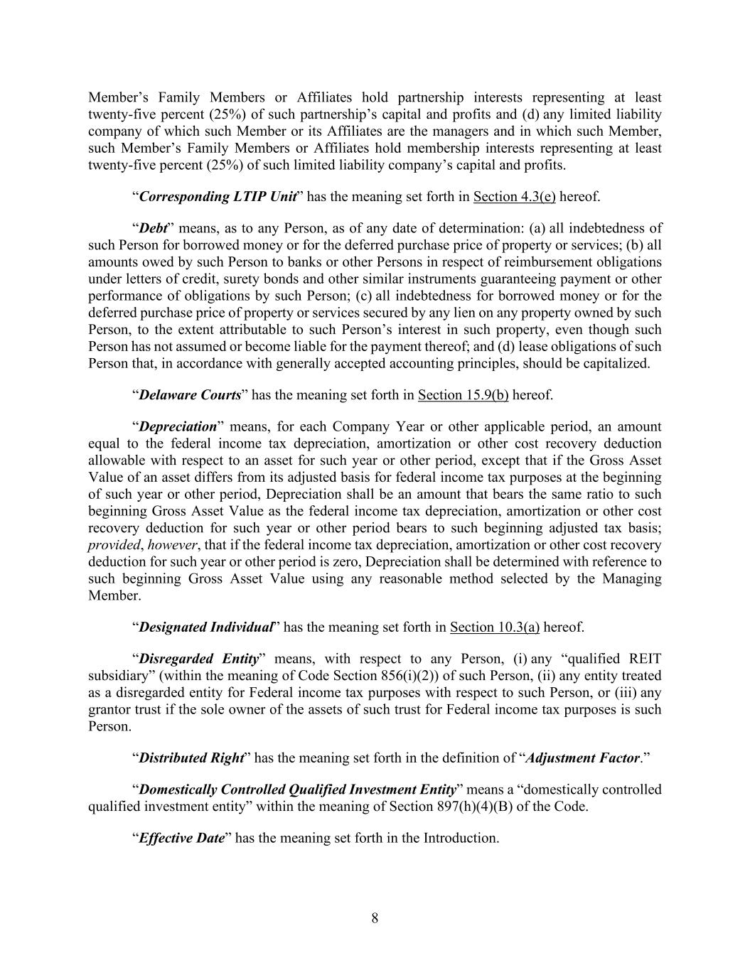 8 Member’s Family Members or Affiliates hold partnership interests representing at least twenty-five percent (25%) of such partnership’s capital and profits and (d) any limited liability company of which such Member or its Affiliates are the managers and in which such Member, such Member’s Family Members or Affiliates hold membership interests representing at least twenty-five percent (25%) of such limited liability company’s capital and profits. “Corresponding LTIP Unit” has the meaning set forth in Section 4.3(e) hereof. “Debt” means, as to any Person, as of any date of determination: (a) all indebtedness of such Person for borrowed money or for the deferred purchase price of property or services; (b) all amounts owed by such Person to banks or other Persons in respect of reimbursement obligations under letters of credit, surety bonds and other similar instruments guaranteeing payment or other performance of obligations by such Person; (c) all indebtedness for borrowed money or for the deferred purchase price of property or services secured by any lien on any property owned by such Person, to the extent attributable to such Person’s interest in such property, even though such Person has not assumed or become liable for the payment thereof; and (d) lease obligations of such Person that, in accordance with generally accepted accounting principles, should be capitalized. “Delaware Courts” has the meaning set forth in Section 15.9(b) hereof. “Depreciation” means, for each Company Year or other applicable period, an amount equal to the federal income tax depreciation, amortization or other cost recovery deduction allowable with respect to an asset for such year or other period, except that if the Gross Asset Value of an asset differs from its adjusted basis for federal income tax purposes at the beginning of such year or other period, Depreciation shall be an amount that bears the same ratio to such beginning Gross Asset Value as the federal income tax depreciation, amortization or other cost recovery deduction for such year or other period bears to such beginning adjusted tax basis; provided, however, that if the federal income tax depreciation, amortization or other cost recovery deduction for such year or other period is zero, Depreciation shall be determined with reference to such beginning Gross Asset Value using any reasonable method selected by the Managing Member. “Designated Individual” has the meaning set forth in Section 10.3(a) hereof. “Disregarded Entity” means, with respect to any Person, (i) any “qualified REIT subsidiary” (within the meaning of Code Section 856(i)(2)) of such Person, (ii) any entity treated as a disregarded entity for Federal income tax purposes with respect to such Person, or (iii) any grantor trust if the sole owner of the assets of such trust for Federal income tax purposes is such Person. “Distributed Right” has the meaning set forth in the definition of “Adjustment Factor.” “Domestically Controlled Qualified Investment Entity” means a “domestically controlled qualified investment entity” within the meaning of Section 897(h)(4)(B) of the Code. “Effective Date” has the meaning set forth in the Introduction.