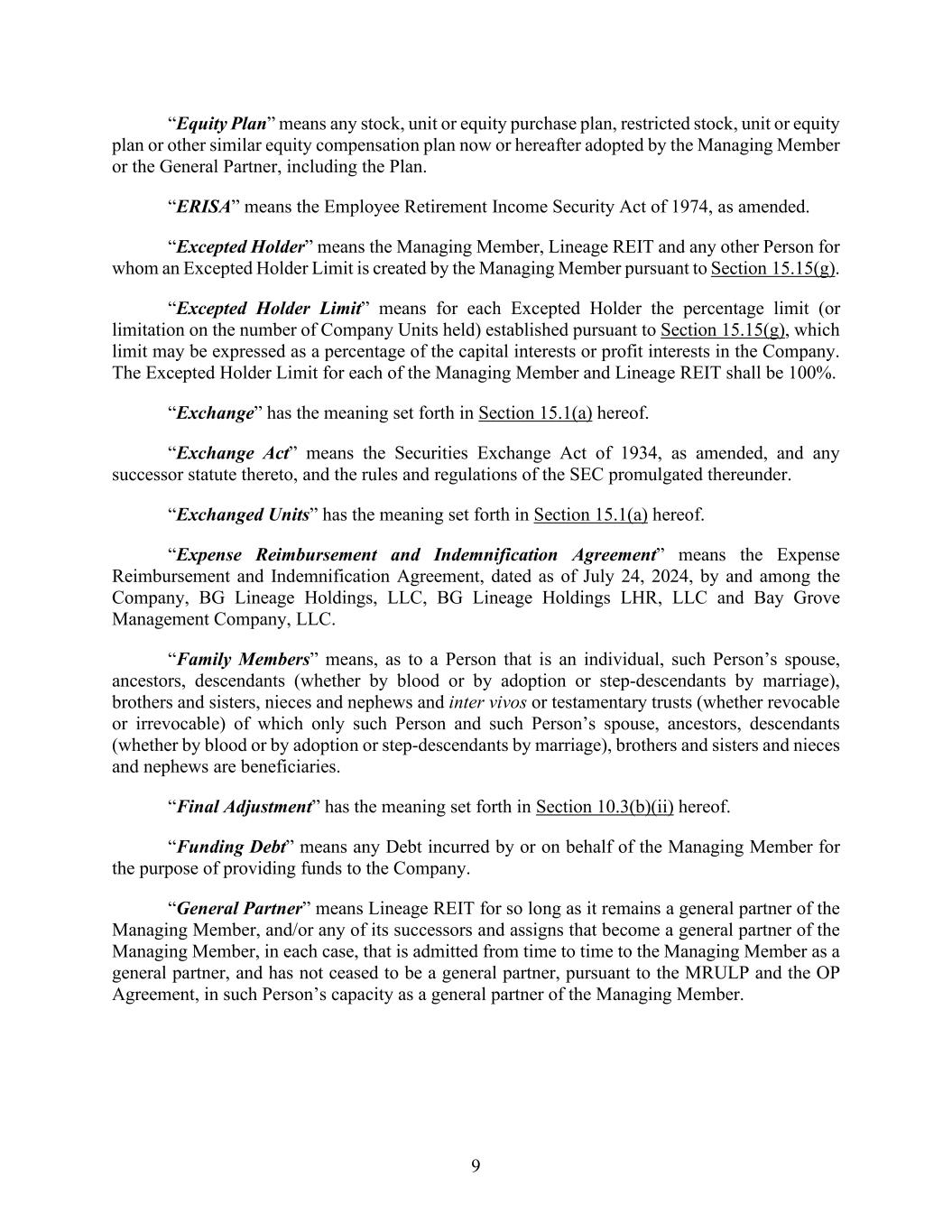 9 “Equity Plan” means any stock, unit or equity purchase plan, restricted stock, unit or equity plan or other similar equity compensation plan now or hereafter adopted by the Managing Member or the General Partner, including the Plan. “ERISA” means the Employee Retirement Income Security Act of 1974, as amended. “Excepted Holder” means the Managing Member, Lineage REIT and any other Person for whom an Excepted Holder Limit is created by the Managing Member pursuant to Section 15.15(g). “Excepted Holder Limit” means for each Excepted Holder the percentage limit (or limitation on the number of Company Units held) established pursuant to Section 15.15(g), which limit may be expressed as a percentage of the capital interests or profit interests in the Company. The Excepted Holder Limit for each of the Managing Member and Lineage REIT shall be 100%. “Exchange” has the meaning set forth in Section 15.1(a) hereof. “Exchange Act” means the Securities Exchange Act of 1934, as amended, and any successor statute thereto, and the rules and regulations of the SEC promulgated thereunder. “Exchanged Units” has the meaning set forth in Section 15.1(a) hereof. “Expense Reimbursement and Indemnification Agreement” means the Expense Reimbursement and Indemnification Agreement, dated as of July 24, 2024, by and among the Company, BG Lineage Holdings, LLC, BG Lineage Holdings LHR, LLC and Bay Grove Management Company, LLC. “Family Members” means, as to a Person that is an individual, such Person’s spouse, ancestors, descendants (whether by blood or by adoption or step-descendants by marriage), brothers and sisters, nieces and nephews and inter vivos or testamentary trusts (whether revocable or irrevocable) of which only such Person and such Person’s spouse, ancestors, descendants (whether by blood or by adoption or step-descendants by marriage), brothers and sisters and nieces and nephews are beneficiaries. “Final Adjustment” has the meaning set forth in Section 10.3(b)(ii) hereof. “Funding Debt” means any Debt incurred by or on behalf of the Managing Member for the purpose of providing funds to the Company. “General Partner” means Lineage REIT for so long as it remains a general partner of the Managing Member, and/or any of its successors and assigns that become a general partner of the Managing Member, in each case, that is admitted from time to time to the Managing Member as a general partner, and has not ceased to be a general partner, pursuant to the MRULP and the OP Agreement, in such Person’s capacity as a general partner of the Managing Member.