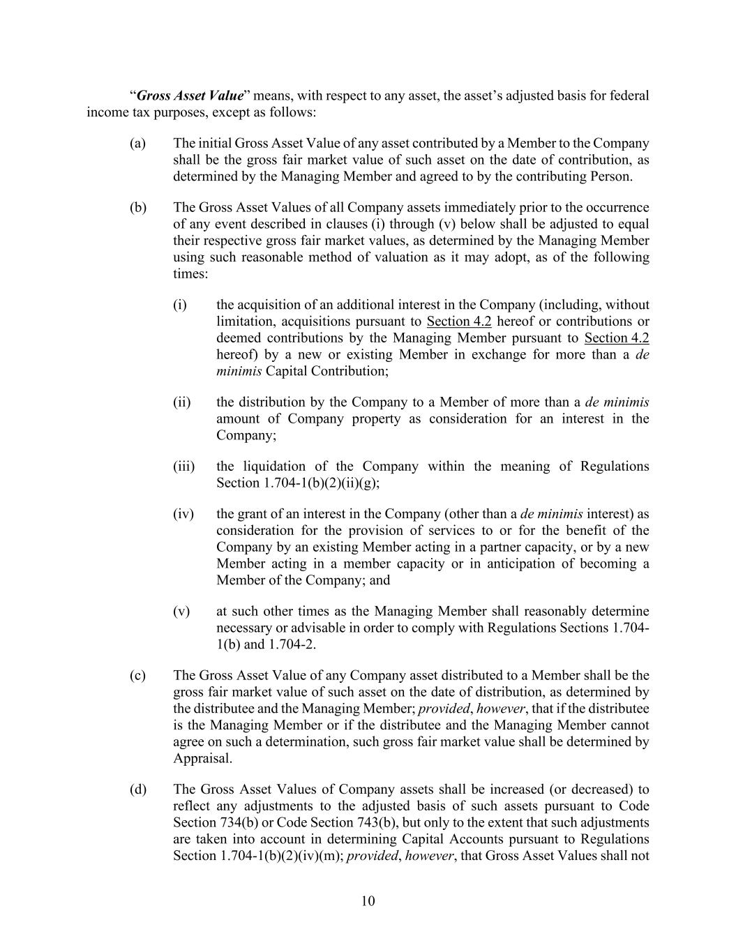 10 “Gross Asset Value” means, with respect to any asset, the asset’s adjusted basis for federal income tax purposes, except as follows: (a) The initial Gross Asset Value of any asset contributed by a Member to the Company shall be the gross fair market value of such asset on the date of contribution, as determined by the Managing Member and agreed to by the contributing Person. (b) The Gross Asset Values of all Company assets immediately prior to the occurrence of any event described in clauses (i) through (v) below shall be adjusted to equal their respective gross fair market values, as determined by the Managing Member using such reasonable method of valuation as it may adopt, as of the following times: (i) the acquisition of an additional interest in the Company (including, without limitation, acquisitions pursuant to Section 4.2 hereof or contributions or deemed contributions by the Managing Member pursuant to Section 4.2 hereof) by a new or existing Member in exchange for more than a de minimis Capital Contribution; (ii) the distribution by the Company to a Member of more than a de minimis amount of Company property as consideration for an interest in the Company; (iii) the liquidation of the Company within the meaning of Regulations Section 1.704-1(b)(2)(ii)(g); (iv) the grant of an interest in the Company (other than a de minimis interest) as consideration for the provision of services to or for the benefit of the Company by an existing Member acting in a partner capacity, or by a new Member acting in a member capacity or in anticipation of becoming a Member of the Company; and (v) at such other times as the Managing Member shall reasonably determine necessary or advisable in order to comply with Regulations Sections 1.704- 1(b) and 1.704-2. (c) The Gross Asset Value of any Company asset distributed to a Member shall be the gross fair market value of such asset on the date of distribution, as determined by the distributee and the Managing Member; provided, however, that if the distributee is the Managing Member or if the distributee and the Managing Member cannot agree on such a determination, such gross fair market value shall be determined by Appraisal. (d) The Gross Asset Values of Company assets shall be increased (or decreased) to reflect any adjustments to the adjusted basis of such assets pursuant to Code Section 734(b) or Code Section 743(b), but only to the extent that such adjustments are taken into account in determining Capital Accounts pursuant to Regulations Section 1.704-1(b)(2)(iv)(m); provided, however, that Gross Asset Values shall not