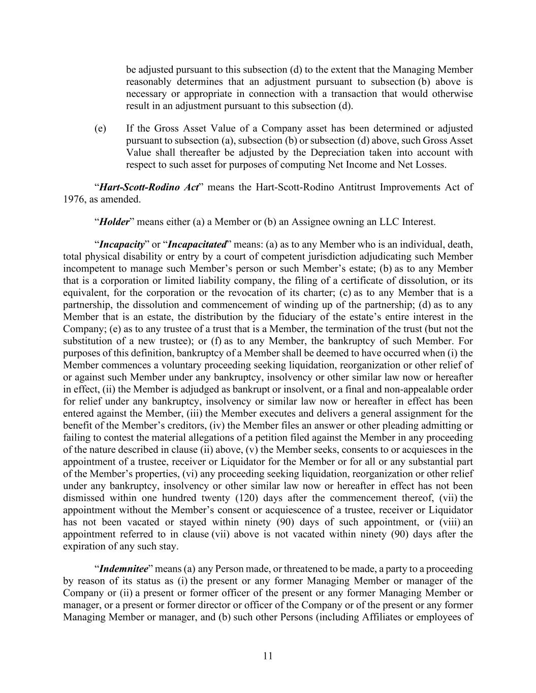 11 be adjusted pursuant to this subsection (d) to the extent that the Managing Member reasonably determines that an adjustment pursuant to subsection (b) above is necessary or appropriate in connection with a transaction that would otherwise result in an adjustment pursuant to this subsection (d). (e) If the Gross Asset Value of a Company asset has been determined or adjusted pursuant to subsection (a), subsection (b) or subsection (d) above, such Gross Asset Value shall thereafter be adjusted by the Depreciation taken into account with respect to such asset for purposes of computing Net Income and Net Losses. “Hart-Scott-Rodino Act” means the Hart-Scott-Rodino Antitrust Improvements Act of 1976, as amended. “Holder” means either (a) a Member or (b) an Assignee owning an LLC Interest. “Incapacity” or “Incapacitated” means: (a) as to any Member who is an individual, death, total physical disability or entry by a court of competent jurisdiction adjudicating such Member incompetent to manage such Member’s person or such Member’s estate; (b) as to any Member that is a corporation or limited liability company, the filing of a certificate of dissolution, or its equivalent, for the corporation or the revocation of its charter; (c) as to any Member that is a partnership, the dissolution and commencement of winding up of the partnership; (d) as to any Member that is an estate, the distribution by the fiduciary of the estate’s entire interest in the Company; (e) as to any trustee of a trust that is a Member, the termination of the trust (but not the substitution of a new trustee); or (f) as to any Member, the bankruptcy of such Member. For purposes of this definition, bankruptcy of a Member shall be deemed to have occurred when (i) the Member commences a voluntary proceeding seeking liquidation, reorganization or other relief of or against such Member under any bankruptcy, insolvency or other similar law now or hereafter in effect, (ii) the Member is adjudged as bankrupt or insolvent, or a final and non-appealable order for relief under any bankruptcy, insolvency or similar law now or hereafter in effect has been entered against the Member, (iii) the Member executes and delivers a general assignment for the benefit of the Member’s creditors, (iv) the Member files an answer or other pleading admitting or failing to contest the material allegations of a petition filed against the Member in any proceeding of the nature described in clause (ii) above, (v) the Member seeks, consents to or acquiesces in the appointment of a trustee, receiver or Liquidator for the Member or for all or any substantial part of the Member’s properties, (vi) any proceeding seeking liquidation, reorganization or other relief under any bankruptcy, insolvency or other similar law now or hereafter in effect has not been dismissed within one hundred twenty (120) days after the commencement thereof, (vii) the appointment without the Member’s consent or acquiescence of a trustee, receiver or Liquidator has not been vacated or stayed within ninety (90) days of such appointment, or (viii) an appointment referred to in clause (vii) above is not vacated within ninety (90) days after the expiration of any such stay. “Indemnitee” means (a) any Person made, or threatened to be made, a party to a proceeding by reason of its status as (i) the present or any former Managing Member or manager of the Company or (ii) a present or former officer of the present or any former Managing Member or manager, or a present or former director or officer of the Company or of the present or any former Managing Member or manager, and (b) such other Persons (including Affiliates or employees of