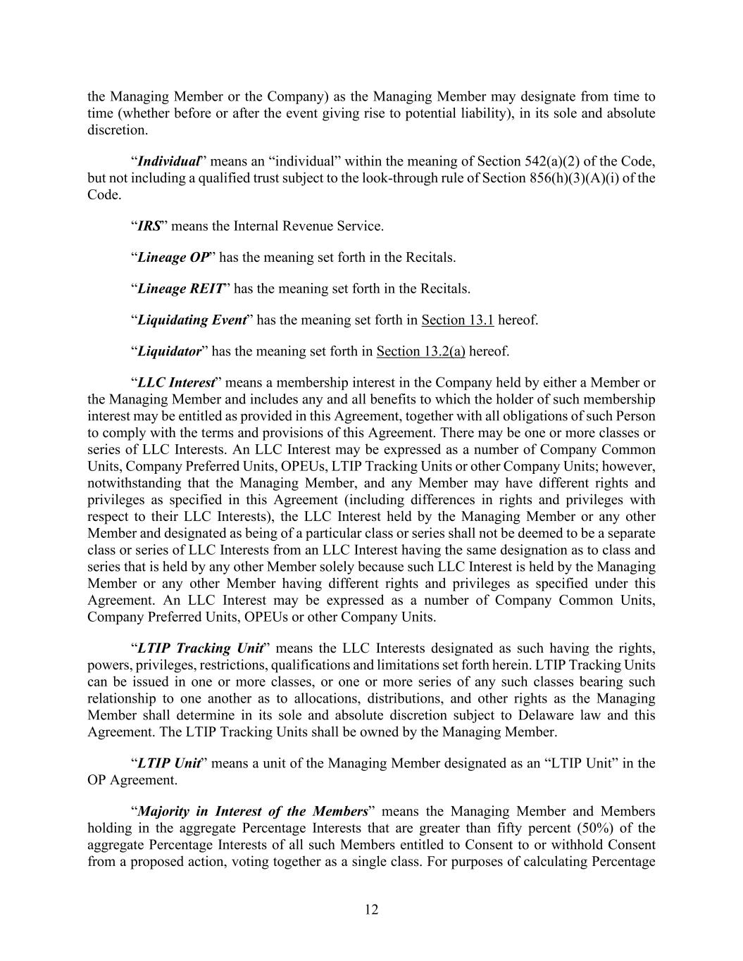 12 the Managing Member or the Company) as the Managing Member may designate from time to time (whether before or after the event giving rise to potential liability), in its sole and absolute discretion. “Individual” means an “individual” within the meaning of Section 542(a)(2) of the Code, but not including a qualified trust subject to the look-through rule of Section 856(h)(3)(A)(i) of the Code. “IRS” means the Internal Revenue Service. “Lineage OP” has the meaning set forth in the Recitals. “Lineage REIT” has the meaning set forth in the Recitals. “Liquidating Event” has the meaning set forth in Section 13.1 hereof. “Liquidator” has the meaning set forth in Section 13.2(a) hereof. “LLC Interest” means a membership interest in the Company held by either a Member or the Managing Member and includes any and all benefits to which the holder of such membership interest may be entitled as provided in this Agreement, together with all obligations of such Person to comply with the terms and provisions of this Agreement. There may be one or more classes or series of LLC Interests. An LLC Interest may be expressed as a number of Company Common Units, Company Preferred Units, OPEUs, LTIP Tracking Units or other Company Units; however, notwithstanding that the Managing Member, and any Member may have different rights and privileges as specified in this Agreement (including differences in rights and privileges with respect to their LLC Interests), the LLC Interest held by the Managing Member or any other Member and designated as being of a particular class or series shall not be deemed to be a separate class or series of LLC Interests from an LLC Interest having the same designation as to class and series that is held by any other Member solely because such LLC Interest is held by the Managing Member or any other Member having different rights and privileges as specified under this Agreement. An LLC Interest may be expressed as a number of Company Common Units, Company Preferred Units, OPEUs or other Company Units. “LTIP Tracking Unit” means the LLC Interests designated as such having the rights, powers, privileges, restrictions, qualifications and limitations set forth herein. LTIP Tracking Units can be issued in one or more classes, or one or more series of any such classes bearing such relationship to one another as to allocations, distributions, and other rights as the Managing Member shall determine in its sole and absolute discretion subject to Delaware law and this Agreement. The LTIP Tracking Units shall be owned by the Managing Member. “LTIP Unit” means a unit of the Managing Member designated as an “LTIP Unit” in the OP Agreement. “Majority in Interest of the Members” means the Managing Member and Members holding in the aggregate Percentage Interests that are greater than fifty percent (50%) of the aggregate Percentage Interests of all such Members entitled to Consent to or withhold Consent from a proposed action, voting together as a single class. For purposes of calculating Percentage