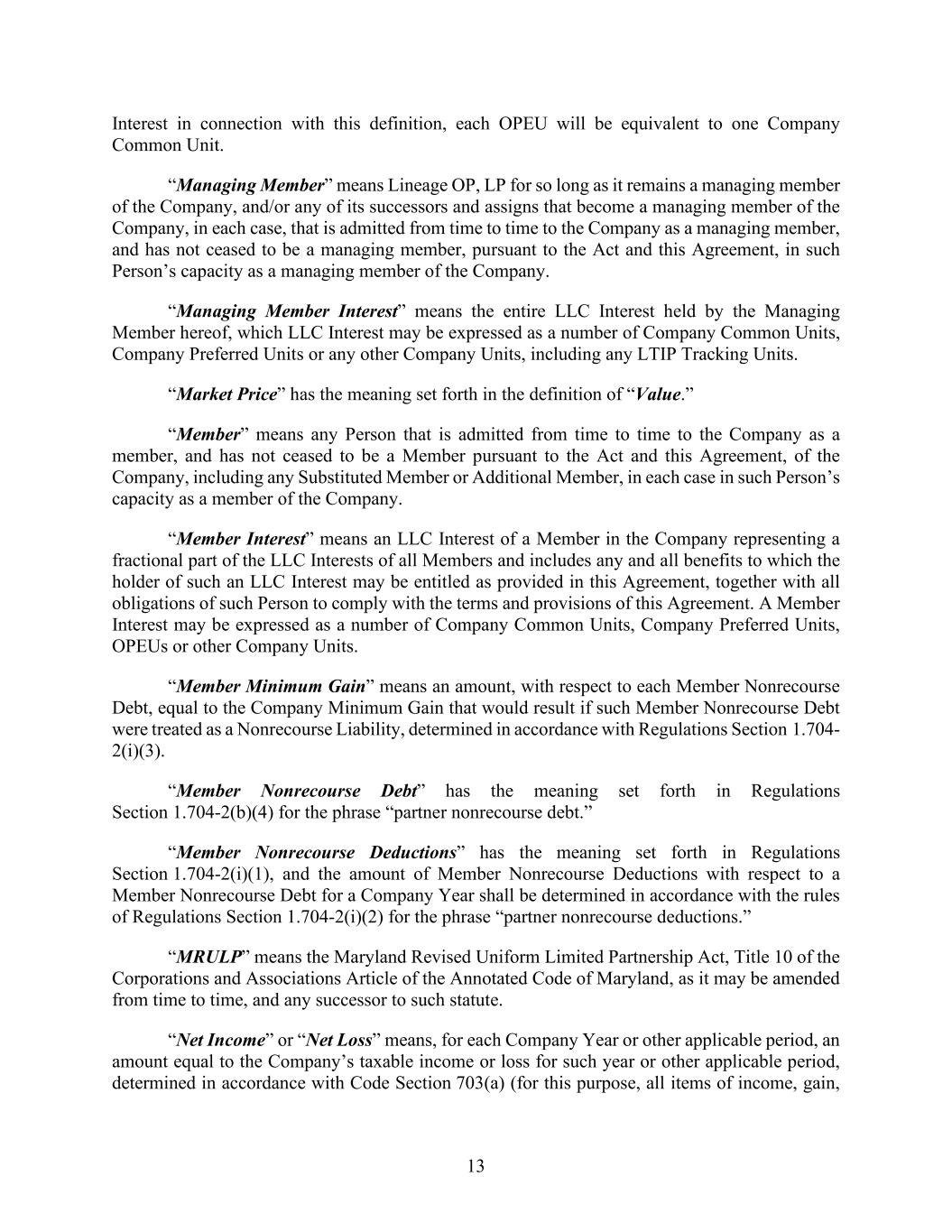 13 Interest in connection with this definition, each OPEU will be equivalent to one Company Common Unit. “Managing Member” means Lineage OP, LP for so long as it remains a managing member of the Company, and/or any of its successors and assigns that become a managing member of the Company, in each case, that is admitted from time to time to the Company as a managing member, and has not ceased to be a managing member, pursuant to the Act and this Agreement, in such Person’s capacity as a managing member of the Company. “Managing Member Interest” means the entire LLC Interest held by the Managing Member hereof, which LLC Interest may be expressed as a number of Company Common Units, Company Preferred Units or any other Company Units, including any LTIP Tracking Units. “Market Price” has the meaning set forth in the definition of “Value.” “Member” means any Person that is admitted from time to time to the Company as a member, and has not ceased to be a Member pursuant to the Act and this Agreement, of the Company, including any Substituted Member or Additional Member, in each case in such Person’s capacity as a member of the Company. “Member Interest” means an LLC Interest of a Member in the Company representing a fractional part of the LLC Interests of all Members and includes any and all benefits to which the holder of such an LLC Interest may be entitled as provided in this Agreement, together with all obligations of such Person to comply with the terms and provisions of this Agreement. A Member Interest may be expressed as a number of Company Common Units, Company Preferred Units, OPEUs or other Company Units. “Member Minimum Gain” means an amount, with respect to each Member Nonrecourse Debt, equal to the Company Minimum Gain that would result if such Member Nonrecourse Debt were treated as a Nonrecourse Liability, determined in accordance with Regulations Section 1.704- 2(i)(3). “Member Nonrecourse Debt” has the meaning set forth in Regulations Section 1.704-2(b)(4) for the phrase “partner nonrecourse debt.” “Member Nonrecourse Deductions” has the meaning set forth in Regulations Section 1.704-2(i)(1), and the amount of Member Nonrecourse Deductions with respect to a Member Nonrecourse Debt for a Company Year shall be determined in accordance with the rules of Regulations Section 1.704-2(i)(2) for the phrase “partner nonrecourse deductions.” “MRULP” means the Maryland Revised Uniform Limited Partnership Act, Title 10 of the Corporations and Associations Article of the Annotated Code of Maryland, as it may be amended from time to time, and any successor to such statute. “Net Income” or “Net Loss” means, for each Company Year or other applicable period, an amount equal to the Company’s taxable income or loss for such year or other applicable period, determined in accordance with Code Section 703(a) (for this purpose, all items of income, gain,
