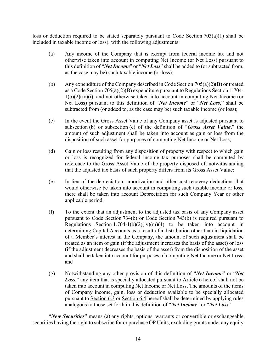 14 loss or deduction required to be stated separately pursuant to Code Section 703(a)(1) shall be included in taxable income or loss), with the following adjustments: (a) Any income of the Company that is exempt from federal income tax and not otherwise taken into account in computing Net Income (or Net Loss) pursuant to this definition of “Net Income” or “Net Loss” shall be added to (or subtracted from, as the case may be) such taxable income (or loss); (b) Any expenditure of the Company described in Code Section 705(a)(2)(B) or treated as a Code Section 705(a)(2)(B) expenditure pursuant to Regulations Section 1.704- 1(b)(2)(iv)(i), and not otherwise taken into account in computing Net Income (or Net Loss) pursuant to this definition of “Net Income” or “Net Loss,” shall be subtracted from (or added to, as the case may be) such taxable income (or loss); (c) In the event the Gross Asset Value of any Company asset is adjusted pursuant to subsection (b) or subsection (c) of the definition of “Gross Asset Value,” the amount of such adjustment shall be taken into account as gain or loss from the disposition of such asset for purposes of computing Net Income or Net Loss; (d) Gain or loss resulting from any disposition of property with respect to which gain or loss is recognized for federal income tax purposes shall be computed by reference to the Gross Asset Value of the property disposed of, notwithstanding that the adjusted tax basis of such property differs from its Gross Asset Value; (e) In lieu of the depreciation, amortization and other cost recovery deductions that would otherwise be taken into account in computing such taxable income or loss, there shall be taken into account Depreciation for such Company Year or other applicable period; (f) To the extent that an adjustment to the adjusted tax basis of any Company asset pursuant to Code Section 734(b) or Code Section 743(b) is required pursuant to Regulations Section 1.704-1(b)(2)(iv)(m)(4) to be taken into account in determining Capital Accounts as a result of a distribution other than in liquidation of a Member’s interest in the Company, the amount of such adjustment shall be treated as an item of gain (if the adjustment increases the basis of the asset) or loss (if the adjustment decreases the basis of the asset) from the disposition of the asset and shall be taken into account for purposes of computing Net Income or Net Loss; and (g) Notwithstanding any other provision of this definition of “Net Income” or “Net Loss,” any item that is specially allocated pursuant to Article 6 hereof shall not be taken into account in computing Net Income or Net Loss. The amounts of the items of Company income, gain, loss or deduction available to be specially allocated pursuant to Section 6.3 or Section 6.4 hereof shall be determined by applying rules analogous to those set forth in this definition of “Net Income” or “Net Loss.” “New Securities” means (a) any rights, options, warrants or convertible or exchangeable securities having the right to subscribe for or purchase OP Units, excluding grants under any equity