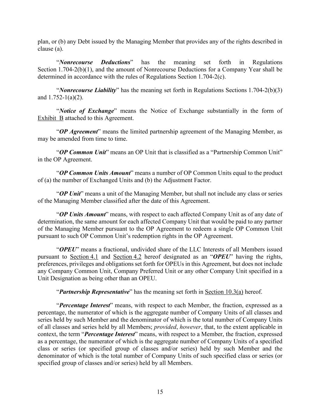 15 plan, or (b) any Debt issued by the Managing Member that provides any of the rights described in clause (a). “Nonrecourse Deductions” has the meaning set forth in Regulations Section 1.704-2(b)(1), and the amount of Nonrecourse Deductions for a Company Year shall be determined in accordance with the rules of Regulations Section 1.704-2(c). “Nonrecourse Liability” has the meaning set forth in Regulations Sections 1.704-2(b)(3) and 1.752-1(a)(2). “Notice of Exchange” means the Notice of Exchange substantially in the form of Exhibit B attached to this Agreement. “OP Agreement” means the limited partnership agreement of the Managing Member, as may be amended from time to time. “OP Common Unit” means an OP Unit that is classified as a “Partnership Common Unit” in the OP Agreement. “OP Common Units Amount” means a number of OP Common Units equal to the product of (a) the number of Exchanged Units and (b) the Adjustment Factor. “OP Unit” means a unit of the Managing Member, but shall not include any class or series of the Managing Member classified after the date of this Agreement. “OP Units Amount” means, with respect to each affected Company Unit as of any date of determination, the same amount for each affected Company Unit that would be paid to any partner of the Managing Member pursuant to the OP Agreement to redeem a single OP Common Unit pursuant to such OP Common Unit’s redemption rights in the OP Agreement. “OPEU” means a fractional, undivided share of the LLC Interests of all Members issued pursuant to Section 4.1 and Section 4.2 hereof designated as an “OPEU” having the rights, preferences, privileges and obligations set forth for OPEUs in this Agreement, but does not include any Company Common Unit, Company Preferred Unit or any other Company Unit specified in a Unit Designation as being other than an OPEU. “Partnership Representative” has the meaning set forth in Section 10.3(a) hereof. “Percentage Interest” means, with respect to each Member, the fraction, expressed as a percentage, the numerator of which is the aggregate number of Company Units of all classes and series held by such Member and the denominator of which is the total number of Company Units of all classes and series held by all Members; provided, however, that, to the extent applicable in context, the term “Percentage Interest” means, with respect to a Member, the fraction, expressed as a percentage, the numerator of which is the aggregate number of Company Units of a specified class or series (or specified group of classes and/or series) held by such Member and the denominator of which is the total number of Company Units of such specified class or series (or specified group of classes and/or series) held by all Members.