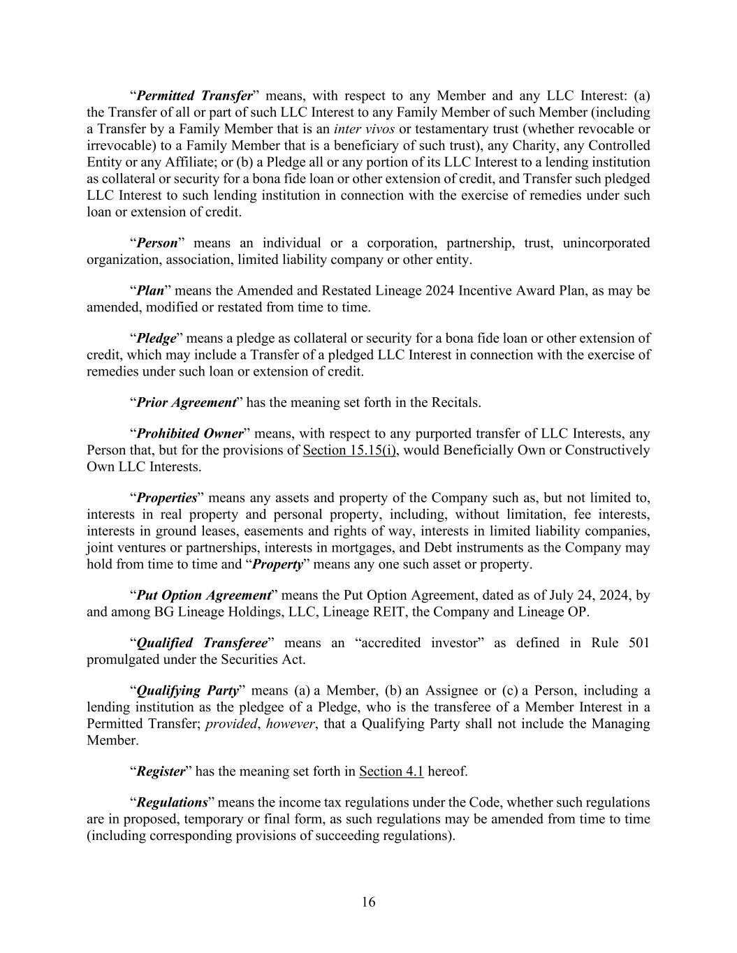 16 “Permitted Transfer” means, with respect to any Member and any LLC Interest: (a) the Transfer of all or part of such LLC Interest to any Family Member of such Member (including a Transfer by a Family Member that is an inter vivos or testamentary trust (whether revocable or irrevocable) to a Family Member that is a beneficiary of such trust), any Charity, any Controlled Entity or any Affiliate; or (b) a Pledge all or any portion of its LLC Interest to a lending institution as collateral or security for a bona fide loan or other extension of credit, and Transfer such pledged LLC Interest to such lending institution in connection with the exercise of remedies under such loan or extension of credit. “Person” means an individual or a corporation, partnership, trust, unincorporated organization, association, limited liability company or other entity. “Plan” means the Amended and Restated Lineage 2024 Incentive Award Plan, as may be amended, modified or restated from time to time. “Pledge” means a pledge as collateral or security for a bona fide loan or other extension of credit, which may include a Transfer of a pledged LLC Interest in connection with the exercise of remedies under such loan or extension of credit. “Prior Agreement” has the meaning set forth in the Recitals. “Prohibited Owner” means, with respect to any purported transfer of LLC Interests, any Person that, but for the provisions of Section 15.15(i), would Beneficially Own or Constructively Own LLC Interests. “Properties” means any assets and property of the Company such as, but not limited to, interests in real property and personal property, including, without limitation, fee interests, interests in ground leases, easements and rights of way, interests in limited liability companies, joint ventures or partnerships, interests in mortgages, and Debt instruments as the Company may hold from time to time and “Property” means any one such asset or property. “Put Option Agreement” means the Put Option Agreement, dated as of July 24, 2024, by and among BG Lineage Holdings, LLC, Lineage REIT, the Company and Lineage OP. “Qualified Transferee” means an “accredited investor” as defined in Rule 501 promulgated under the Securities Act. “Qualifying Party” means (a) a Member, (b) an Assignee or (c) a Person, including a lending institution as the pledgee of a Pledge, who is the transferee of a Member Interest in a Permitted Transfer; provided, however, that a Qualifying Party shall not include the Managing Member. “Register” has the meaning set forth in Section 4.1 hereof. “Regulations” means the income tax regulations under the Code, whether such regulations are in proposed, temporary or final form, as such regulations may be amended from time to time (including corresponding provisions of succeeding regulations).