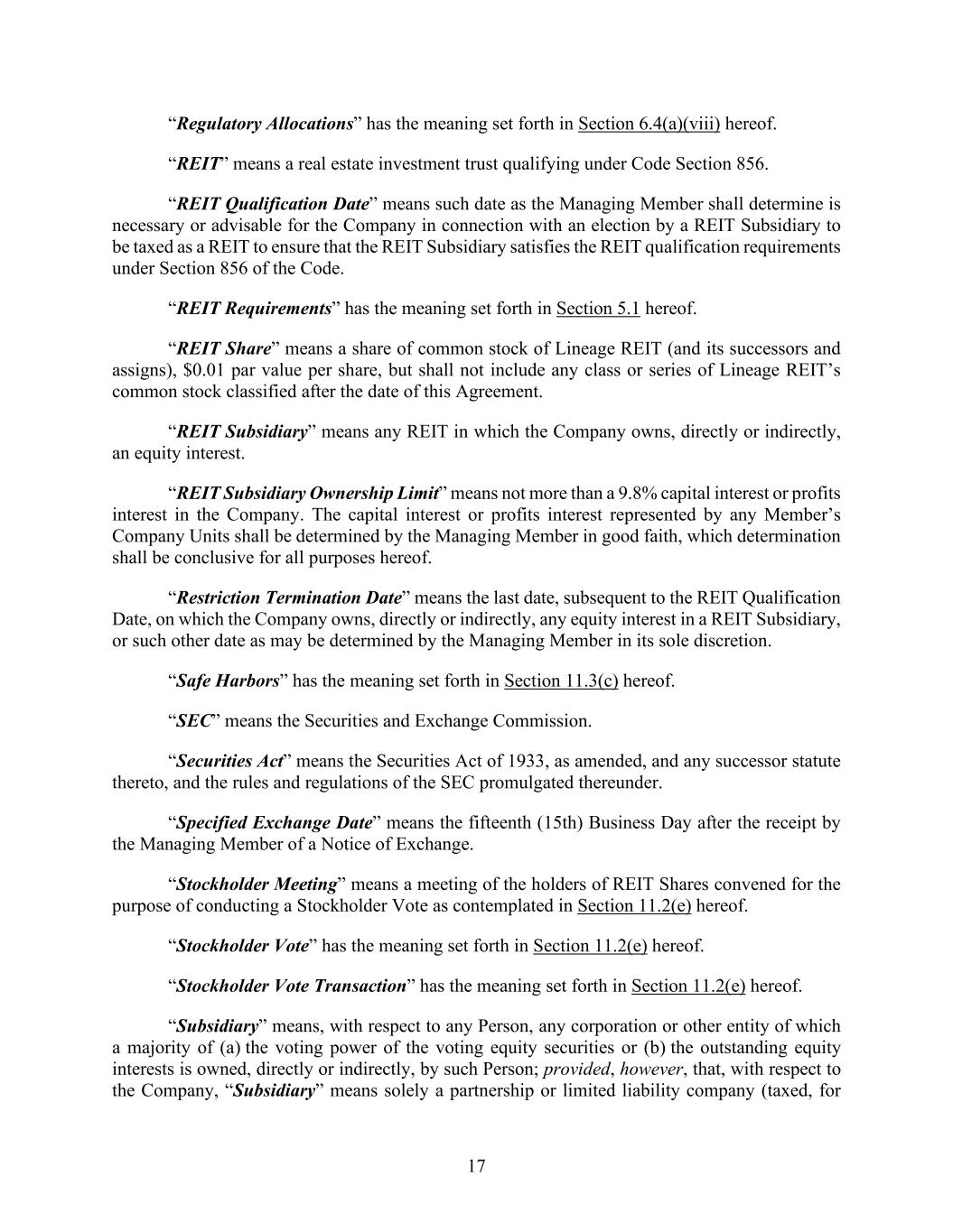 17 “Regulatory Allocations” has the meaning set forth in Section 6.4(a)(viii) hereof. “REIT” means a real estate investment trust qualifying under Code Section 856. “REIT Qualification Date” means such date as the Managing Member shall determine is necessary or advisable for the Company in connection with an election by a REIT Subsidiary to be taxed as a REIT to ensure that the REIT Subsidiary satisfies the REIT qualification requirements under Section 856 of the Code. “REIT Requirements” has the meaning set forth in Section 5.1 hereof. “REIT Share” means a share of common stock of Lineage REIT (and its successors and assigns), $0.01 par value per share, but shall not include any class or series of Lineage REIT’s common stock classified after the date of this Agreement. “REIT Subsidiary” means any REIT in which the Company owns, directly or indirectly, an equity interest. “REIT Subsidiary Ownership Limit” means not more than a 9.8% capital interest or profits interest in the Company. The capital interest or profits interest represented by any Member’s Company Units shall be determined by the Managing Member in good faith, which determination shall be conclusive for all purposes hereof. “Restriction Termination Date” means the last date, subsequent to the REIT Qualification Date, on which the Company owns, directly or indirectly, any equity interest in a REIT Subsidiary, or such other date as may be determined by the Managing Member in its sole discretion. “Safe Harbors” has the meaning set forth in Section 11.3(c) hereof. “SEC” means the Securities and Exchange Commission. “Securities Act” means the Securities Act of 1933, as amended, and any successor statute thereto, and the rules and regulations of the SEC promulgated thereunder. “Specified Exchange Date” means the fifteenth (15th) Business Day after the receipt by the Managing Member of a Notice of Exchange. “Stockholder Meeting” means a meeting of the holders of REIT Shares convened for the purpose of conducting a Stockholder Vote as contemplated in Section 11.2(e) hereof. “Stockholder Vote” has the meaning set forth in Section 11.2(e) hereof. “Stockholder Vote Transaction” has the meaning set forth in Section 11.2(e) hereof. “Subsidiary” means, with respect to any Person, any corporation or other entity of which a majority of (a) the voting power of the voting equity securities or (b) the outstanding equity interests is owned, directly or indirectly, by such Person; provided, however, that, with respect to the Company, “Subsidiary” means solely a partnership or limited liability company (taxed, for