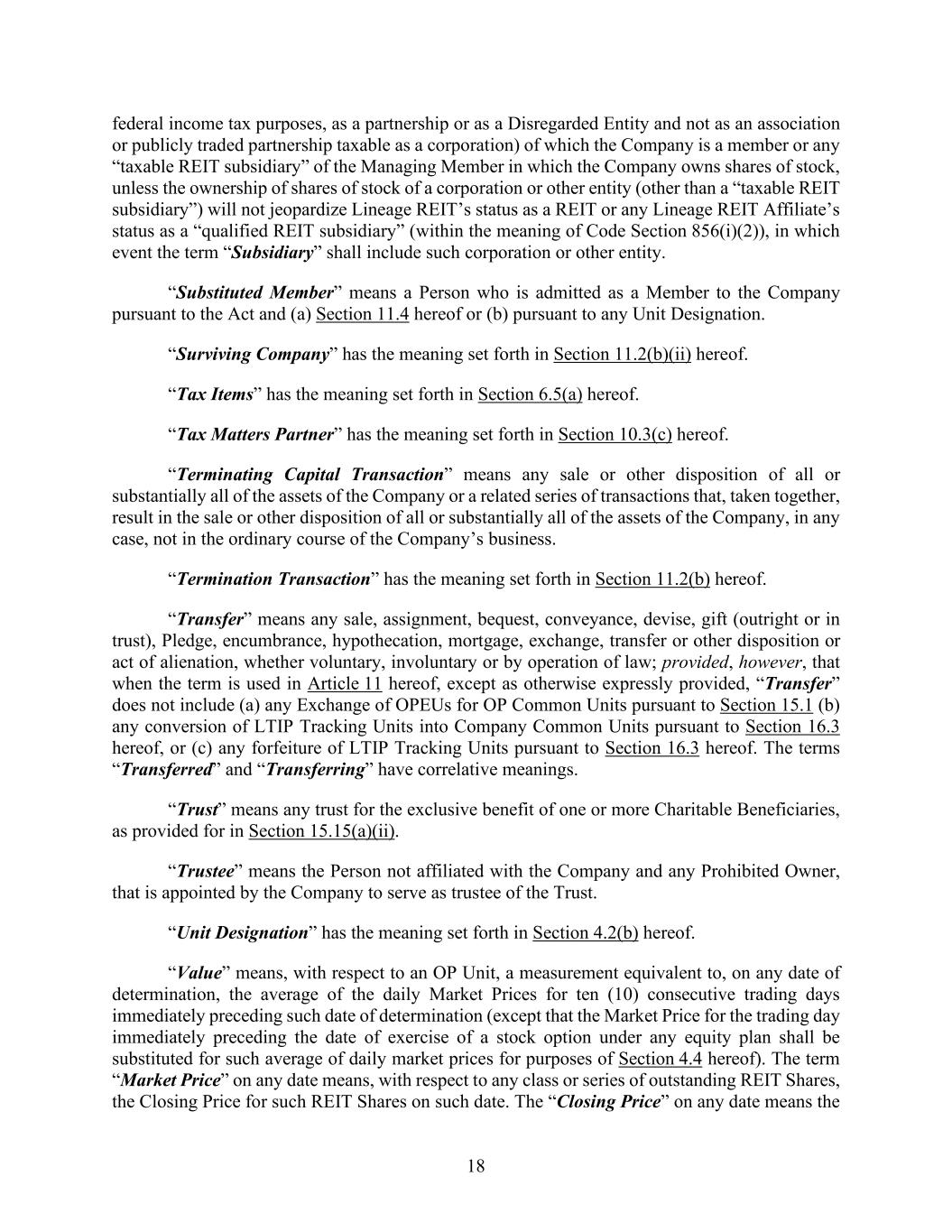 18 federal income tax purposes, as a partnership or as a Disregarded Entity and not as an association or publicly traded partnership taxable as a corporation) of which the Company is a member or any “taxable REIT subsidiary” of the Managing Member in which the Company owns shares of stock, unless the ownership of shares of stock of a corporation or other entity (other than a “taxable REIT subsidiary”) will not jeopardize Lineage REIT’s status as a REIT or any Lineage REIT Affiliate’s status as a “qualified REIT subsidiary” (within the meaning of Code Section 856(i)(2)), in which event the term “Subsidiary” shall include such corporation or other entity. “Substituted Member” means a Person who is admitted as a Member to the Company pursuant to the Act and (a) Section 11.4 hereof or (b) pursuant to any Unit Designation. “Surviving Company” has the meaning set forth in Section 11.2(b)(ii) hereof. “Tax Items” has the meaning set forth in Section 6.5(a) hereof. “Tax Matters Partner” has the meaning set forth in Section 10.3(c) hereof. “Terminating Capital Transaction” means any sale or other disposition of all or substantially all of the assets of the Company or a related series of transactions that, taken together, result in the sale or other disposition of all or substantially all of the assets of the Company, in any case, not in the ordinary course of the Company’s business. “Termination Transaction” has the meaning set forth in Section 11.2(b) hereof. “Transfer” means any sale, assignment, bequest, conveyance, devise, gift (outright or in trust), Pledge, encumbrance, hypothecation, mortgage, exchange, transfer or other disposition or act of alienation, whether voluntary, involuntary or by operation of law; provided, however, that when the term is used in Article 11 hereof, except as otherwise expressly provided, “Transfer” does not include (a) any Exchange of OPEUs for OP Common Units pursuant to Section 15.1 (b) any conversion of LTIP Tracking Units into Company Common Units pursuant to Section 16.3 hereof, or (c) any forfeiture of LTIP Tracking Units pursuant to Section 16.3 hereof. The terms “Transferred” and “Transferring” have correlative meanings. “Trust” means any trust for the exclusive benefit of one or more Charitable Beneficiaries, as provided for in Section 15.15(a)(ii). “Trustee” means the Person not affiliated with the Company and any Prohibited Owner, that is appointed by the Company to serve as trustee of the Trust. “Unit Designation” has the meaning set forth in Section 4.2(b) hereof. “Value” means, with respect to an OP Unit, a measurement equivalent to, on any date of determination, the average of the daily Market Prices for ten (10) consecutive trading days immediately preceding such date of determination (except that the Market Price for the trading day immediately preceding the date of exercise of a stock option under any equity plan shall be substituted for such average of daily market prices for purposes of Section 4.4 hereof). The term “Market Price” on any date means, with respect to any class or series of outstanding REIT Shares, the Closing Price for such REIT Shares on such date. The “Closing Price” on any date means the
