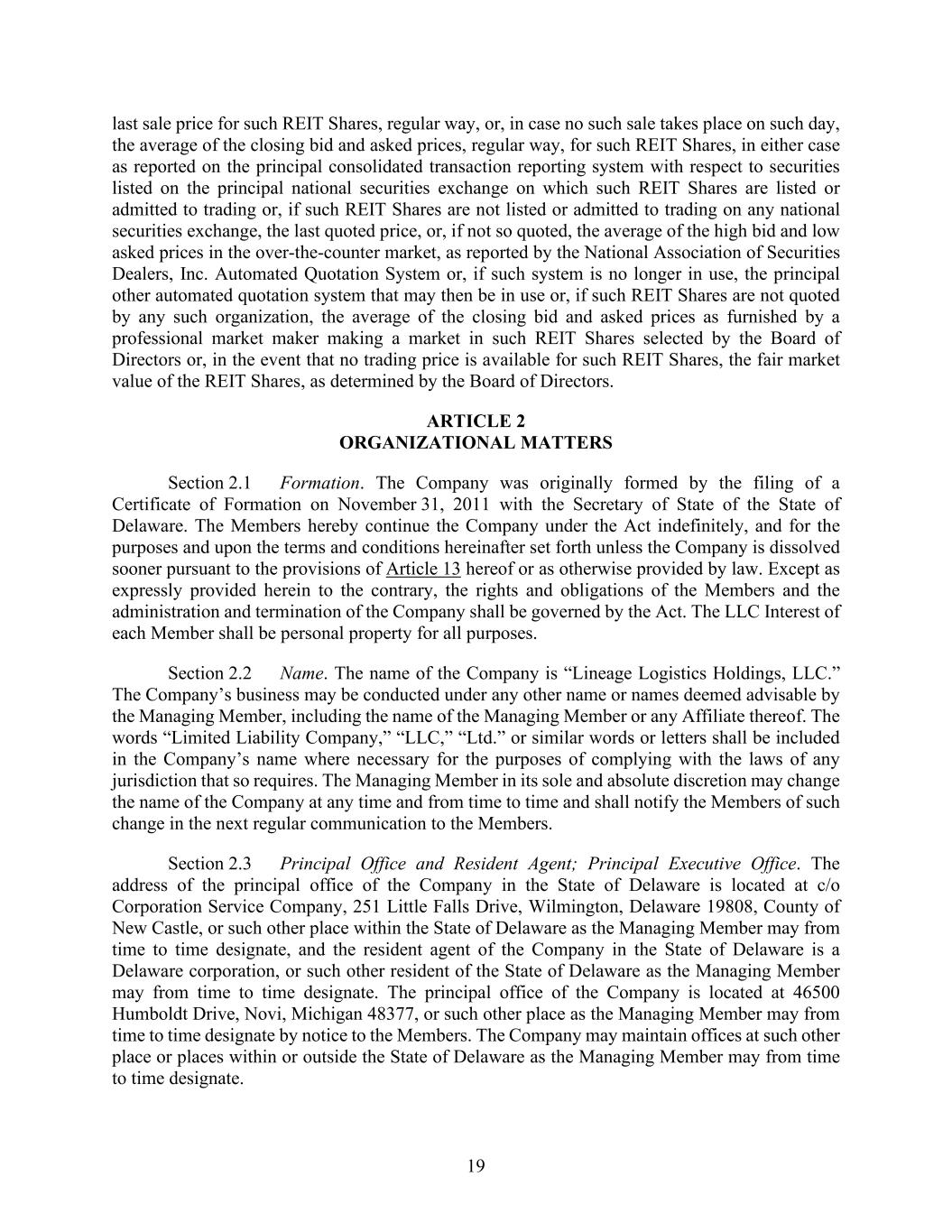 19 last sale price for such REIT Shares, regular way, or, in case no such sale takes place on such day, the average of the closing bid and asked prices, regular way, for such REIT Shares, in either case as reported on the principal consolidated transaction reporting system with respect to securities listed on the principal national securities exchange on which such REIT Shares are listed or admitted to trading or, if such REIT Shares are not listed or admitted to trading on any national securities exchange, the last quoted price, or, if not so quoted, the average of the high bid and low asked prices in the over-the-counter market, as reported by the National Association of Securities Dealers, Inc. Automated Quotation System or, if such system is no longer in use, the principal other automated quotation system that may then be in use or, if such REIT Shares are not quoted by any such organization, the average of the closing bid and asked prices as furnished by a professional market maker making a market in such REIT Shares selected by the Board of Directors or, in the event that no trading price is available for such REIT Shares, the fair market value of the REIT Shares, as determined by the Board of Directors. ARTICLE 2 ORGANIZATIONAL MATTERS Section 2.1 Formation. The Company was originally formed by the filing of a Certificate of Formation on November 31, 2011 with the Secretary of State of the State of Delaware. The Members hereby continue the Company under the Act indefinitely, and for the purposes and upon the terms and conditions hereinafter set forth unless the Company is dissolved sooner pursuant to the provisions of Article 13 hereof or as otherwise provided by law. Except as expressly provided herein to the contrary, the rights and obligations of the Members and the administration and termination of the Company shall be governed by the Act. The LLC Interest of each Member shall be personal property for all purposes. Section 2.2 Name. The name of the Company is “Lineage Logistics Holdings, LLC.” The Company’s business may be conducted under any other name or names deemed advisable by the Managing Member, including the name of the Managing Member or any Affiliate thereof. The words “Limited Liability Company,” “LLC,” “Ltd.” or similar words or letters shall be included in the Company’s name where necessary for the purposes of complying with the laws of any jurisdiction that so requires. The Managing Member in its sole and absolute discretion may change the name of the Company at any time and from time to time and shall notify the Members of such change in the next regular communication to the Members. Section 2.3 Principal Office and Resident Agent; Principal Executive Office. The address of the principal office of the Company in the State of Delaware is located at c/o Corporation Service Company, 251 Little Falls Drive, Wilmington, Delaware 19808, County of New Castle, or such other place within the State of Delaware as the Managing Member may from time to time designate, and the resident agent of the Company in the State of Delaware is a Delaware corporation, or such other resident of the State of Delaware as the Managing Member may from time to time designate. The principal office of the Company is located at 46500 Humboldt Drive, Novi, Michigan 48377, or such other place as the Managing Member may from time to time designate by notice to the Members. The Company may maintain offices at such other place or places within or outside the State of Delaware as the Managing Member may from time to time designate.