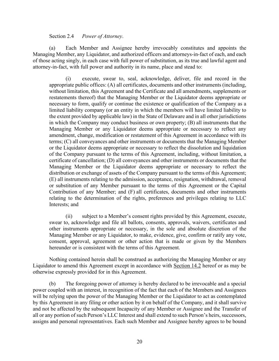 20 Section 2.4 Power of Attorney. (a) Each Member and Assignee hereby irrevocably constitutes and appoints the Managing Member, any Liquidator, and authorized officers and attorneys-in-fact of each, and each of those acting singly, in each case with full power of substitution, as its true and lawful agent and attorney-in-fact, with full power and authority in its name, place and stead to: (i) execute, swear to, seal, acknowledge, deliver, file and record in the appropriate public offices: (A) all certificates, documents and other instruments (including, without limitation, this Agreement and the Certificate and all amendments, supplements or restatements thereof) that the Managing Member or the Liquidator deems appropriate or necessary to form, qualify or continue the existence or qualification of the Company as a limited liability company (or an entity in which the members will have limited liability to the extent provided by applicable law) in the State of Delaware and in all other jurisdictions in which the Company may conduct business or own property; (B) all instruments that the Managing Member or any Liquidator deems appropriate or necessary to reflect any amendment, change, modification or restatement of this Agreement in accordance with its terms; (C) all conveyances and other instruments or documents that the Managing Member or the Liquidator deems appropriate or necessary to reflect the dissolution and liquidation of the Company pursuant to the terms of this Agreement, including, without limitation, a certificate of cancellation; (D) all conveyances and other instruments or documents that the Managing Member or the Liquidator deems appropriate or necessary to reflect the distribution or exchange of assets of the Company pursuant to the terms of this Agreement; (E) all instruments relating to the admission, acceptance, resignation, withdrawal, removal or substitution of any Member pursuant to the terms of this Agreement or the Capital Contribution of any Member; and (F) all certificates, documents and other instruments relating to the determination of the rights, preferences and privileges relating to LLC Interests; and (ii) subject to a Member’s consent rights provided by this Agreement, execute, swear to, acknowledge and file all ballots, consents, approvals, waivers, certificates and other instruments appropriate or necessary, in the sole and absolute discretion of the Managing Member or any Liquidator, to make, evidence, give, confirm or ratify any vote, consent, approval, agreement or other action that is made or given by the Members hereunder or is consistent with the terms of this Agreement. Nothing contained herein shall be construed as authorizing the Managing Member or any Liquidator to amend this Agreement except in accordance with Section 14.2 hereof or as may be otherwise expressly provided for in this Agreement. (b) The foregoing power of attorney is hereby declared to be irrevocable and a special power coupled with an interest, in recognition of the fact that each of the Members and Assignees will be relying upon the power of the Managing Member or the Liquidator to act as contemplated by this Agreement in any filing or other action by it on behalf of the Company, and it shall survive and not be affected by the subsequent Incapacity of any Member or Assignee and the Transfer of all or any portion of such Person’s LLC Interest and shall extend to such Person’s heirs, successors, assigns and personal representatives. Each such Member and Assignee hereby agrees to be bound