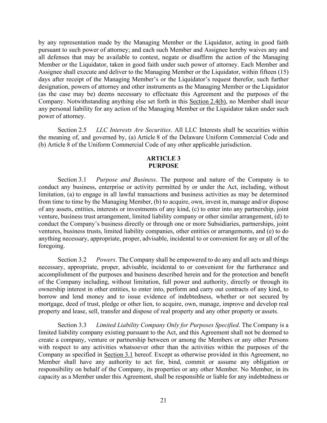 21 by any representation made by the Managing Member or the Liquidator, acting in good faith pursuant to such power of attorney; and each such Member and Assignee hereby waives any and all defenses that may be available to contest, negate or disaffirm the action of the Managing Member or the Liquidator, taken in good faith under such power of attorney. Each Member and Assignee shall execute and deliver to the Managing Member or the Liquidator, within fifteen (15) days after receipt of the Managing Member’s or the Liquidator’s request therefor, such further designation, powers of attorney and other instruments as the Managing Member or the Liquidator (as the case may be) deems necessary to effectuate this Agreement and the purposes of the Company. Notwithstanding anything else set forth in this Section 2.4(b), no Member shall incur any personal liability for any action of the Managing Member or the Liquidator taken under such power of attorney. Section 2.5 LLC Interests Are Securities. All LLC Interests shall be securities within the meaning of, and governed by, (a) Article 8 of the Delaware Uniform Commercial Code and (b) Article 8 of the Uniform Commercial Code of any other applicable jurisdiction. ARTICLE 3 PURPOSE Section 3.1 Purpose and Business. The purpose and nature of the Company is to conduct any business, enterprise or activity permitted by or under the Act, including, without limitation, (a) to engage in all lawful transactions and business activities as may be determined from time to time by the Managing Member, (b) to acquire, own, invest in, manage and/or dispose of any assets, entities, interests or investments of any kind, (c) to enter into any partnership, joint venture, business trust arrangement, limited liability company or other similar arrangement, (d) to conduct the Company’s business directly or through one or more Subsidiaries, partnerships, joint ventures, business trusts, limited liability companies, other entities or arrangements, and (e) to do anything necessary, appropriate, proper, advisable, incidental to or convenient for any or all of the foregoing. Section 3.2 Powers. The Company shall be empowered to do any and all acts and things necessary, appropriate, proper, advisable, incidental to or convenient for the furtherance and accomplishment of the purposes and business described herein and for the protection and benefit of the Company including, without limitation, full power and authority, directly or through its ownership interest in other entities, to enter into, perform and carry out contracts of any kind, to borrow and lend money and to issue evidence of indebtedness, whether or not secured by mortgage, deed of trust, pledge or other lien, to acquire, own, manage, improve and develop real property and lease, sell, transfer and dispose of real property and any other property or assets. Section 3.3 Limited Liability Company Only for Purposes Specified. The Company is a limited liability company existing pursuant to the Act, and this Agreement shall not be deemed to create a company, venture or partnership between or among the Members or any other Persons with respect to any activities whatsoever other than the activities within the purposes of the Company as specified in Section 3.1 hereof. Except as otherwise provided in this Agreement, no Member shall have any authority to act for, bind, commit or assume any obligation or responsibility on behalf of the Company, its properties or any other Member. No Member, in its capacity as a Member under this Agreement, shall be responsible or liable for any indebtedness or