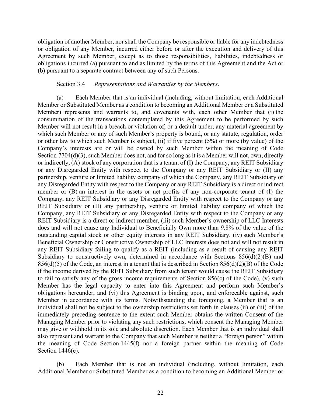 22 obligation of another Member, nor shall the Company be responsible or liable for any indebtedness or obligation of any Member, incurred either before or after the execution and delivery of this Agreement by such Member, except as to those responsibilities, liabilities, indebtedness or obligations incurred (a) pursuant to and as limited by the terms of this Agreement and the Act or (b) pursuant to a separate contract between any of such Persons. Section 3.4 Representations and Warranties by the Members. (a) Each Member that is an individual (including, without limitation, each Additional Member or Substituted Member as a condition to becoming an Additional Member or a Substituted Member) represents and warrants to, and covenants with, each other Member that (i) the consummation of the transactions contemplated by this Agreement to be performed by such Member will not result in a breach or violation of, or a default under, any material agreement by which such Member or any of such Member’s property is bound, or any statute, regulation, order or other law to which such Member is subject, (ii) if five percent (5%) or more (by value) of the Company’s interests are or will be owned by such Member within the meaning of Code Section 7704(d)(3), such Member does not, and for so long as it is a Member will not, own, directly or indirectly, (A) stock of any corporation that is a tenant of (I) the Company, any REIT Subsidiary or any Disregarded Entity with respect to the Company or any REIT Subsidiary or (II) any partnership, venture or limited liability company of which the Company, any REIT Subsidiary or any Disregarded Entity with respect to the Company or any REIT Subsidiary is a direct or indirect member or (B) an interest in the assets or net profits of any non-corporate tenant of (I) the Company, any REIT Subsidiary or any Disregarded Entity with respect to the Company or any REIT Subsidiary or (II) any partnership, venture or limited liability company of which the Company, any REIT Subsidiary or any Disregarded Entity with respect to the Company or any REIT Subsidiary is a direct or indirect member, (iii) such Member’s ownership of LLC Interests does and will not cause any Individual to Beneficially Own more than 9.8% of the value of the outstanding capital stock or other equity interests in any REIT Subsidiary, (iv) such Member’s Beneficial Ownership or Constructive Ownership of LLC Interests does not and will not result in any REIT Subsidiary failing to qualify as a REIT (including as a result of causing any REIT Subsidiary to constructively own, determined in accordance with Sections 856(d)(2)(B) and 856(d)(5) of the Code, an interest in a tenant that is described in Section 856(d)(2)(B) of the Code if the income derived by the REIT Subsidiary from such tenant would cause the REIT Subsidiary to fail to satisfy any of the gross income requirements of Section 856(c) of the Code), (v) such Member has the legal capacity to enter into this Agreement and perform such Member’s obligations hereunder, and (vi) this Agreement is binding upon, and enforceable against, such Member in accordance with its terms. Notwithstanding the foregoing, a Member that is an individual shall not be subject to the ownership restrictions set forth in clauses (ii) or (iii) of the immediately preceding sentence to the extent such Member obtains the written Consent of the Managing Member prior to violating any such restrictions, which consent the Managing Member may give or withhold in its sole and absolute discretion. Each Member that is an individual shall also represent and warrant to the Company that such Member is neither a “foreign person” within the meaning of Code Section 1445(f) nor a foreign partner within the meaning of Code Section 1446(e). (b) Each Member that is not an individual (including, without limitation, each Additional Member or Substituted Member as a condition to becoming an Additional Member or
