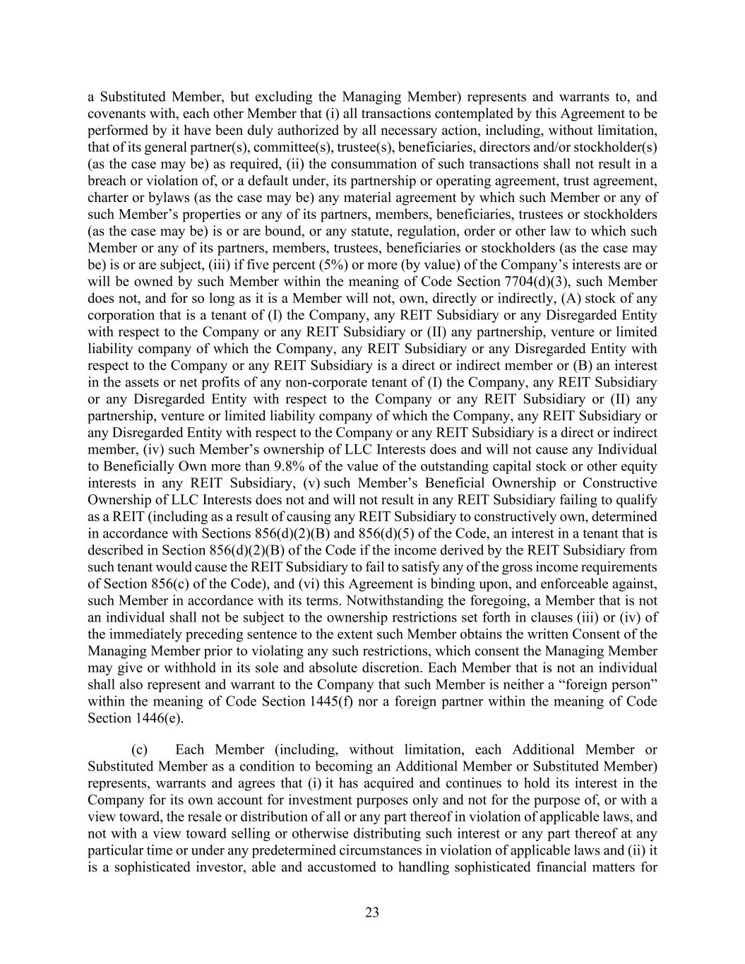 23 a Substituted Member, but excluding the Managing Member) represents and warrants to, and covenants with, each other Member that (i) all transactions contemplated by this Agreement to be performed by it have been duly authorized by all necessary action, including, without limitation, that of its general partner(s), committee(s), trustee(s), beneficiaries, directors and/or stockholder(s) (as the case may be) as required, (ii) the consummation of such transactions shall not result in a breach or violation of, or a default under, its partnership or operating agreement, trust agreement, charter or bylaws (as the case may be) any material agreement by which such Member or any of such Member’s properties or any of its partners, members, beneficiaries, trustees or stockholders (as the case may be) is or are bound, or any statute, regulation, order or other law to which such Member or any of its partners, members, trustees, beneficiaries or stockholders (as the case may be) is or are subject, (iii) if five percent (5%) or more (by value) of the Company’s interests are or will be owned by such Member within the meaning of Code Section 7704(d)(3), such Member does not, and for so long as it is a Member will not, own, directly or indirectly, (A) stock of any corporation that is a tenant of (I) the Company, any REIT Subsidiary or any Disregarded Entity with respect to the Company or any REIT Subsidiary or (II) any partnership, venture or limited liability company of which the Company, any REIT Subsidiary or any Disregarded Entity with respect to the Company or any REIT Subsidiary is a direct or indirect member or (B) an interest in the assets or net profits of any non-corporate tenant of (I) the Company, any REIT Subsidiary or any Disregarded Entity with respect to the Company or any REIT Subsidiary or (II) any partnership, venture or limited liability company of which the Company, any REIT Subsidiary or any Disregarded Entity with respect to the Company or any REIT Subsidiary is a direct or indirect member, (iv) such Member’s ownership of LLC Interests does and will not cause any Individual to Beneficially Own more than 9.8% of the value of the outstanding capital stock or other equity interests in any REIT Subsidiary, (v) such Member’s Beneficial Ownership or Constructive Ownership of LLC Interests does not and will not result in any REIT Subsidiary failing to qualify as a REIT (including as a result of causing any REIT Subsidiary to constructively own, determined in accordance with Sections 856(d)(2)(B) and 856(d)(5) of the Code, an interest in a tenant that is described in Section 856(d)(2)(B) of the Code if the income derived by the REIT Subsidiary from such tenant would cause the REIT Subsidiary to fail to satisfy any of the gross income requirements of Section 856(c) of the Code), and (vi) this Agreement is binding upon, and enforceable against, such Member in accordance with its terms. Notwithstanding the foregoing, a Member that is not an individual shall not be subject to the ownership restrictions set forth in clauses (iii) or (iv) of the immediately preceding sentence to the extent such Member obtains the written Consent of the Managing Member prior to violating any such restrictions, which consent the Managing Member may give or withhold in its sole and absolute discretion. Each Member that is not an individual shall also represent and warrant to the Company that such Member is neither a “foreign person” within the meaning of Code Section 1445(f) nor a foreign partner within the meaning of Code Section 1446(e). (c) Each Member (including, without limitation, each Additional Member or Substituted Member as a condition to becoming an Additional Member or Substituted Member) represents, warrants and agrees that (i) it has acquired and continues to hold its interest in the Company for its own account for investment purposes only and not for the purpose of, or with a view toward, the resale or distribution of all or any part thereof in violation of applicable laws, and not with a view toward selling or otherwise distributing such interest or any part thereof at any particular time or under any predetermined circumstances in violation of applicable laws and (ii) it is a sophisticated investor, able and accustomed to handling sophisticated financial matters for